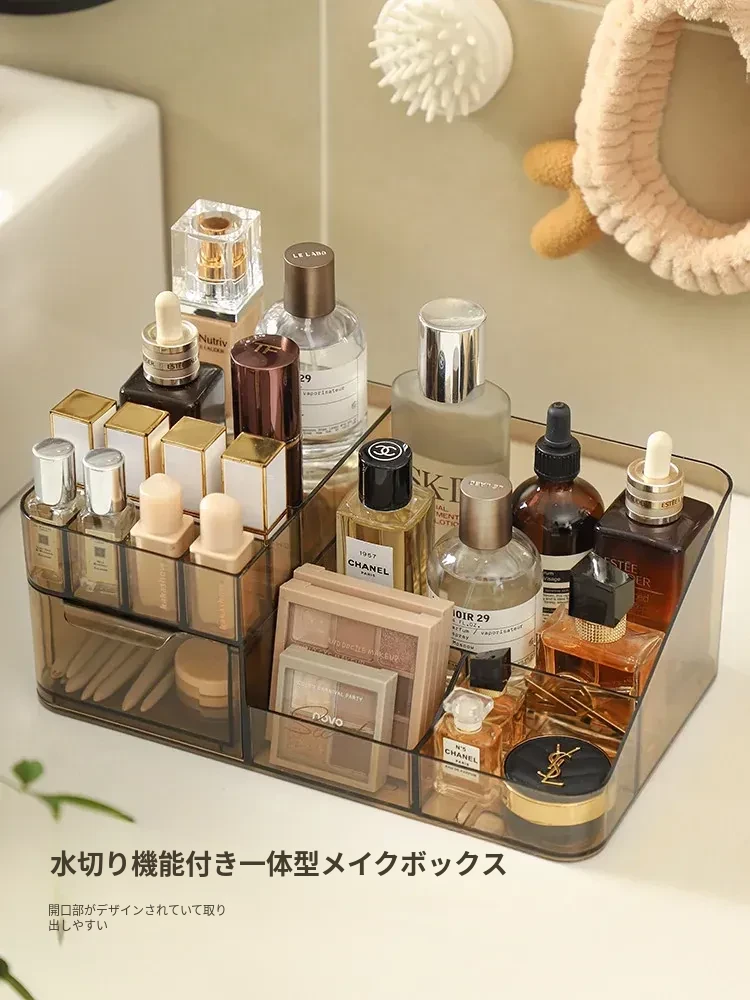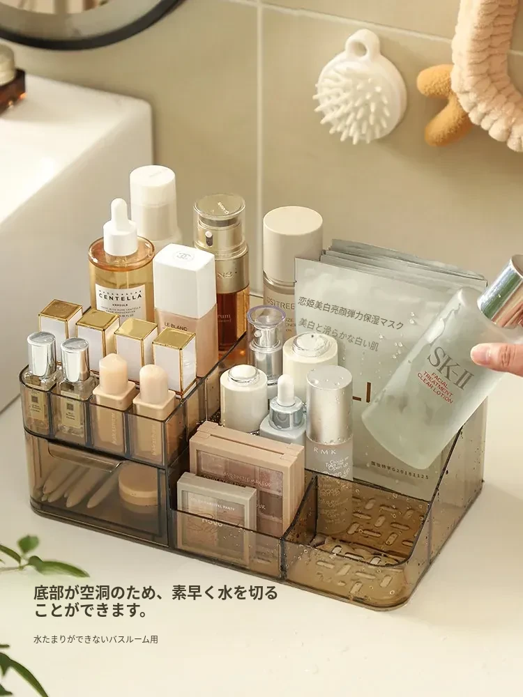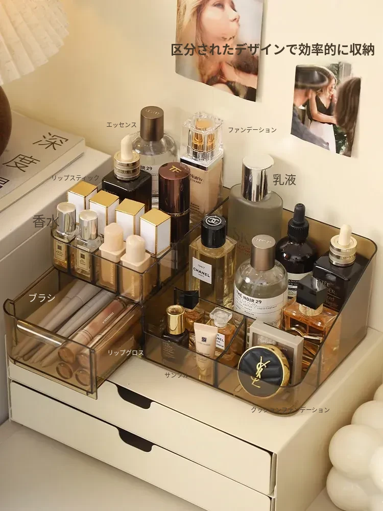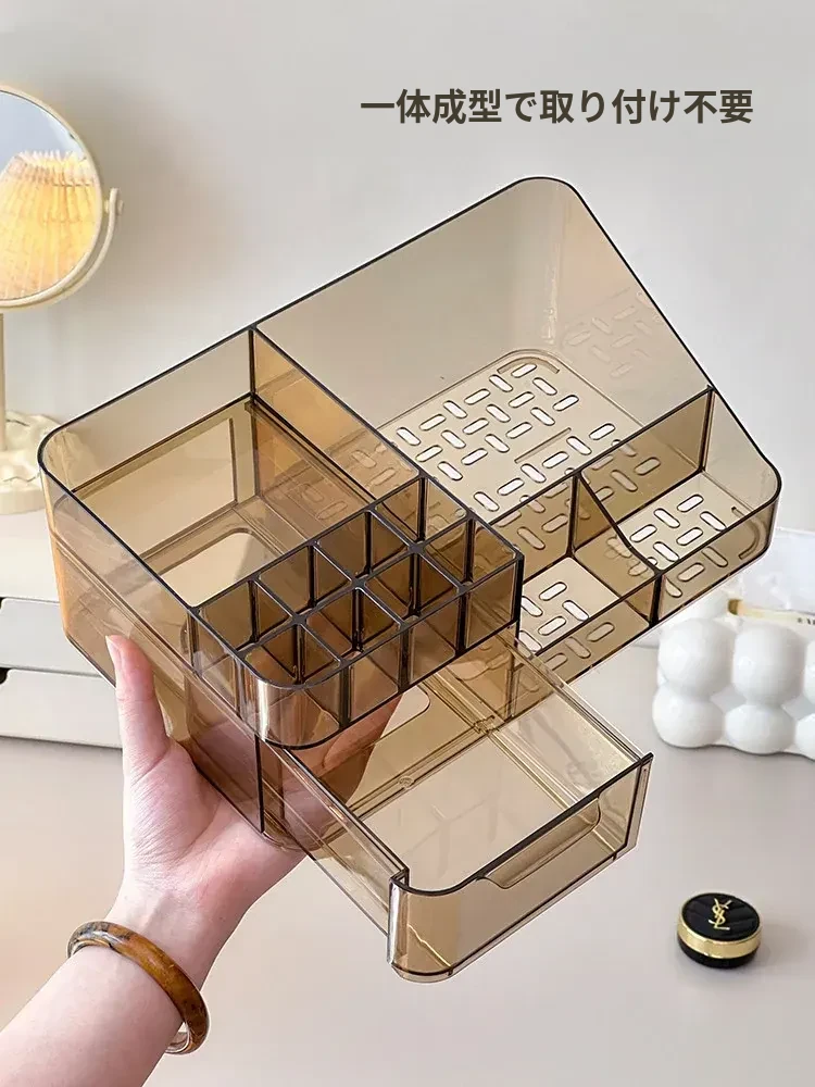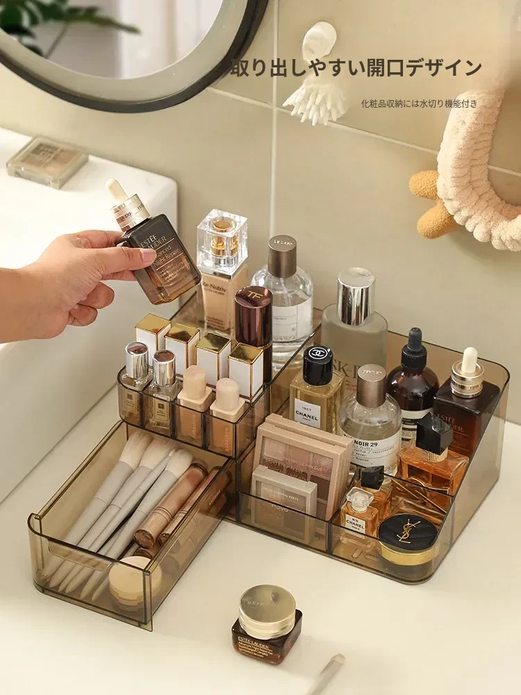 デスクトップ化粧品収納ボックス - 高級感あふれるコスメティックオーガナイザー!アクリル製の引き出し付きで、メイクアップ台やスキンケアアイテムをスタイリッシュに整理。美しさを引き立てる必須アイテム!