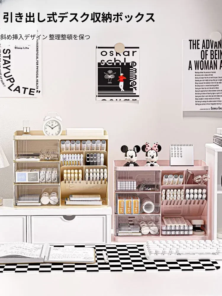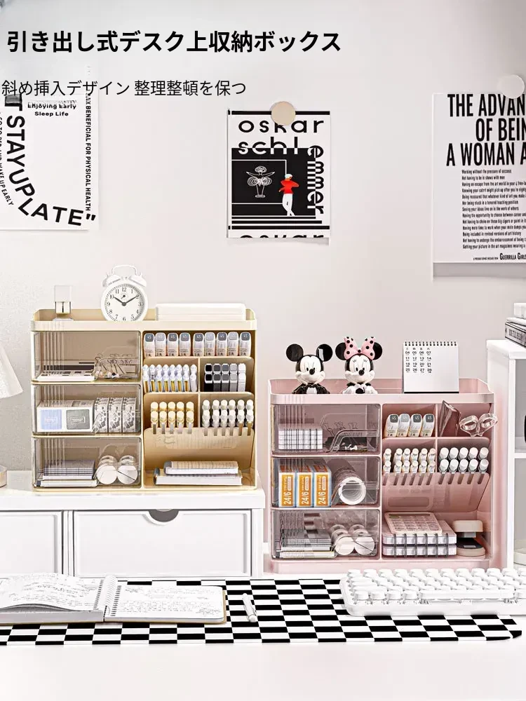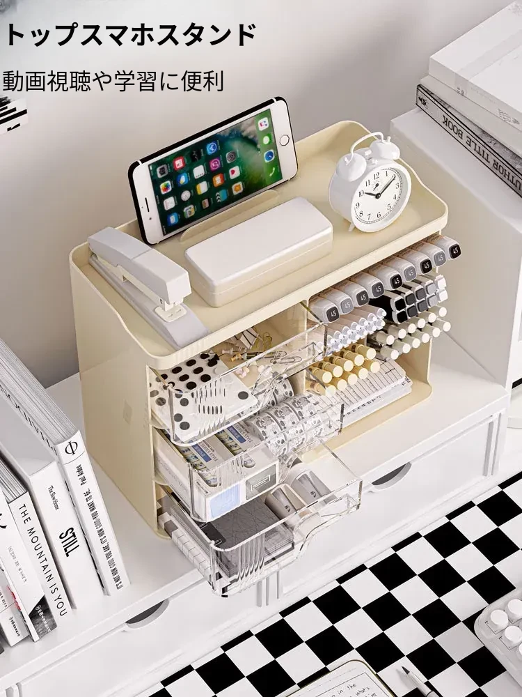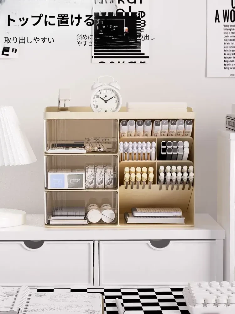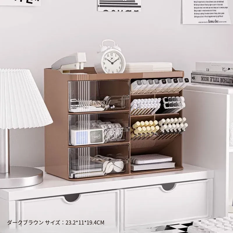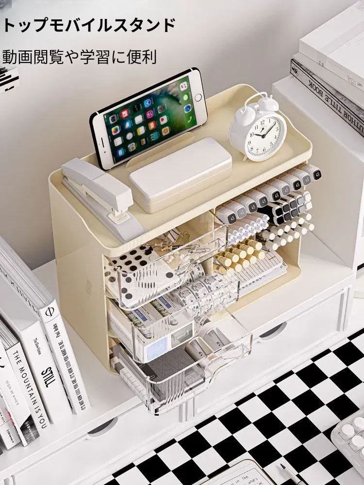 斜め差し込み式ペン立て引き出し付き!大容量学生文具収納ボックス、寮のデスクにぴったりな多機能整理ラック!すっきりとしたデザインで、勉強スペースをおしゃれに整頓!