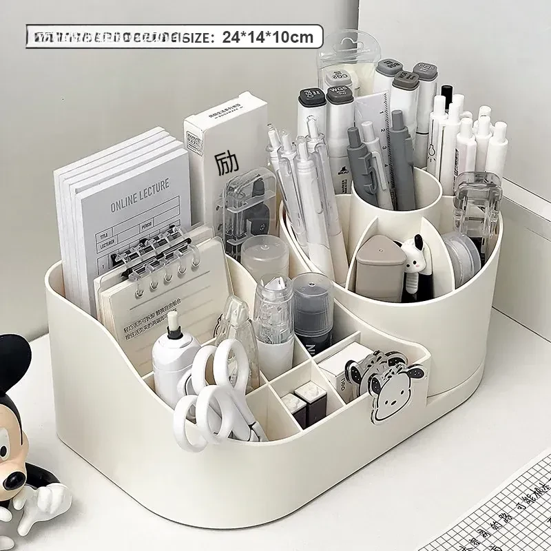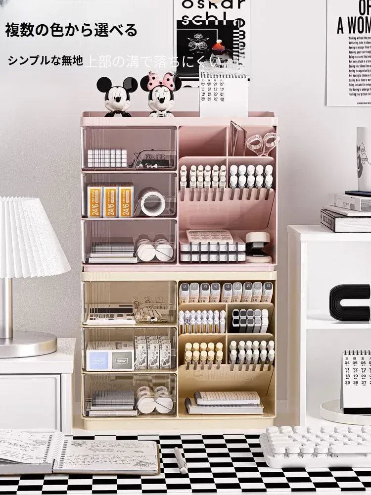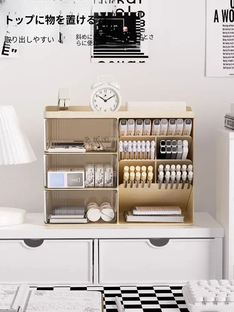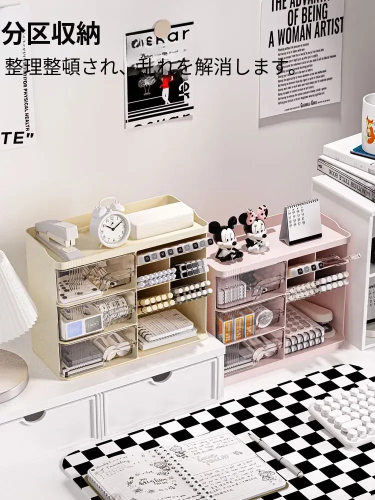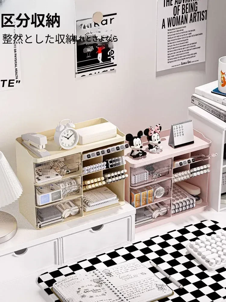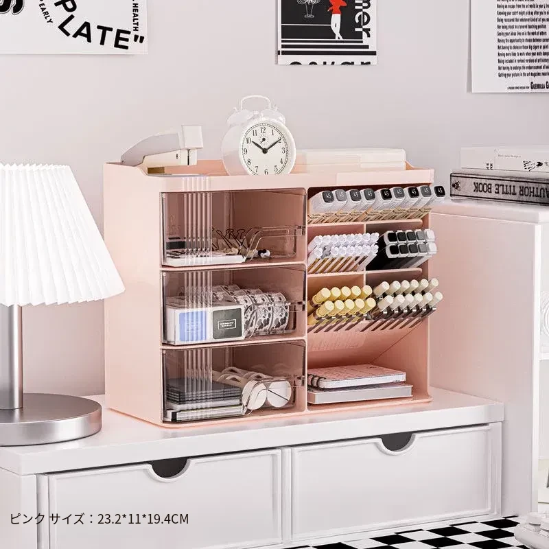 斜め差し込み式ペン立て引き出し付き!大容量学生文具収納ボックス、寮のデスクにぴったりな多機能整理ラック!すっきりとしたデザインで、勉強スペースをおしゃれに整頓!