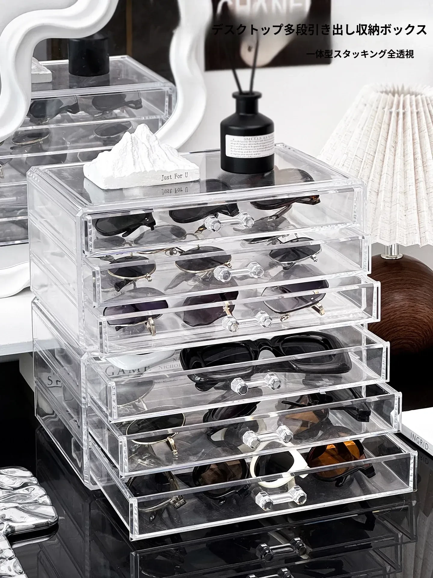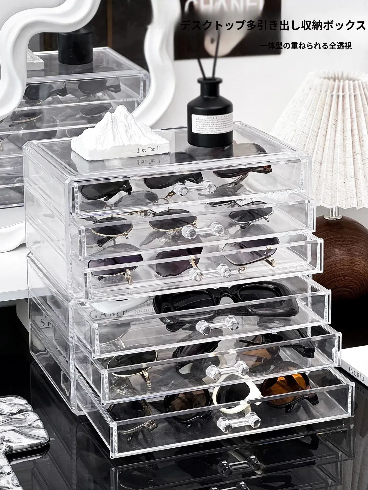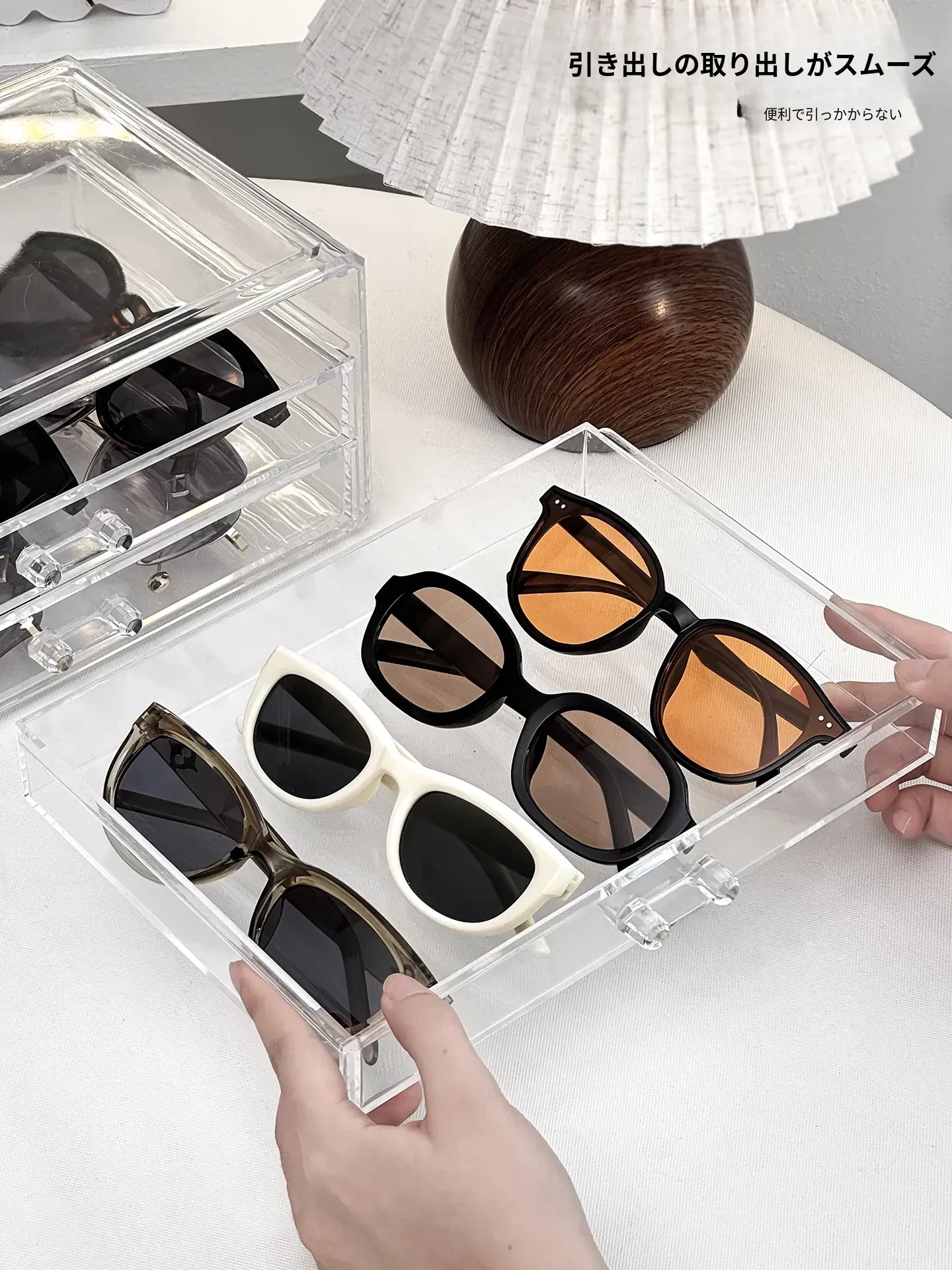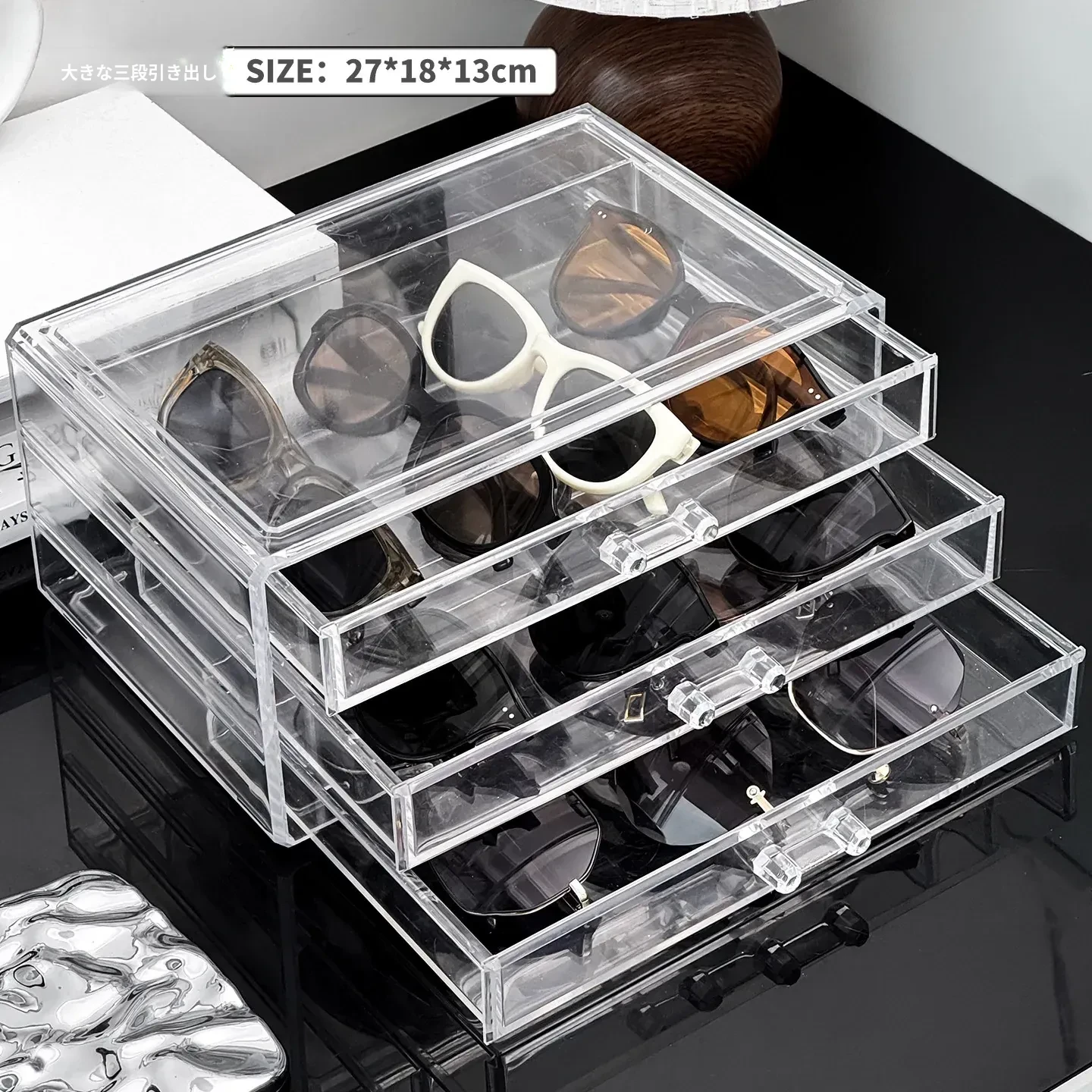 多層アクリル製サングラス収納ボックス - 引き出し式デザインで、デスク上のスペースを有効活用!防塵・耐衝撃で、大切なサングラスをしっかり守ります。おしゃれなディスプレイにも最適!