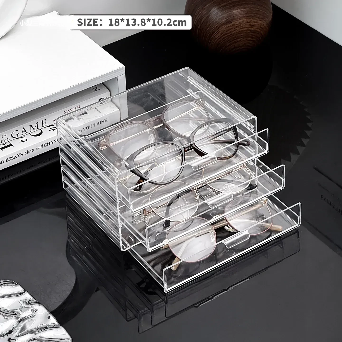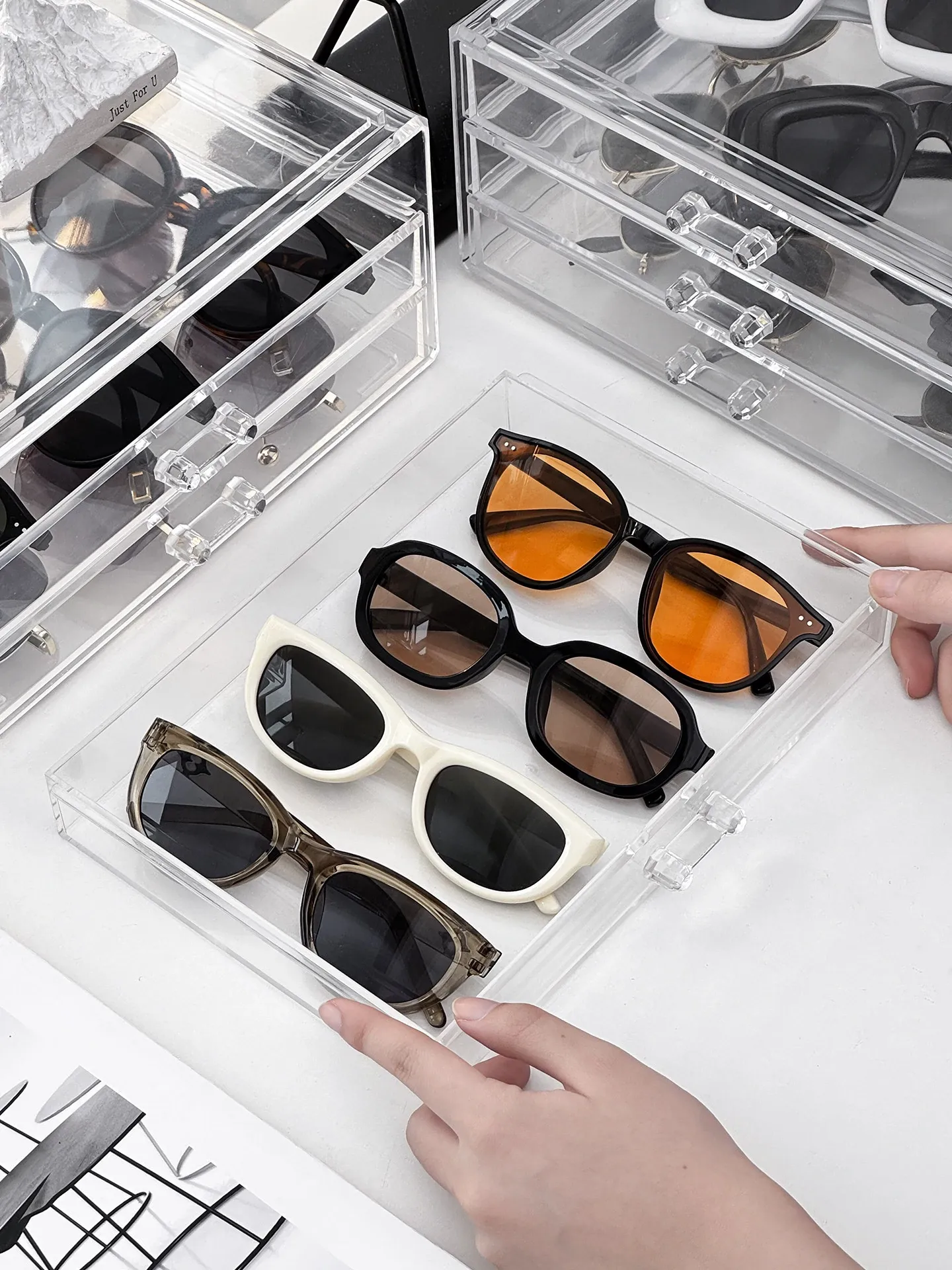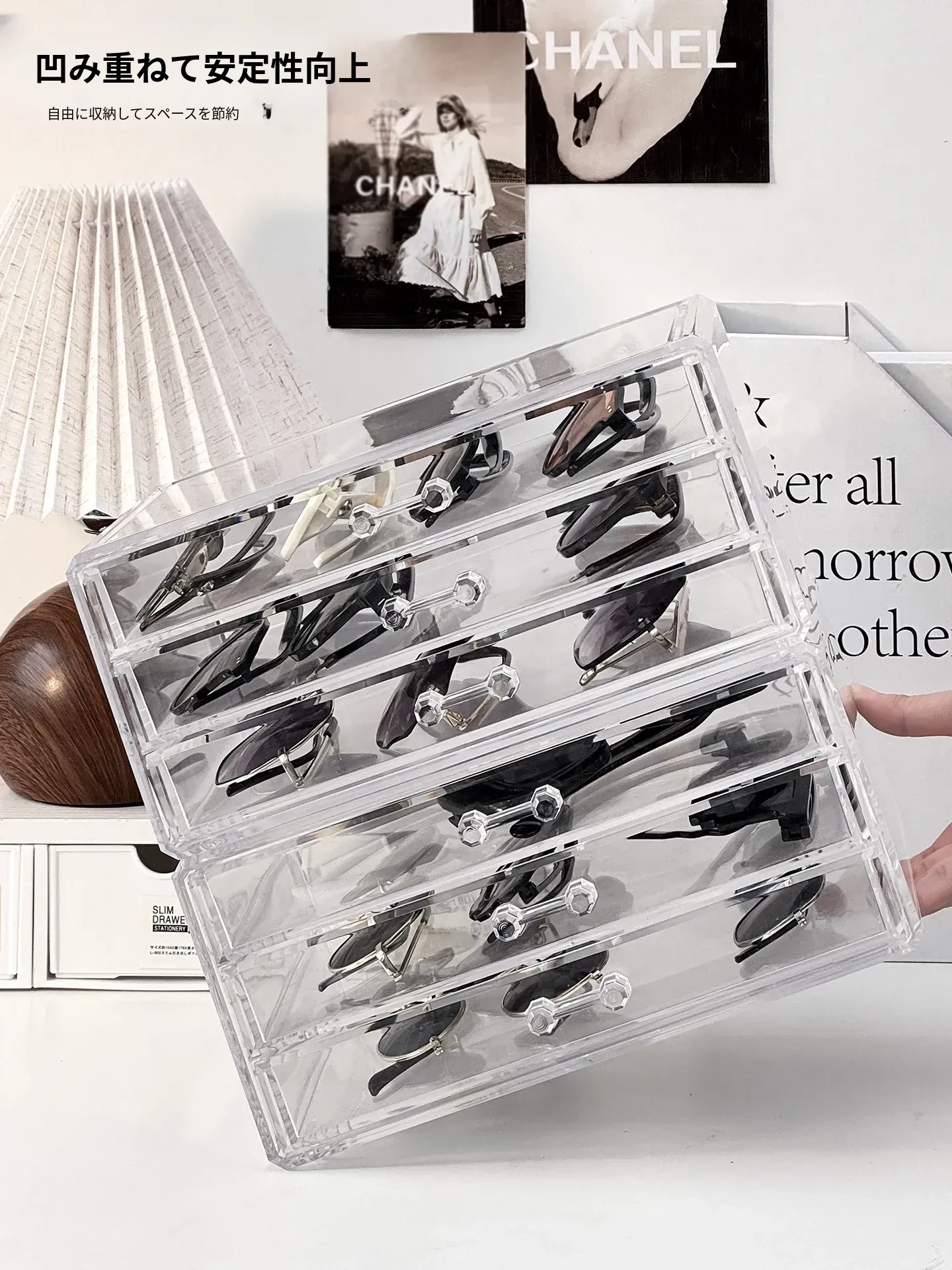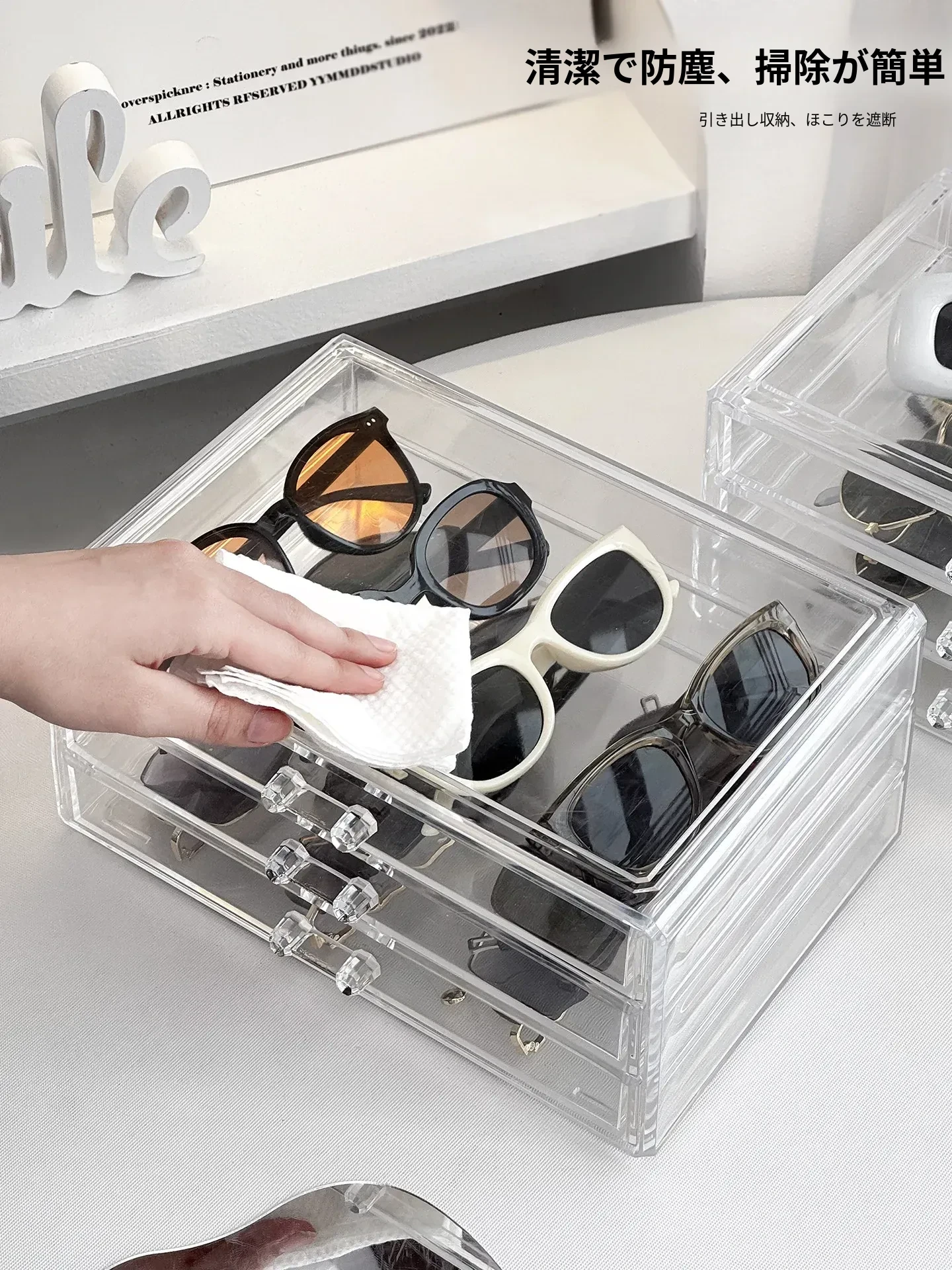 多層アクリル製サングラス収納ボックス - 引き出し式デザインで、デスク上のスペースを有効活用!防塵・耐衝撃で、大切なサングラスをしっかり守ります。おしゃれなディスプレイにも最適!