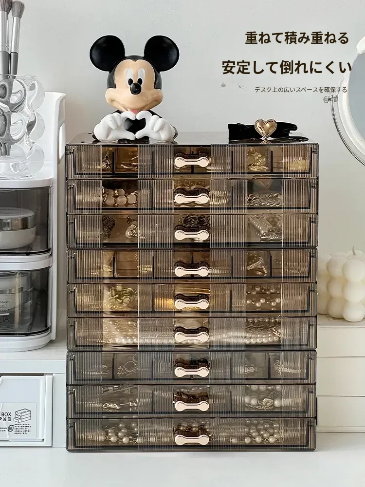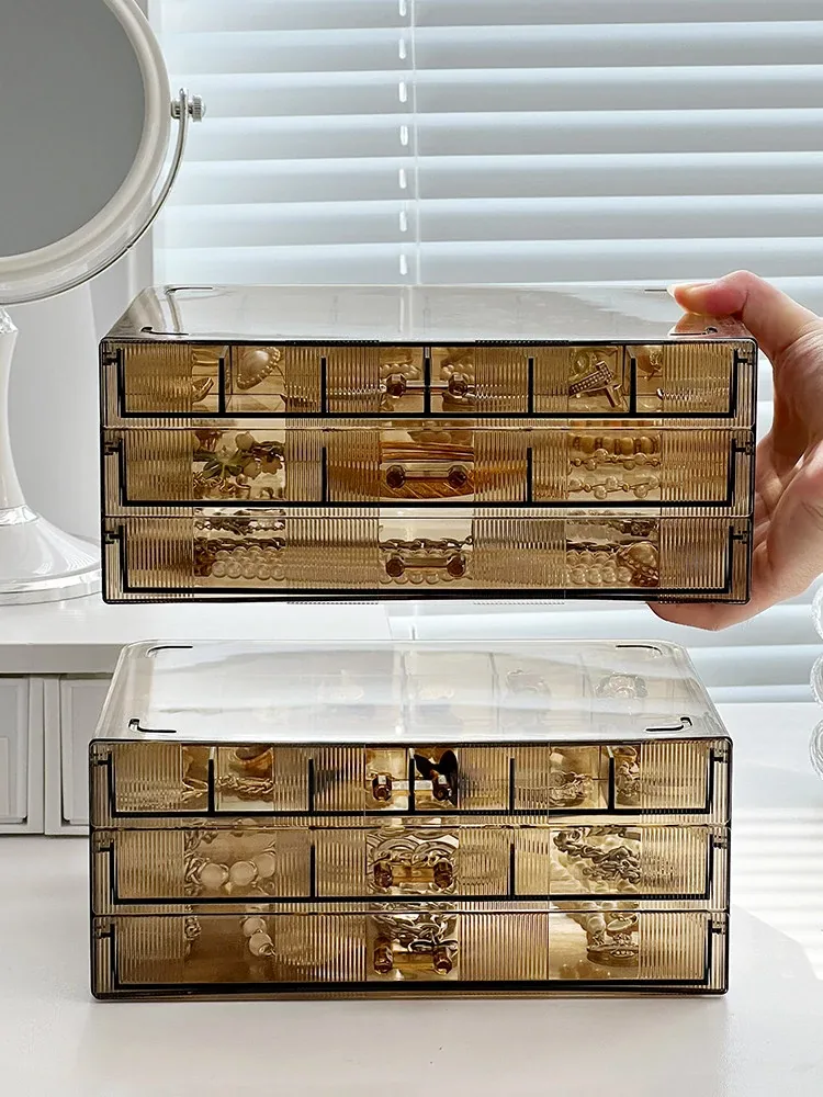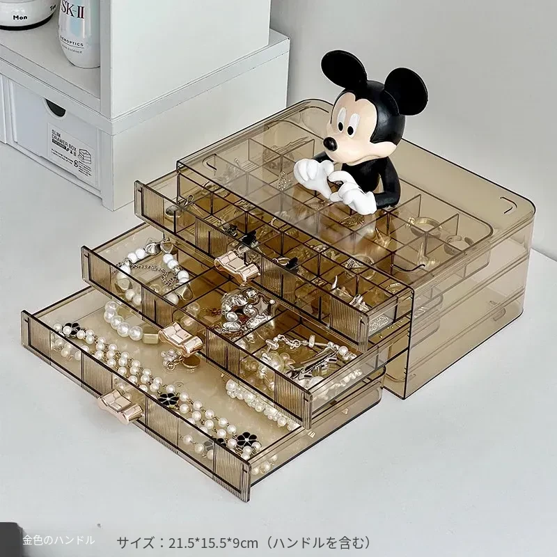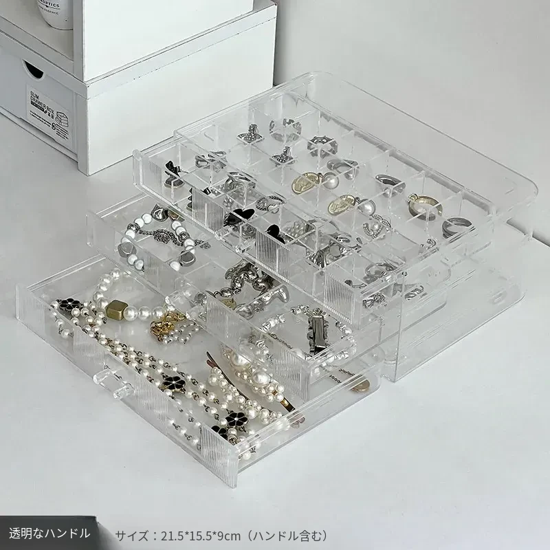 【クリア色-ゴールドハンドル】三段引き出し式ジュエリーボックス