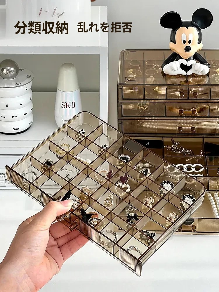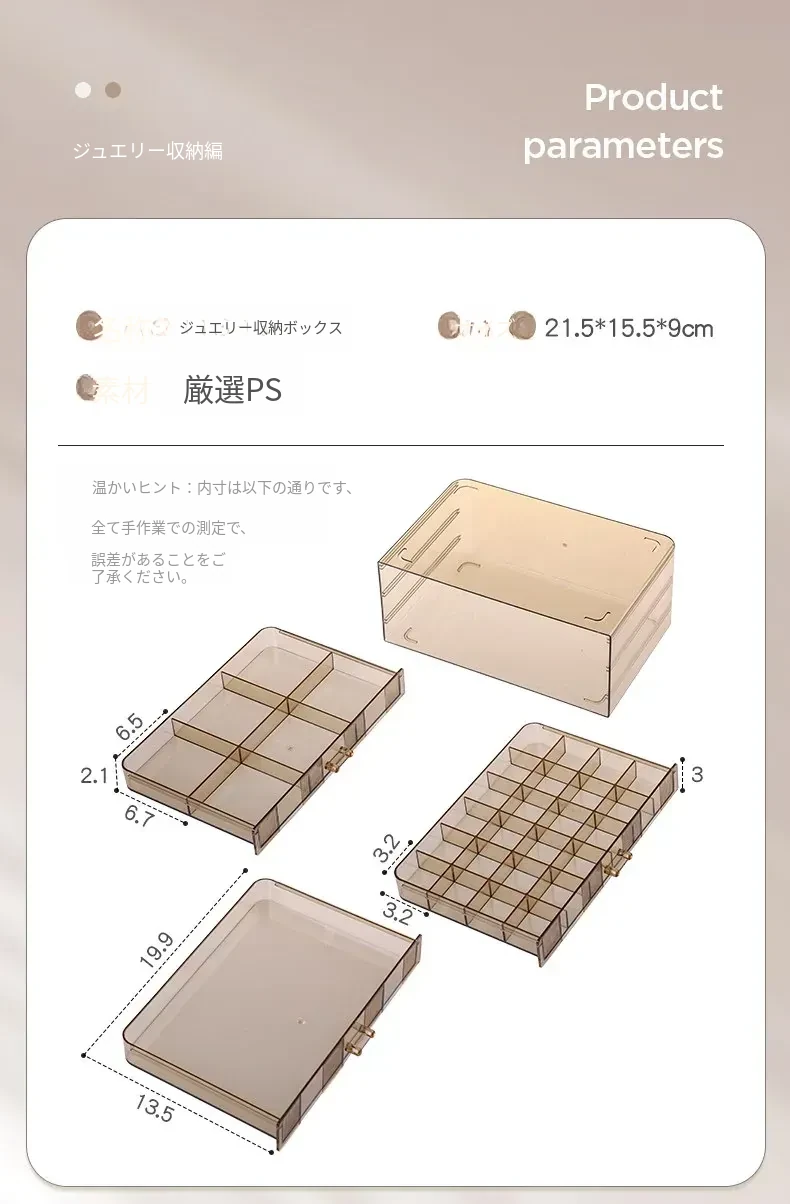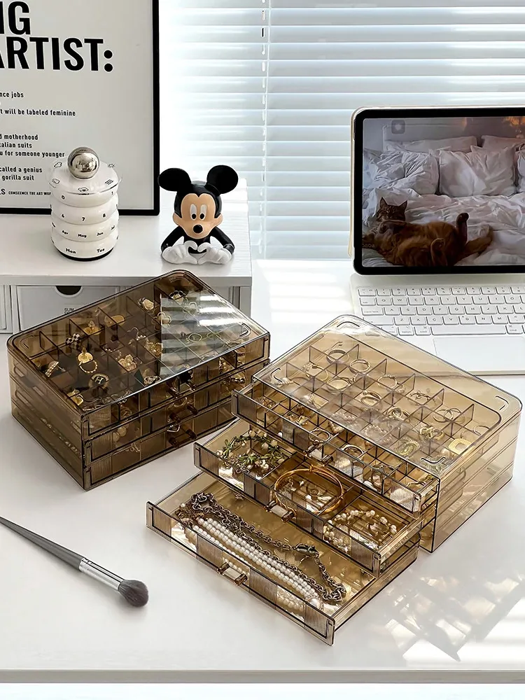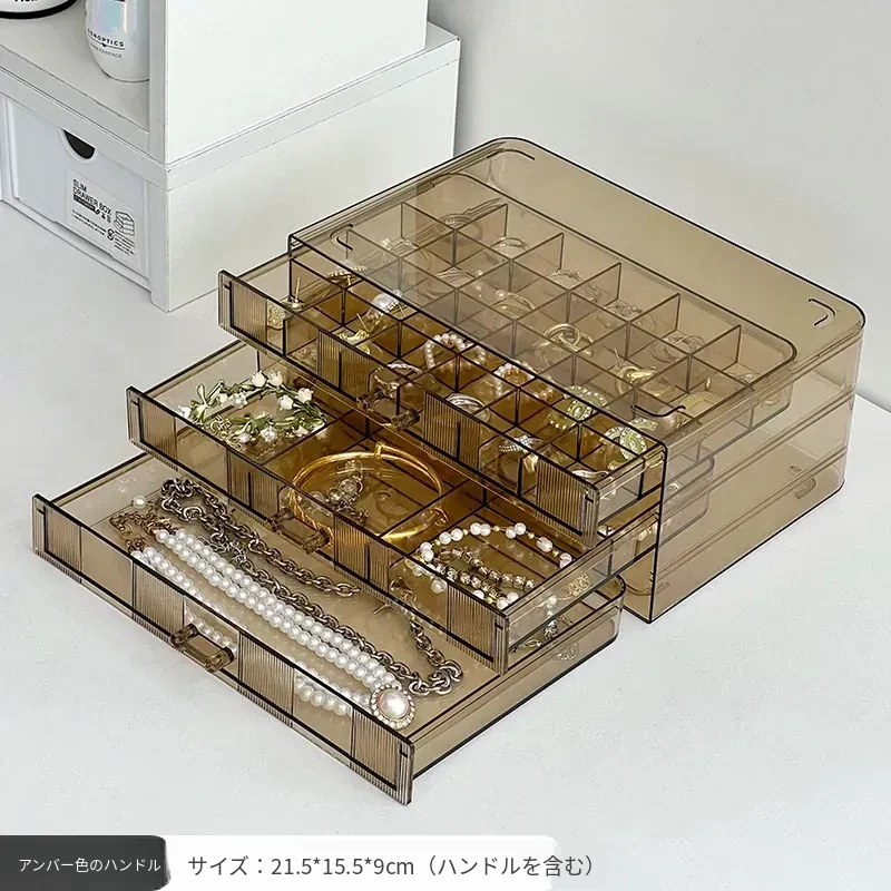【アンバー色-72格】三段引き出し式ジュエリーボックス