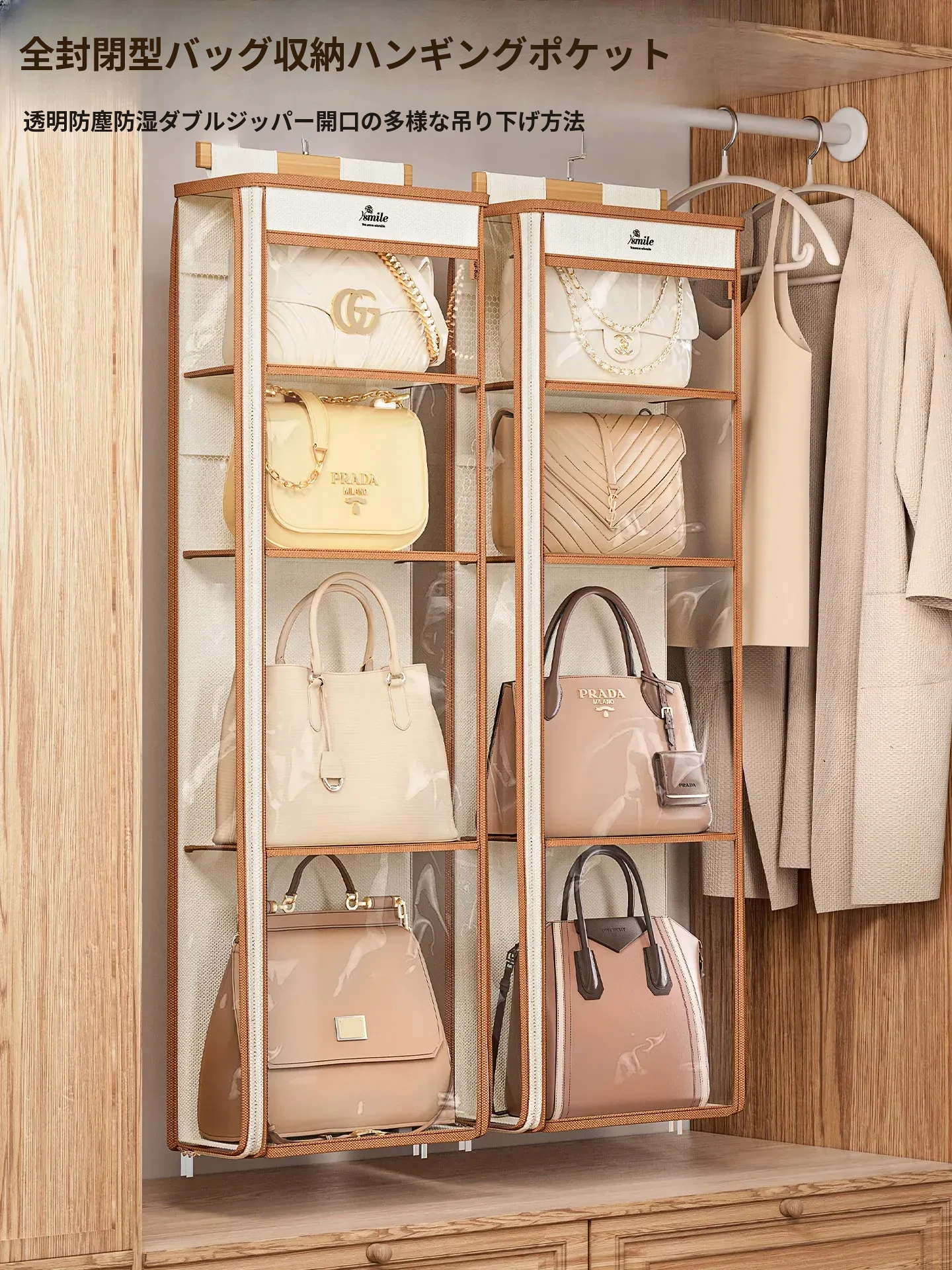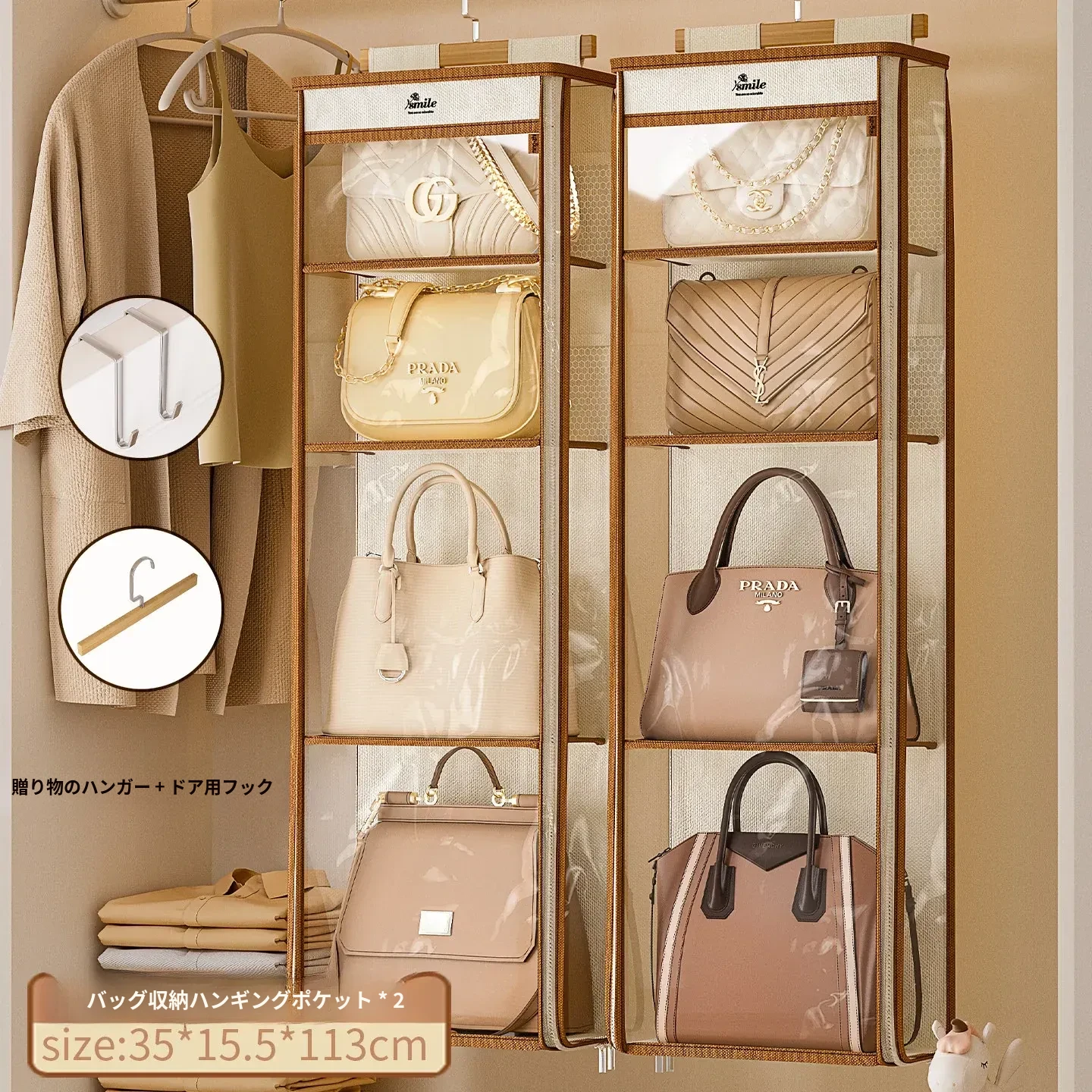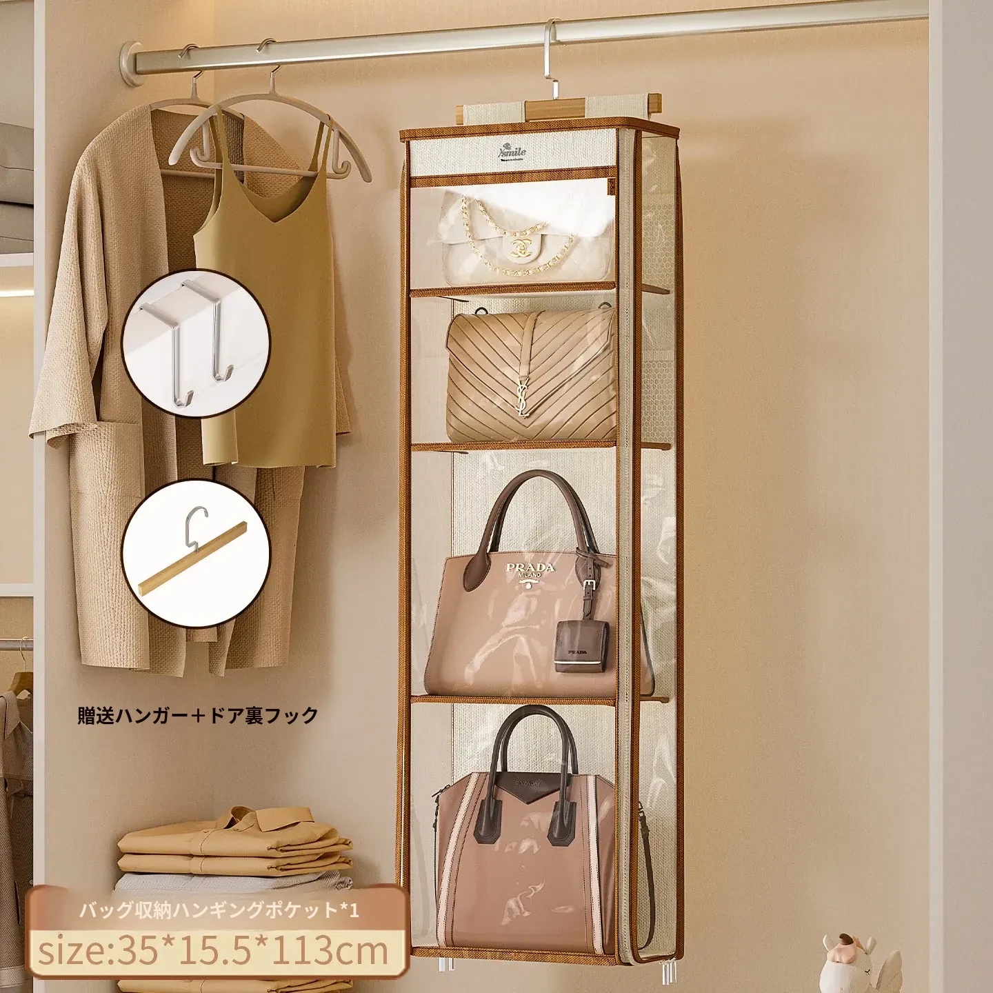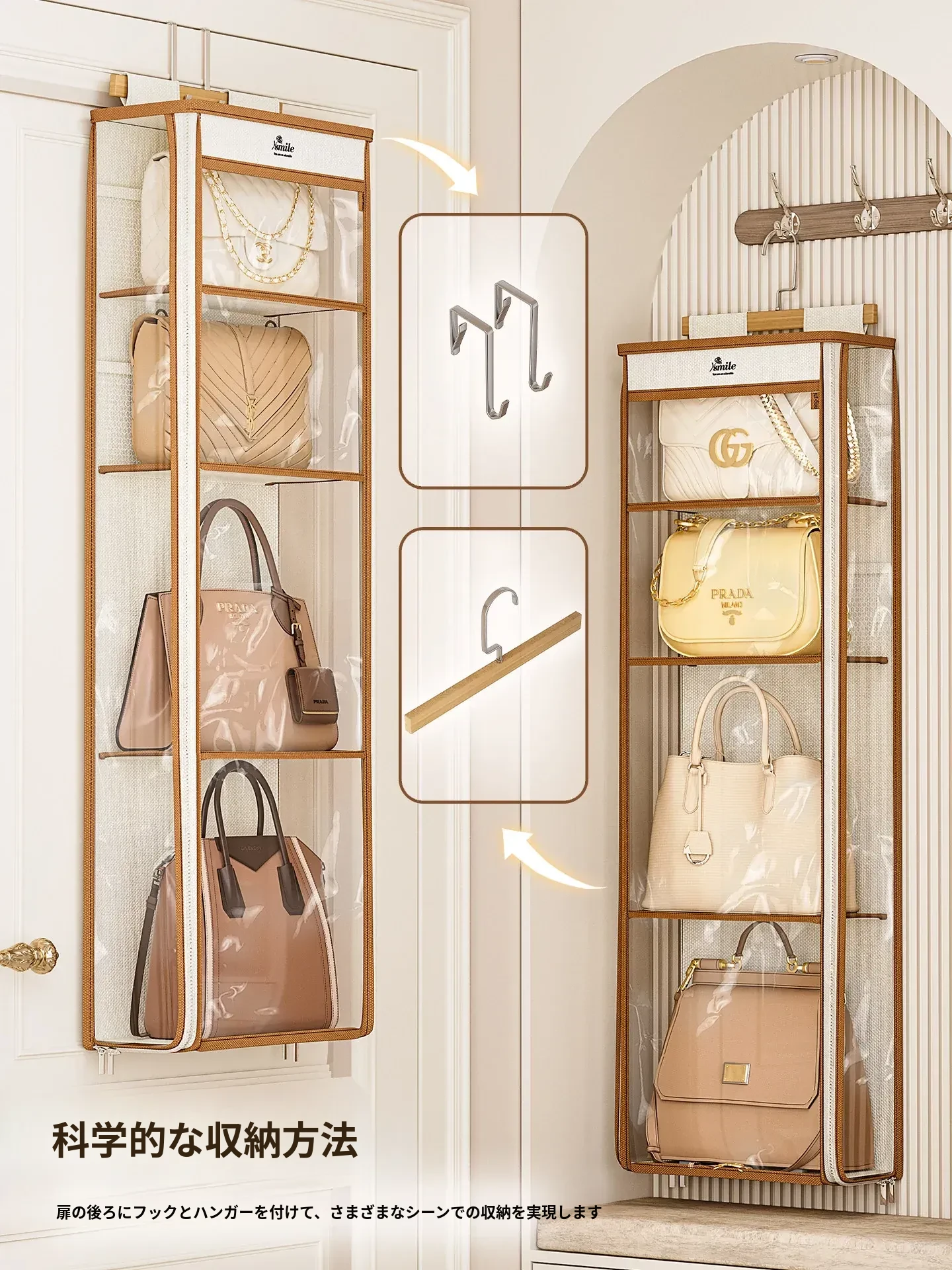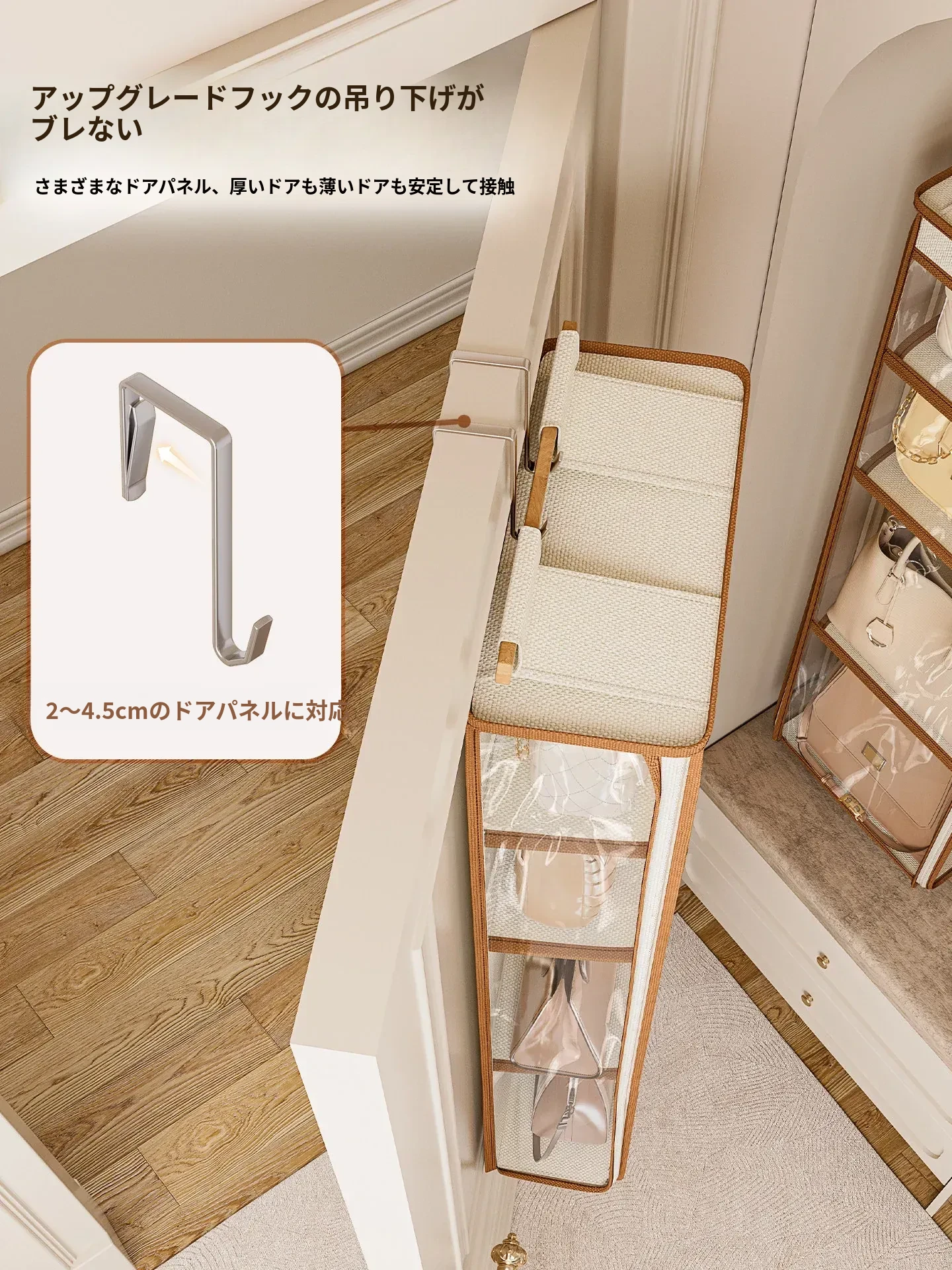 ドア裏収納バッグハンガー - クローゼットの防塵・抗圧機能付き!スペースを有効活用し、おしゃれにバッグをディスプレイできるファブリック製ウォールハンガー。お部屋をスッキリ整理整頓!