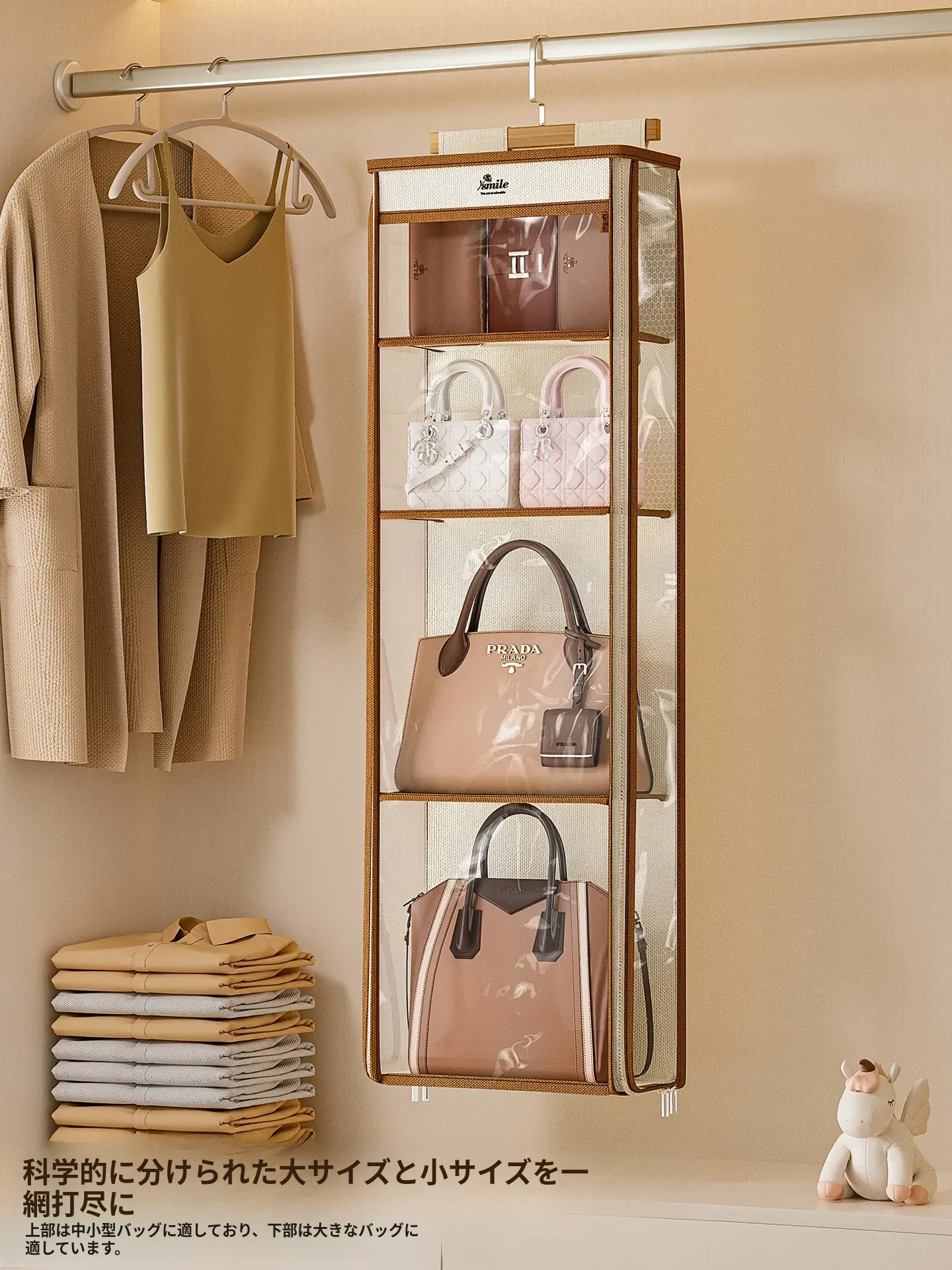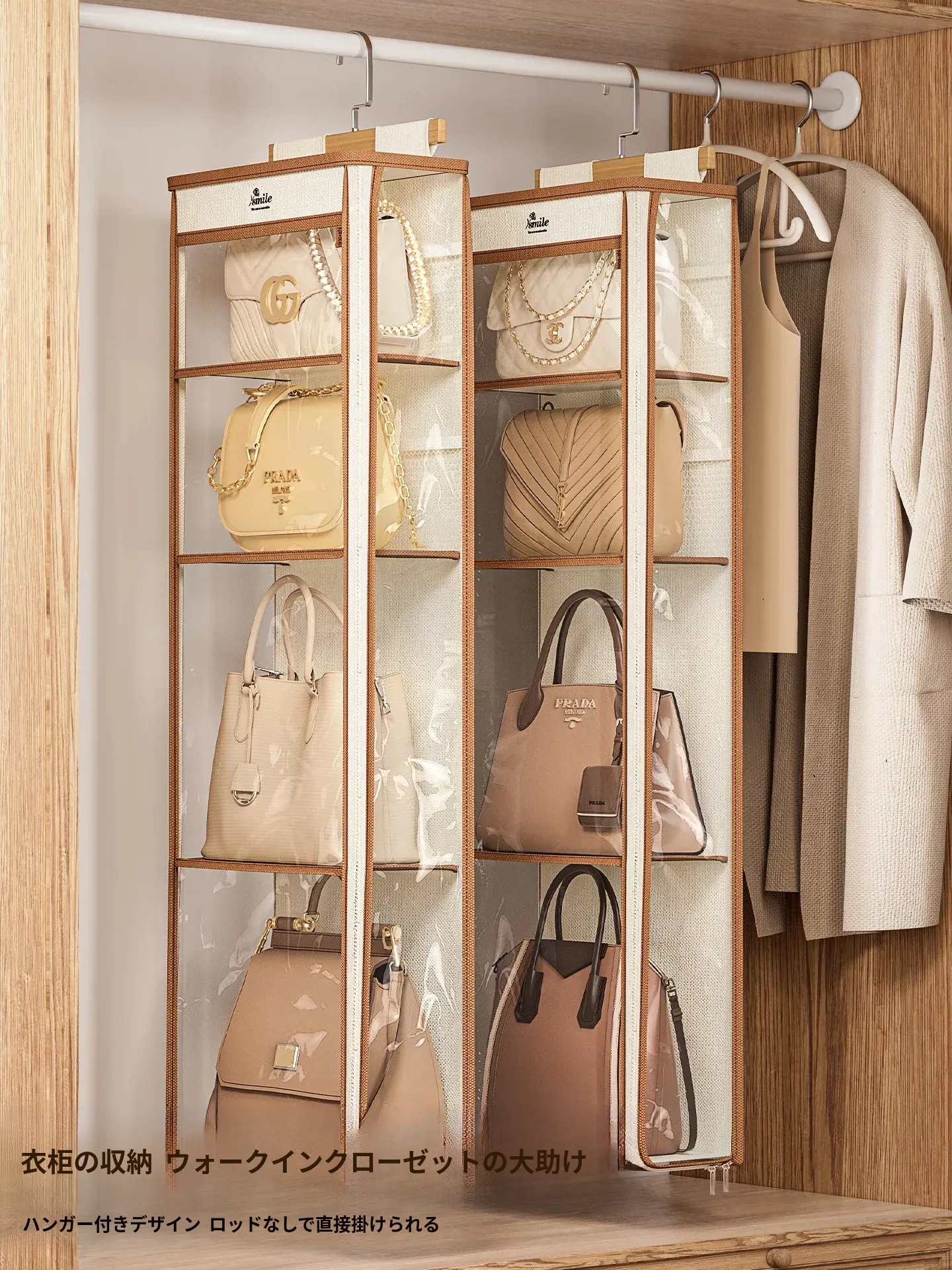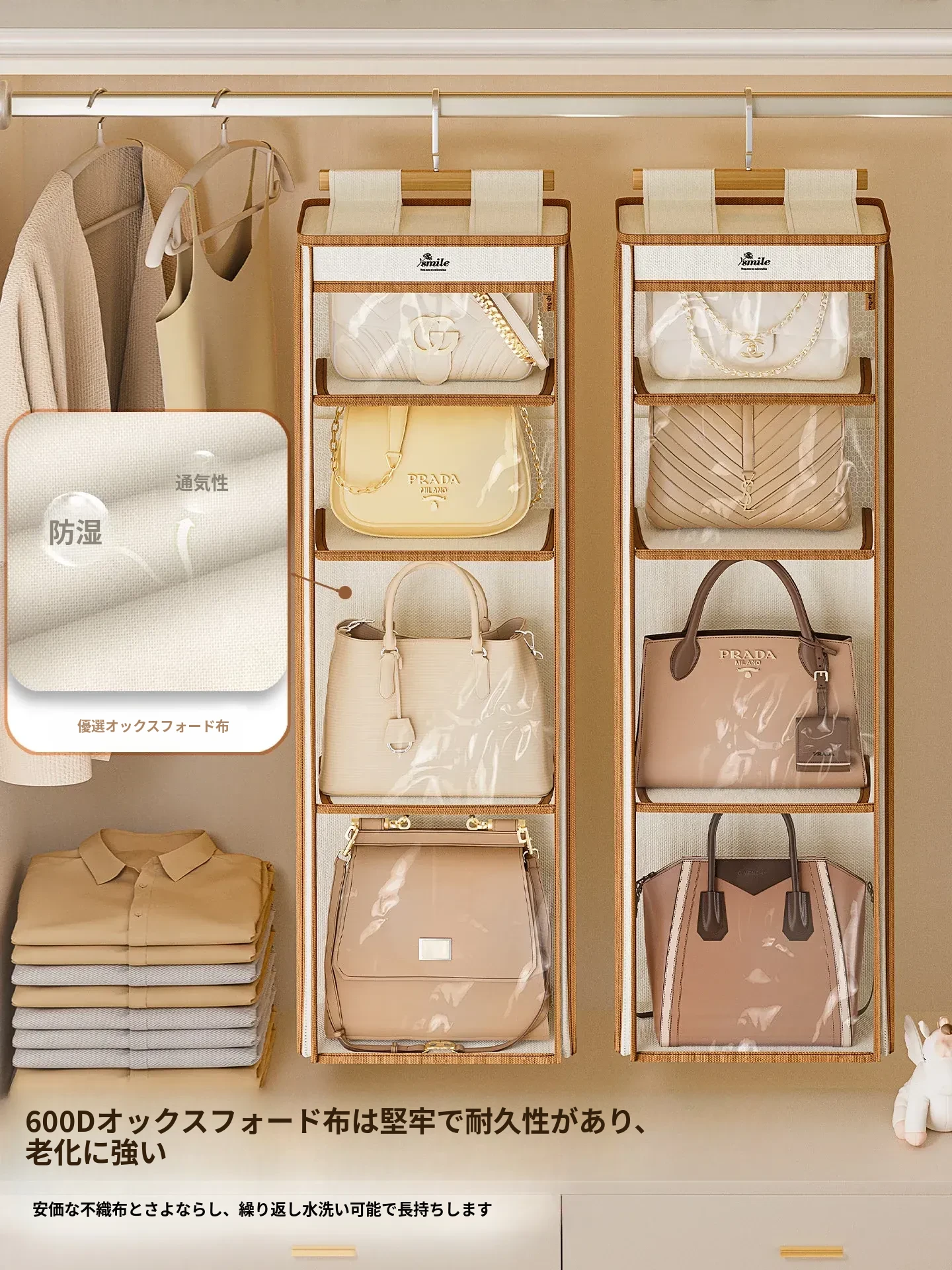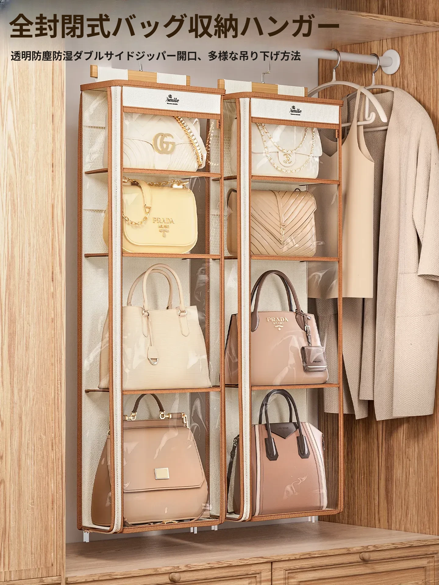 ドア裏収納バッグハンガー - クローゼットの防塵・抗圧機能付き!スペースを有効活用し、おしゃれにバッグをディスプレイできるファブリック製ウォールハンガー。お部屋をスッキリ整理整頓!