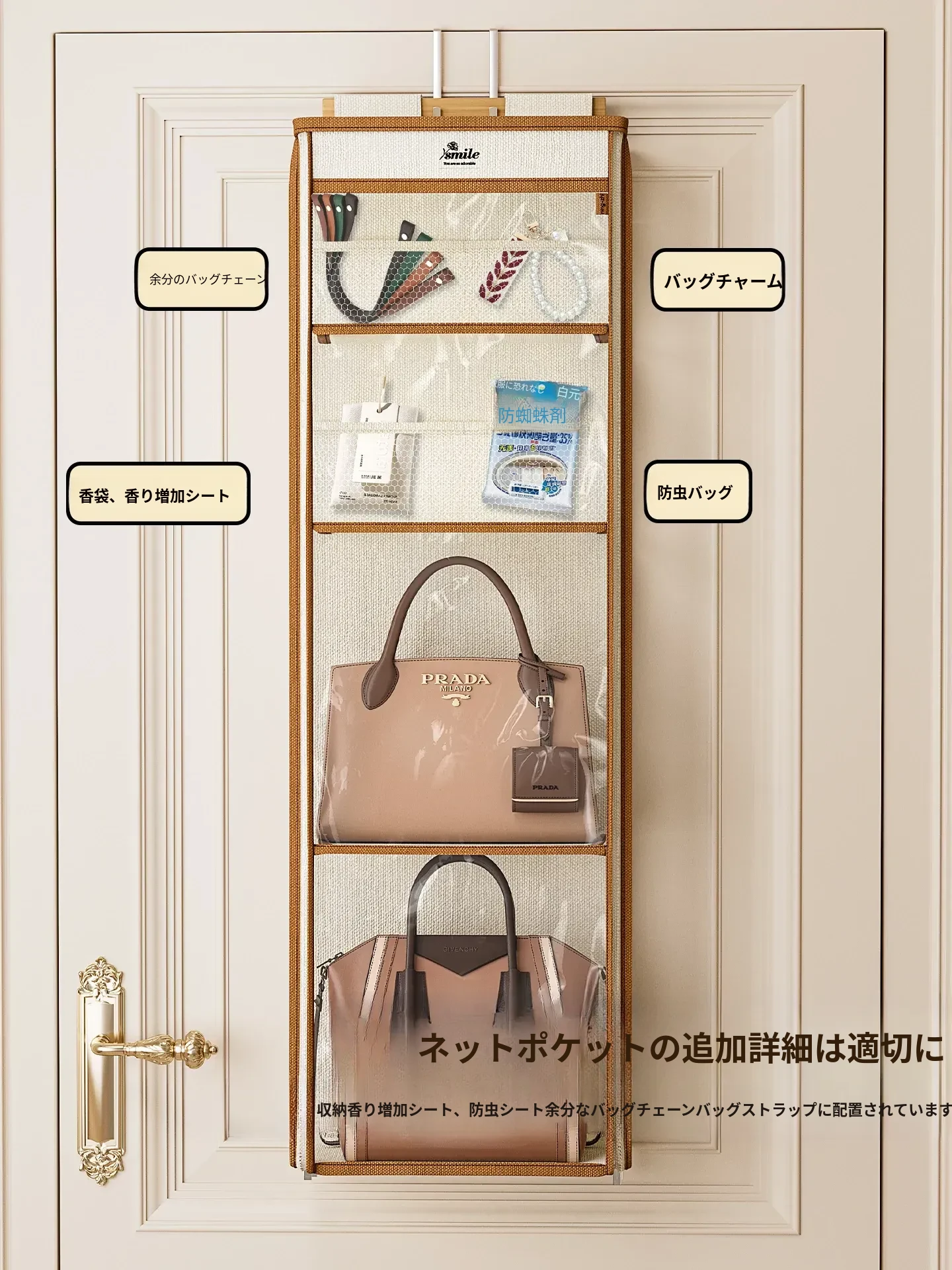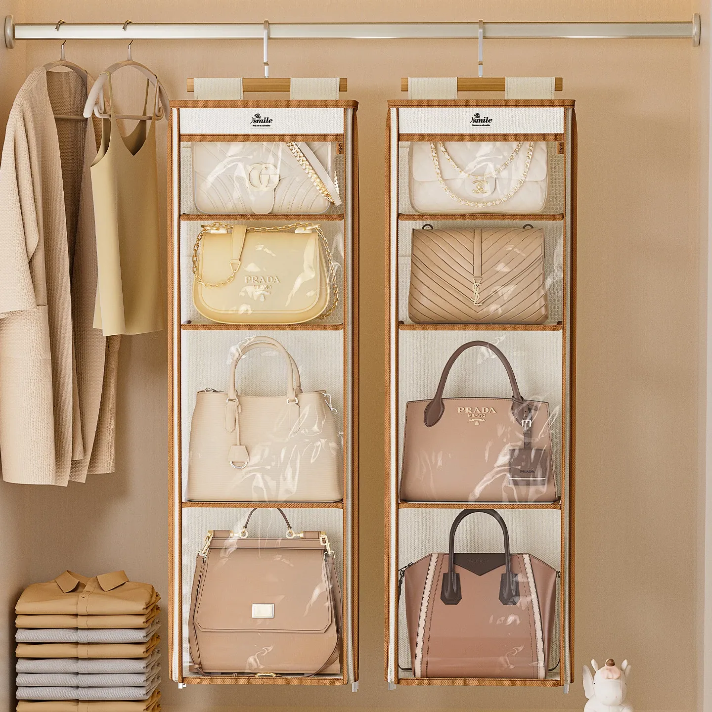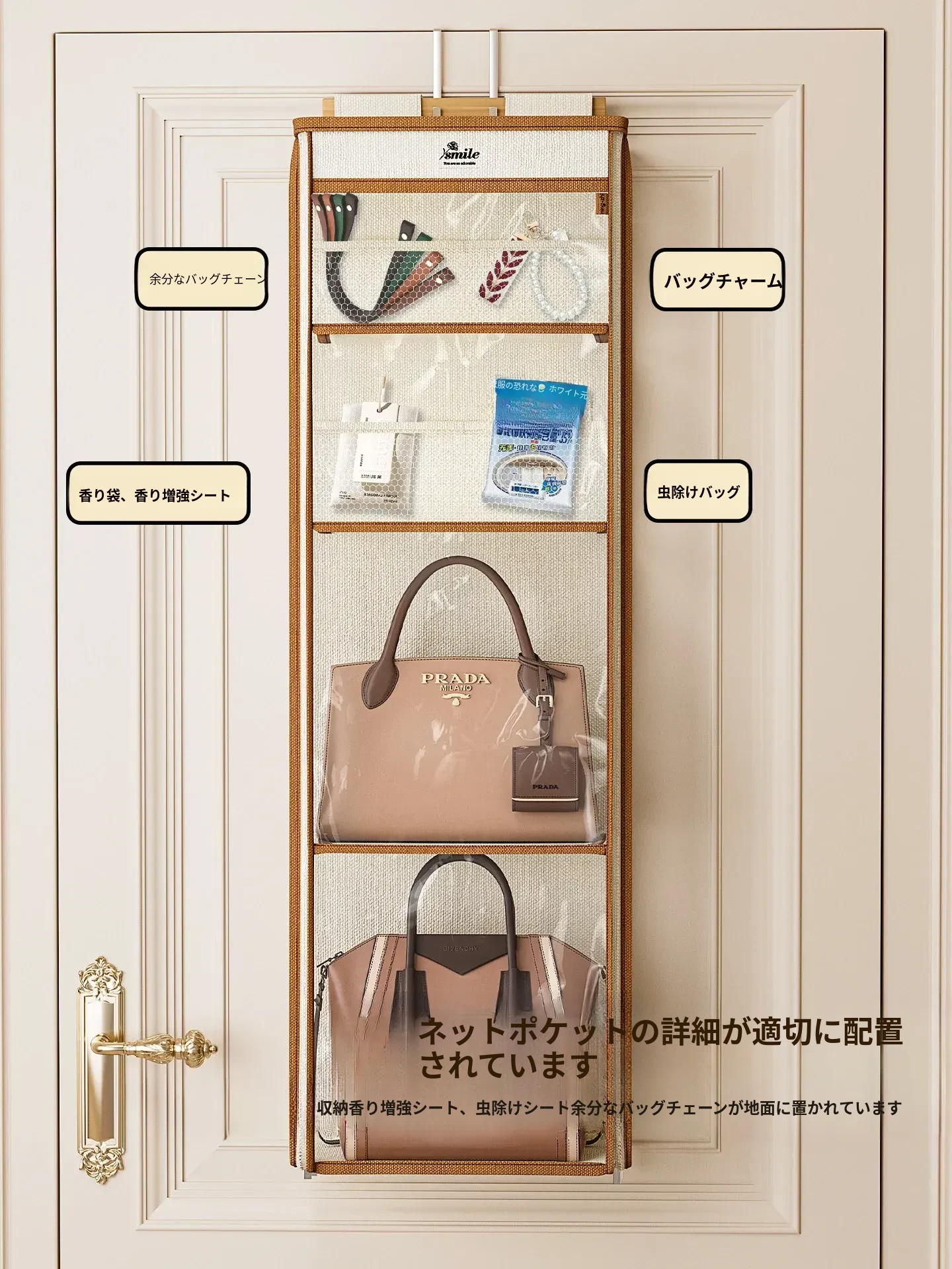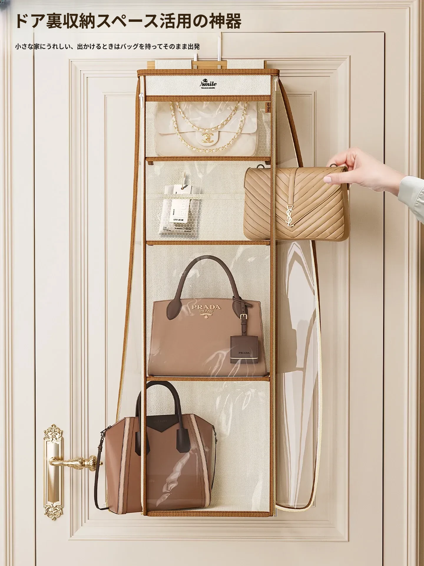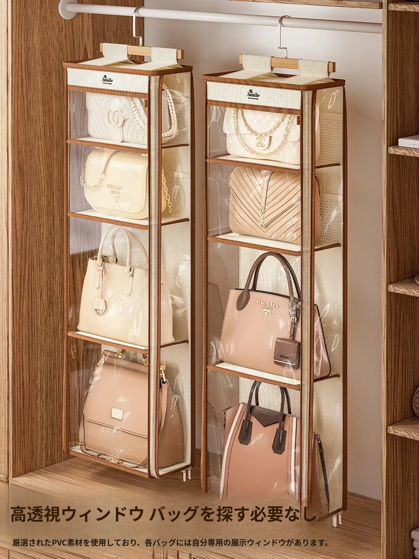 ドア裏収納バッグハンガー - クローゼットの防塵・抗圧機能付き!スペースを有効活用し、おしゃれにバッグをディスプレイできるファブリック製ウォールハンガー。お部屋をスッキリ整理整頓!