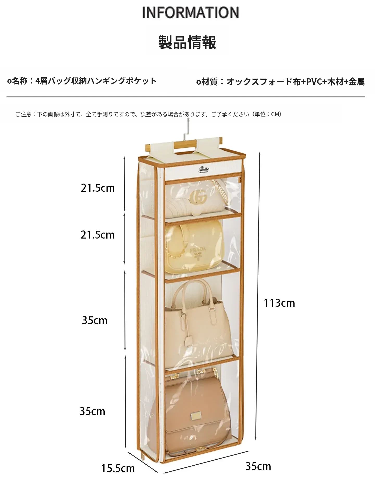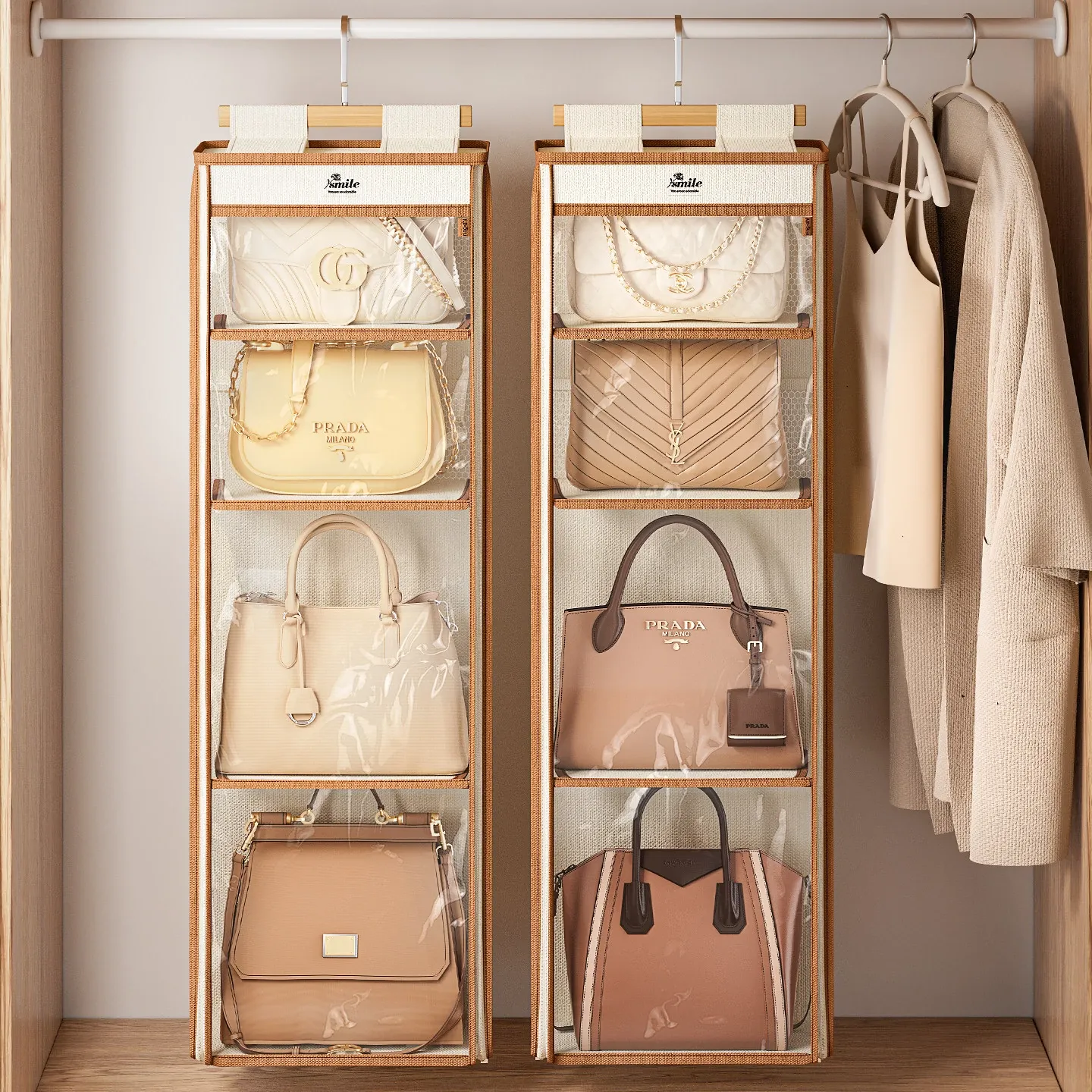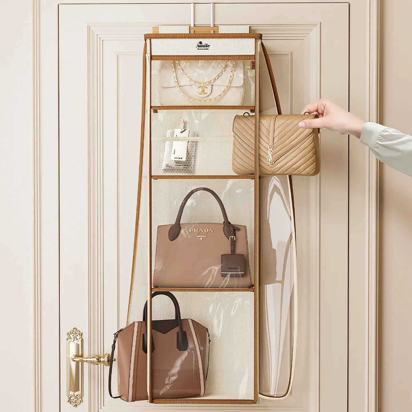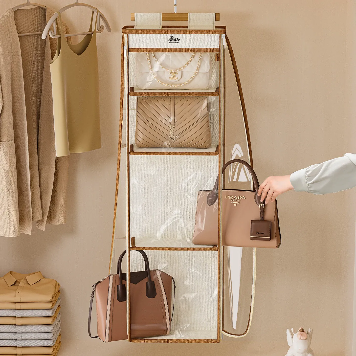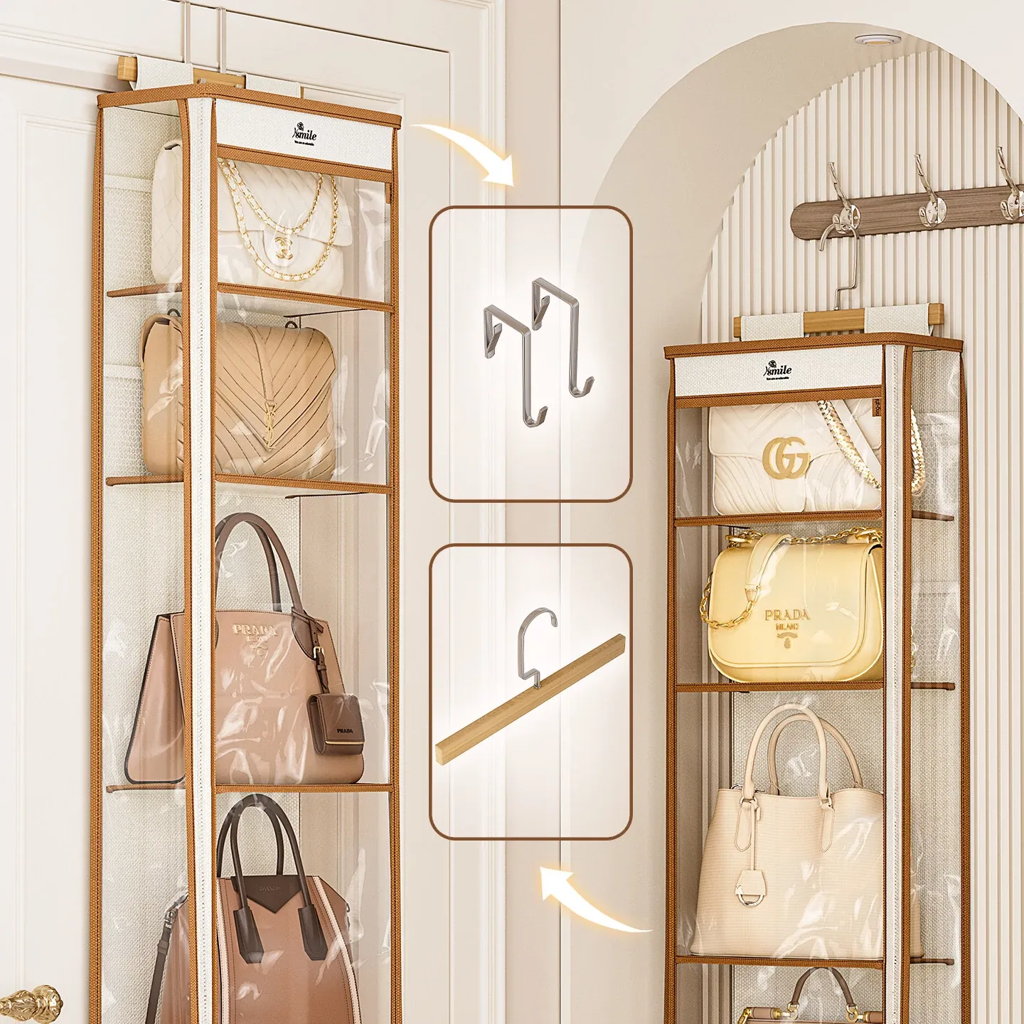 ドア裏収納バッグハンガー - クローゼットの防塵・抗圧機能付き!スペースを有効活用し、おしゃれにバッグをディスプレイできるファブリック製ウォールハンガー。お部屋をスッキリ整理整頓!