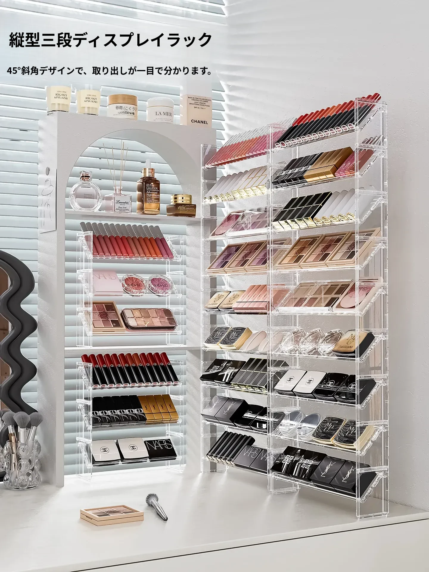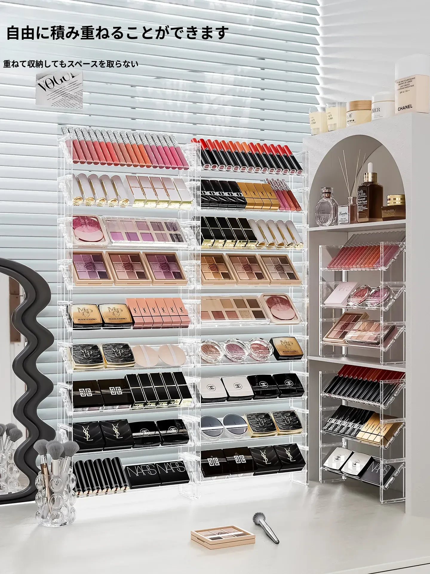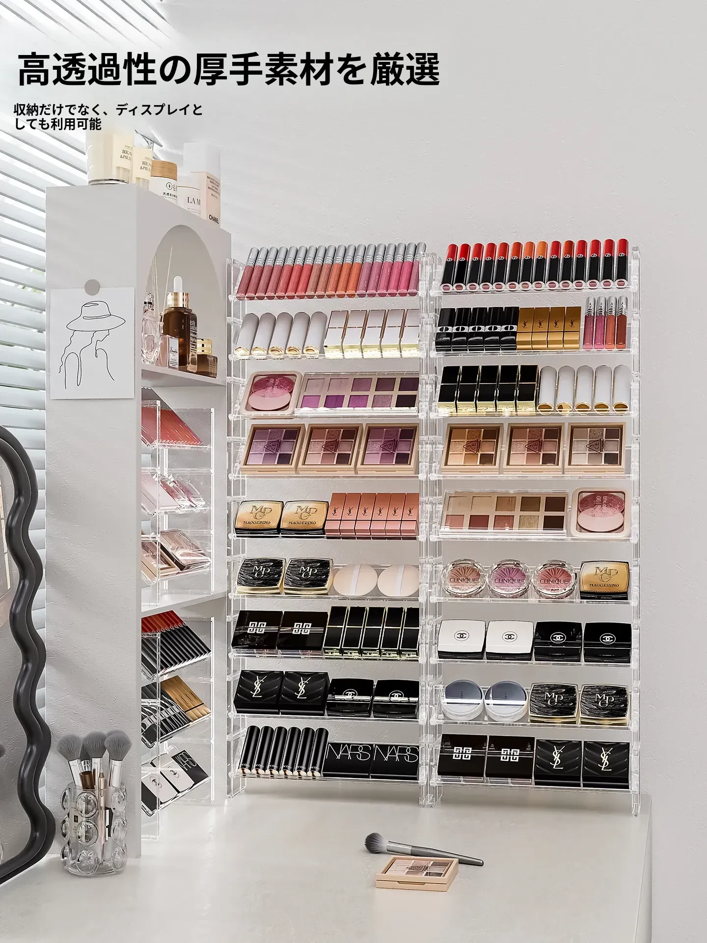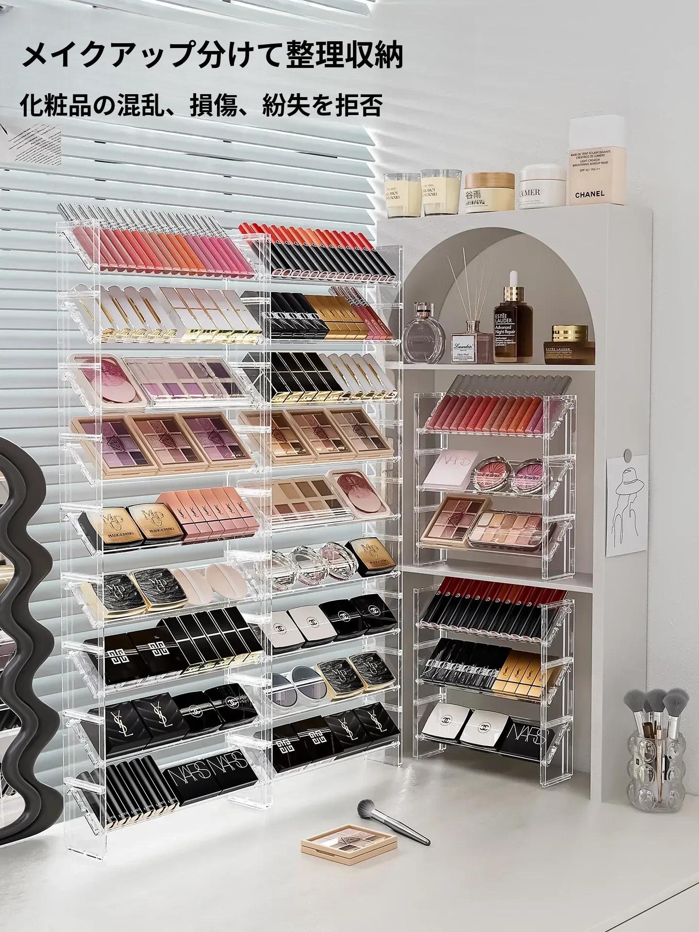 透明多層アイシャドウパレットディスプレイスタンド - メイクアップ用品をスマートに整理!化粧台にぴったりなコスメ収納ボックス、パウダー、クッションファンデ、リップの美しい置き場所を提供します。おしゃれで実用的な収納ソリューション!