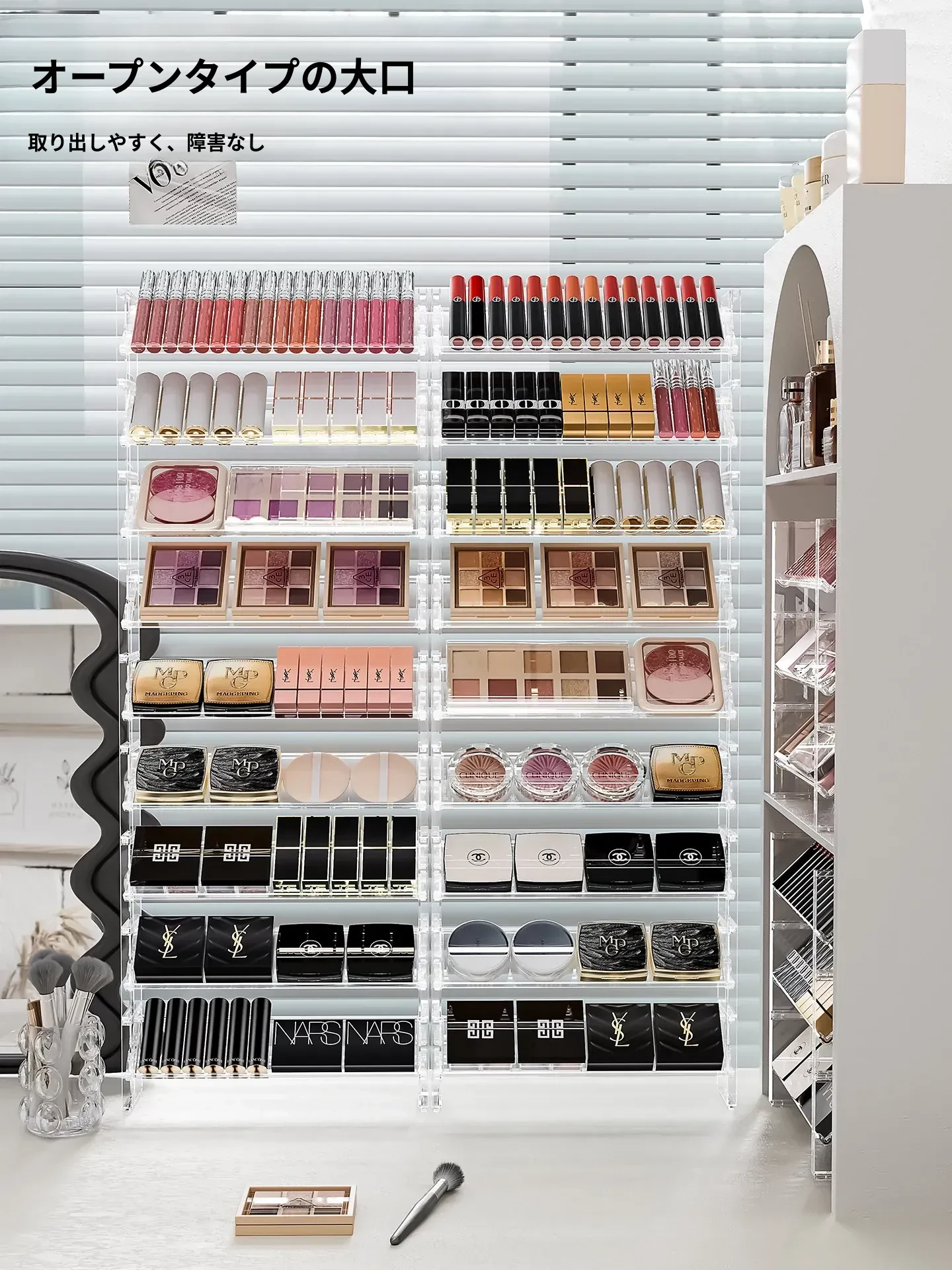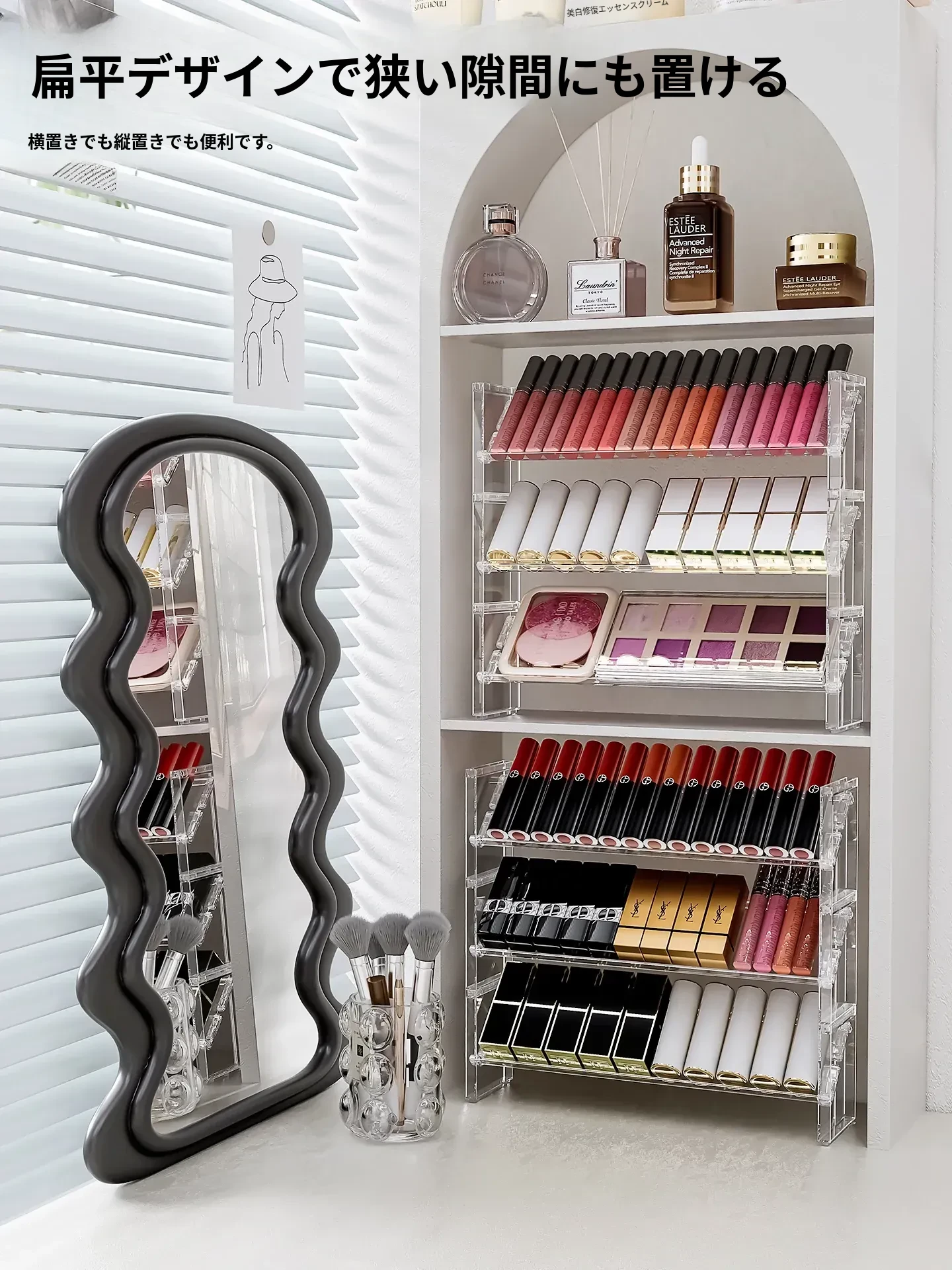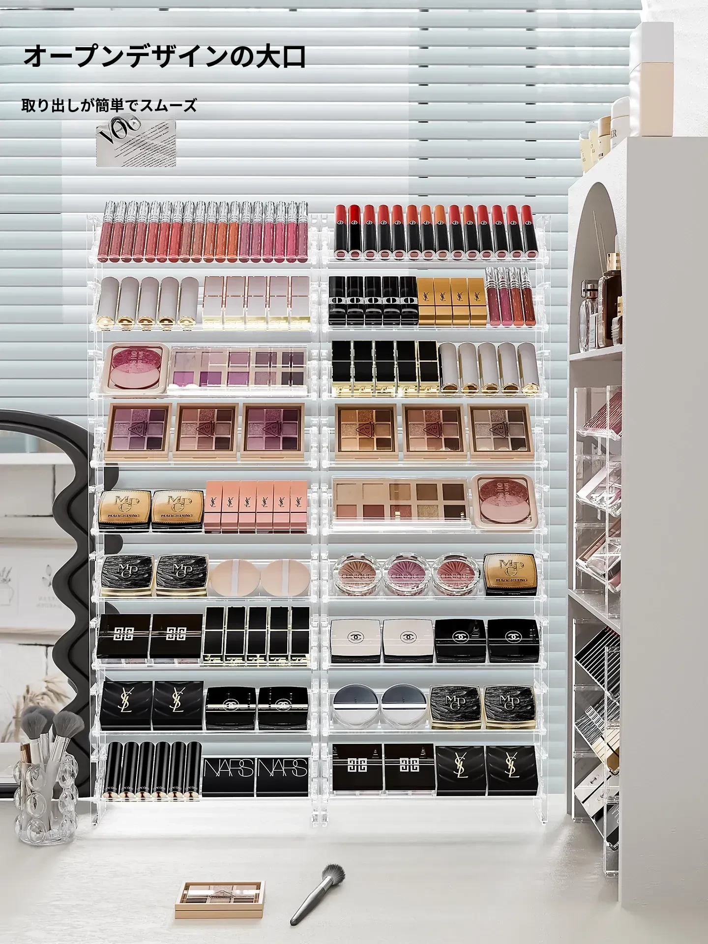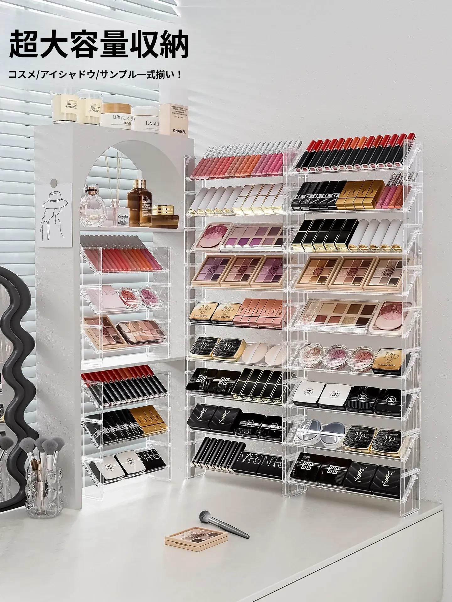 透明多層アイシャドウパレットディスプレイスタンド - メイクアップ用品をスマートに整理!化粧台にぴったりなコスメ収納ボックス、パウダー、クッションファンデ、リップの美しい置き場所を提供します。おしゃれで実用的な収納ソリューション!
