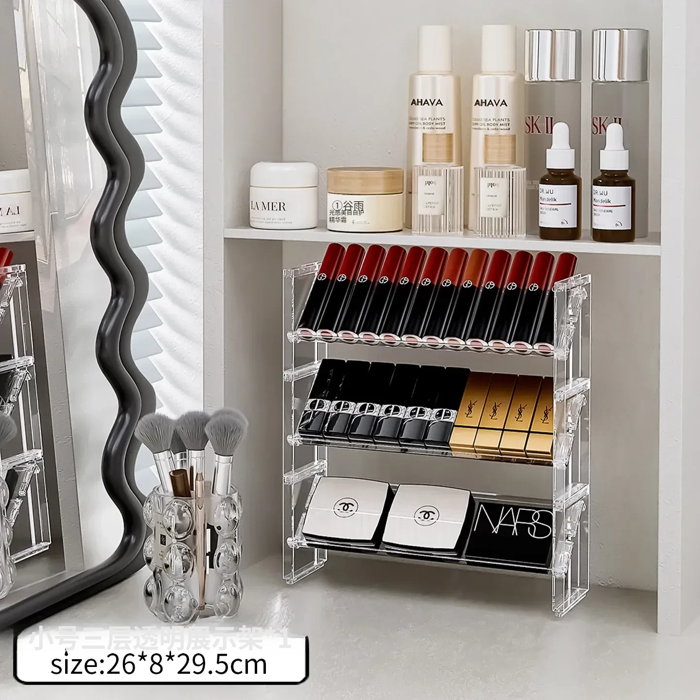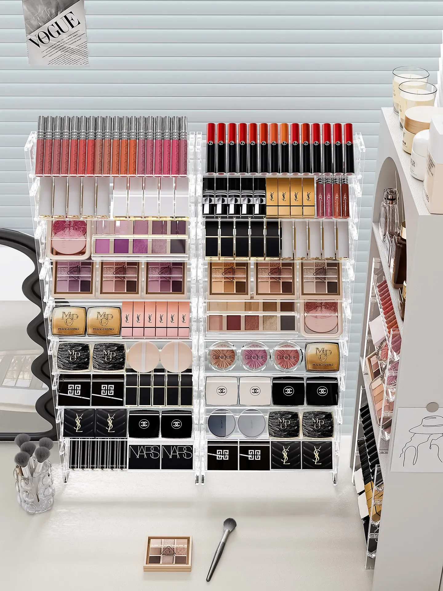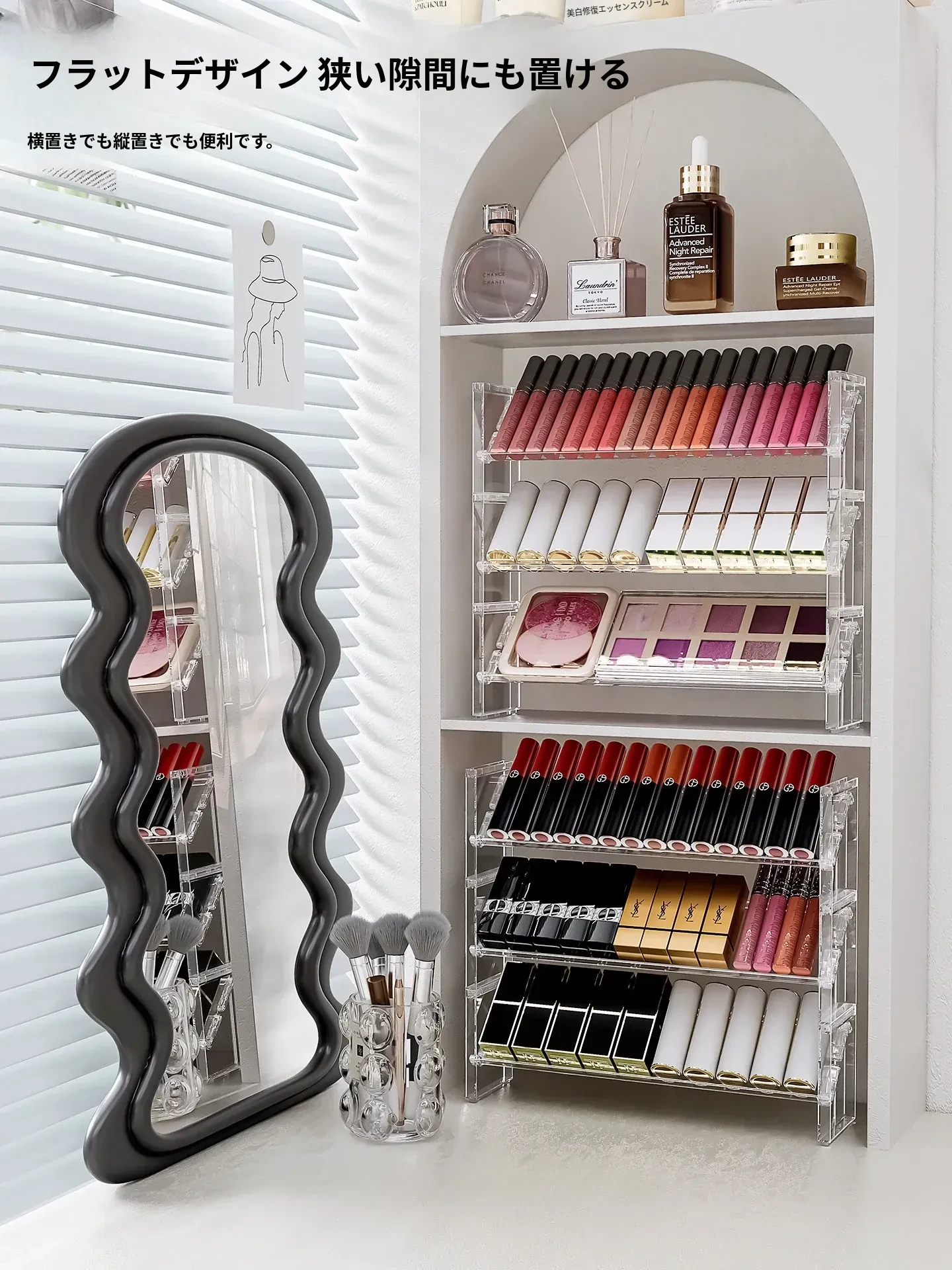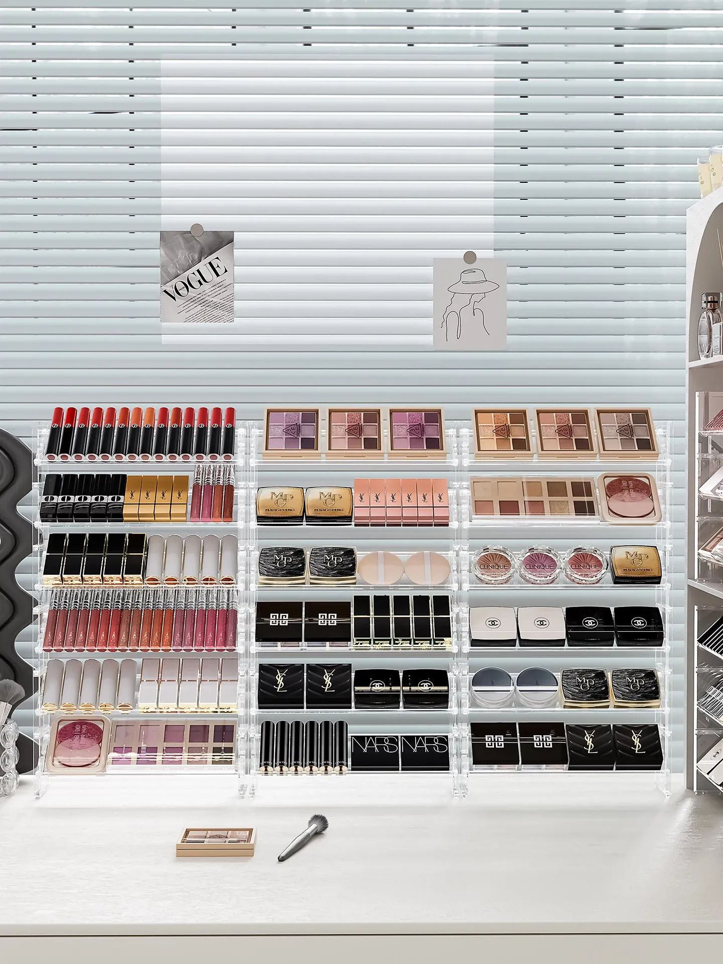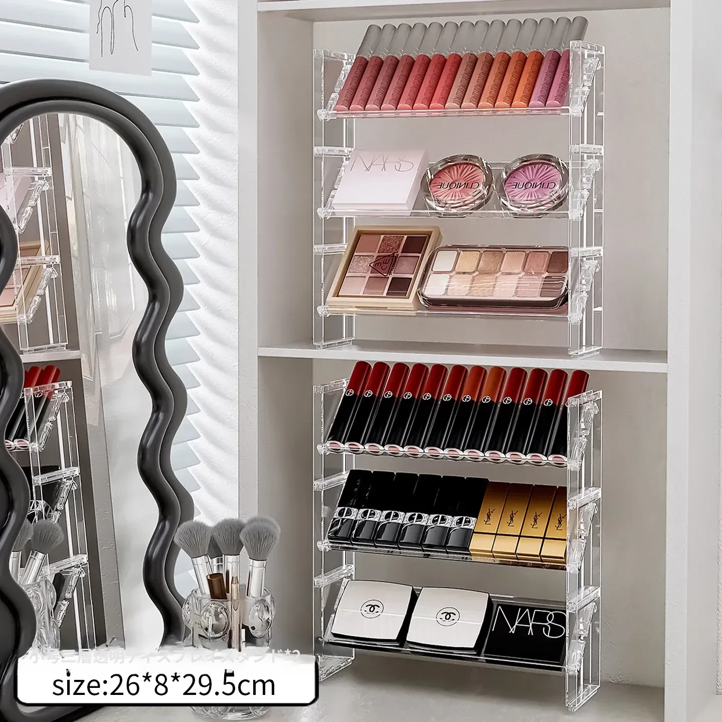 透明多層アイシャドウパレットディスプレイスタンド - メイクアップ用品をスマートに整理!化粧台にぴったりなコスメ収納ボックス、パウダー、クッションファンデ、リップの美しい置き場所を提供します。おしゃれで実用的な収納ソリューション!