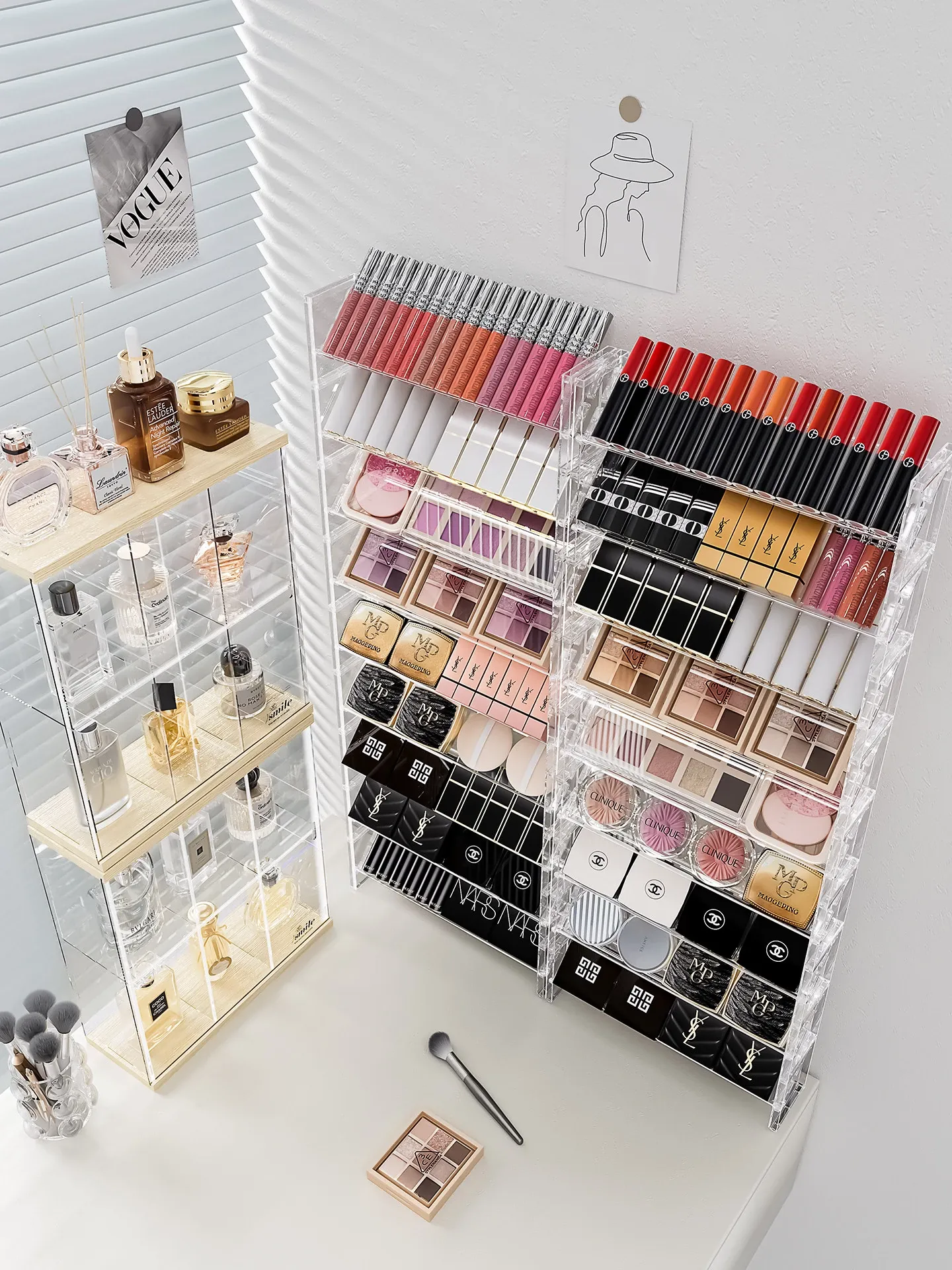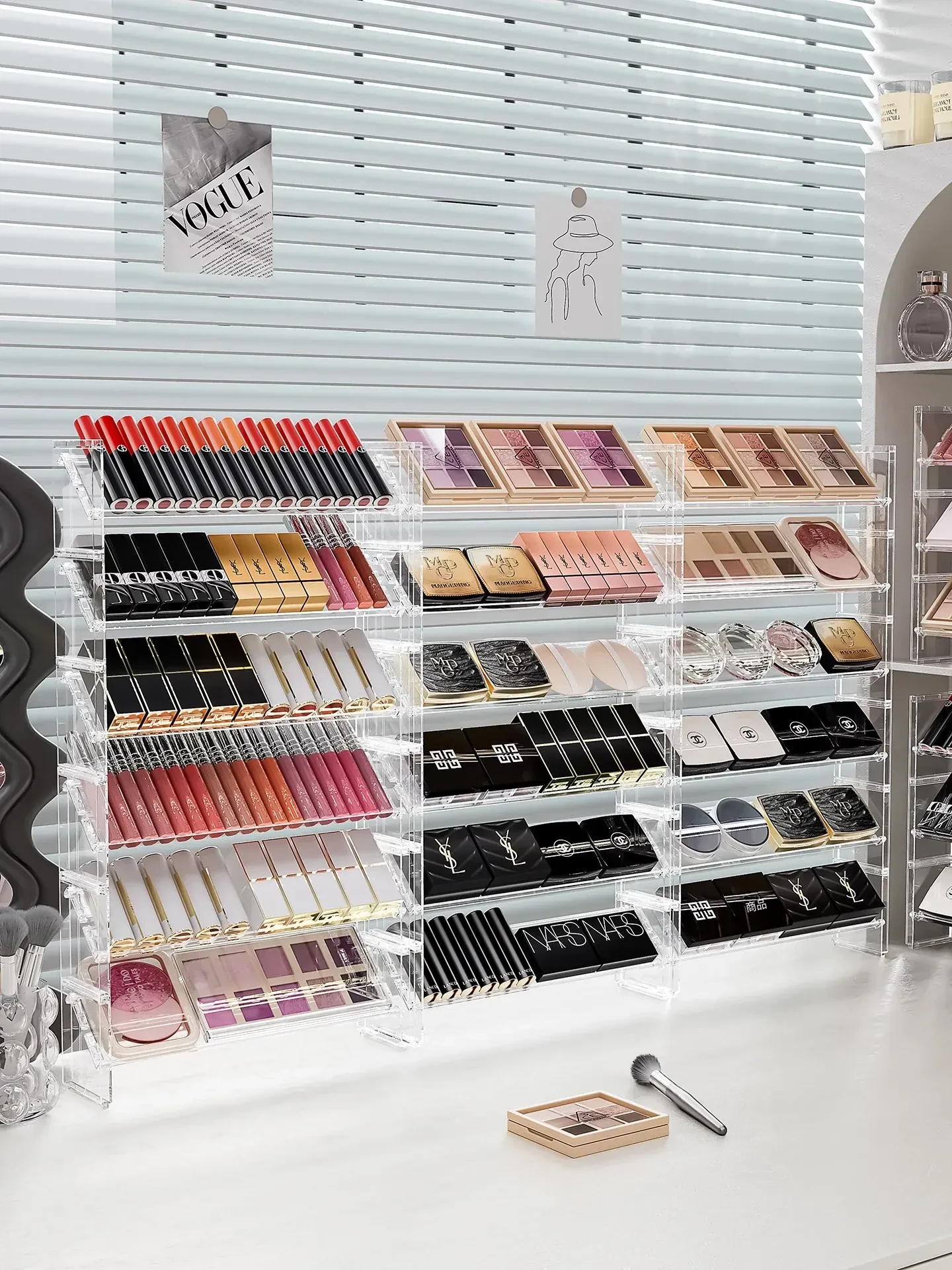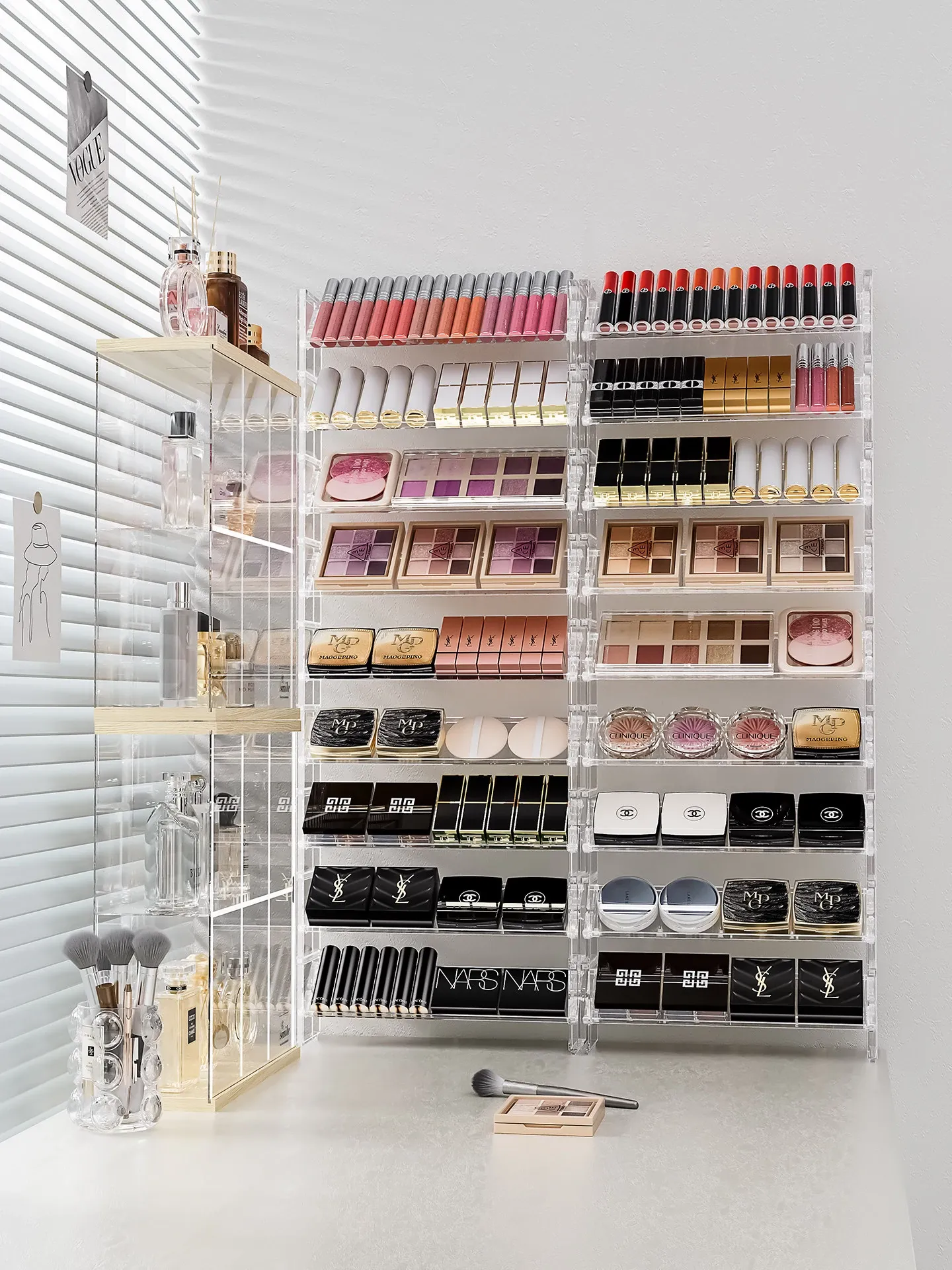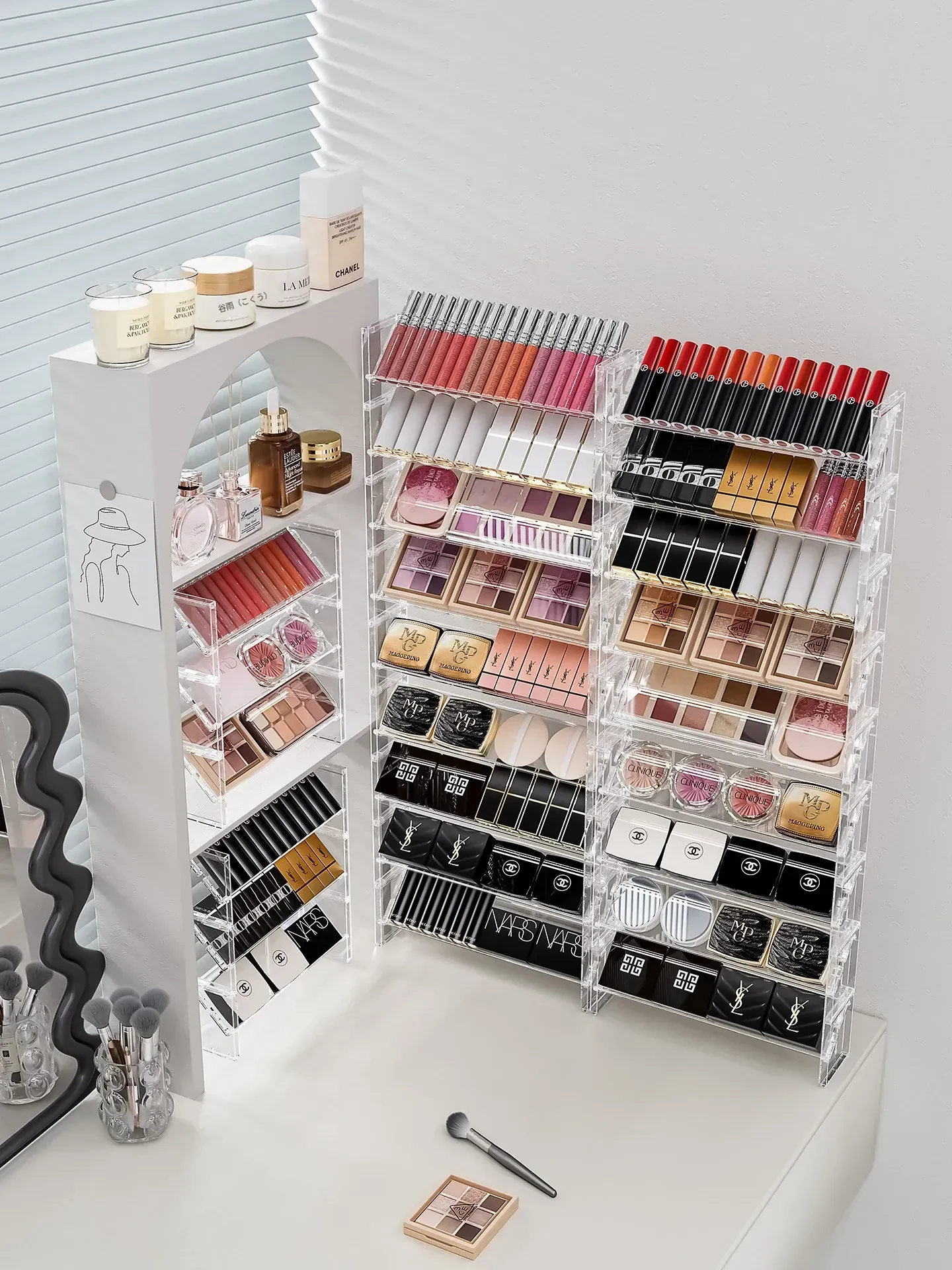 透明多層アイシャドウパレットディスプレイスタンド - メイクアップ用品をスマートに整理!化粧台にぴったりなコスメ収納ボックス、パウダー、クッションファンデ、リップの美しい置き場所を提供します。おしゃれで実用的な収納ソリューション!
