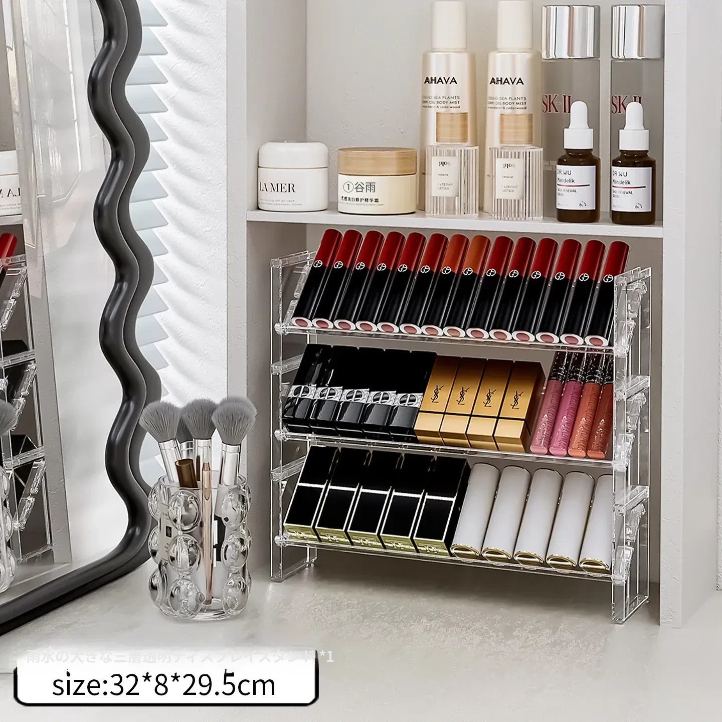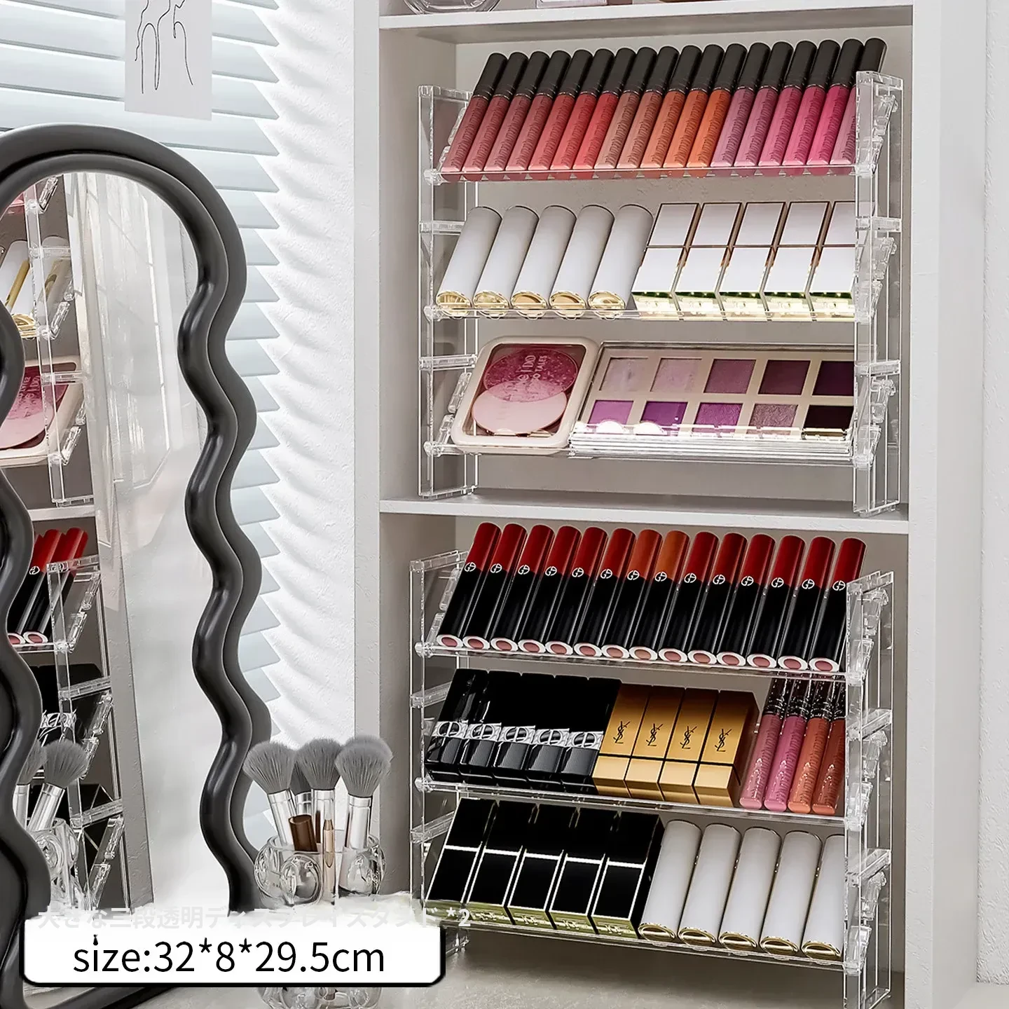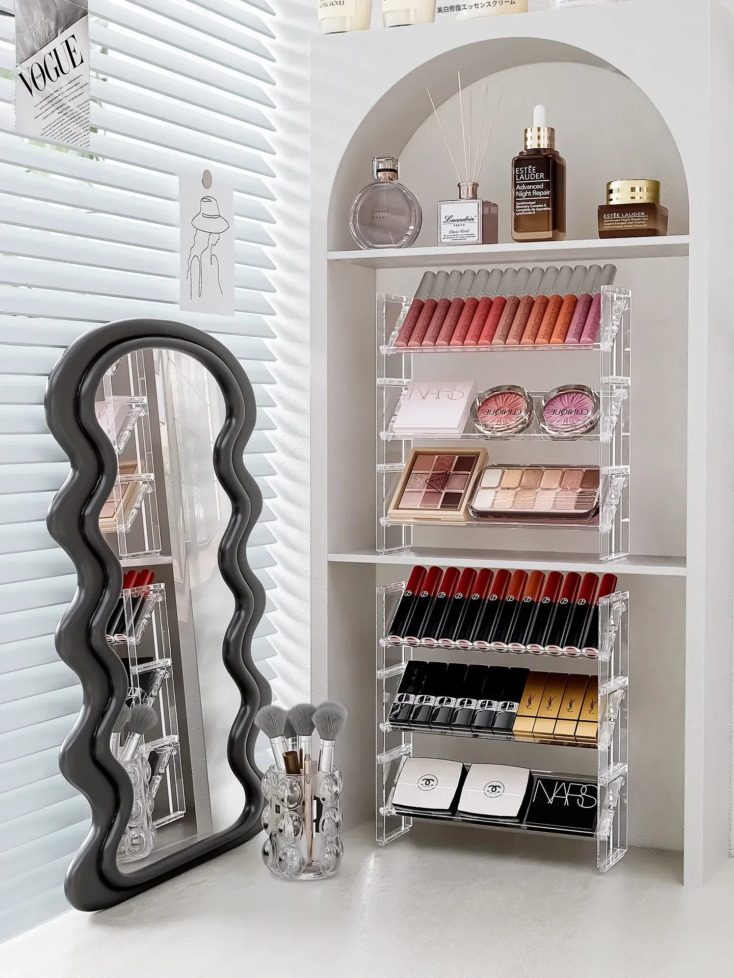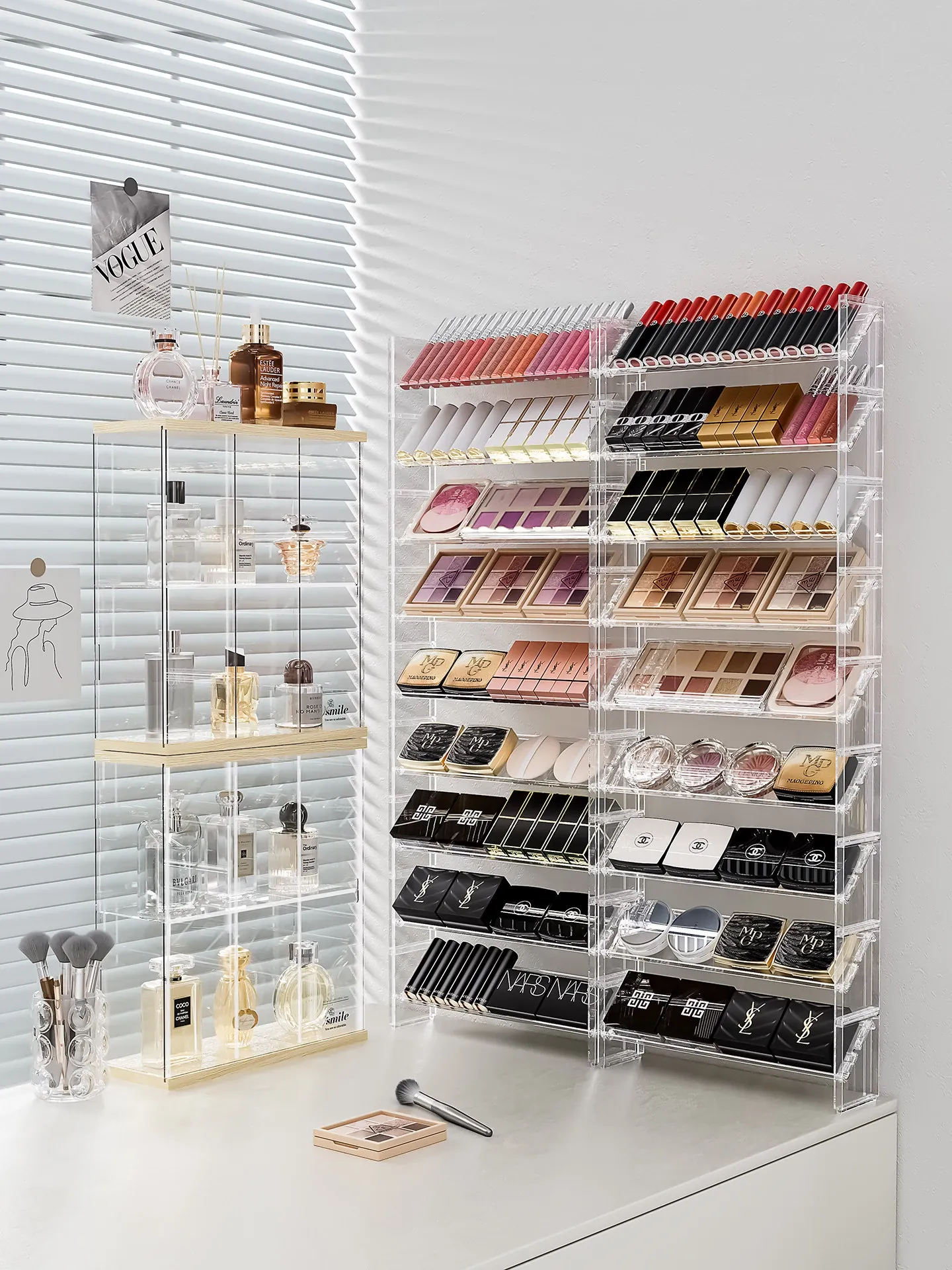 透明多層アイシャドウパレットディスプレイスタンド - メイクアップ用品をスマートに整理!化粧台にぴったりなコスメ収納ボックス、パウダー、クッションファンデ、リップの美しい置き場所を提供します。おしゃれで実用的な収納ソリューション!