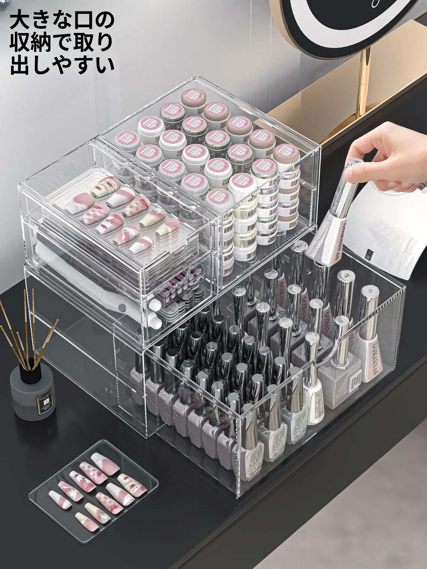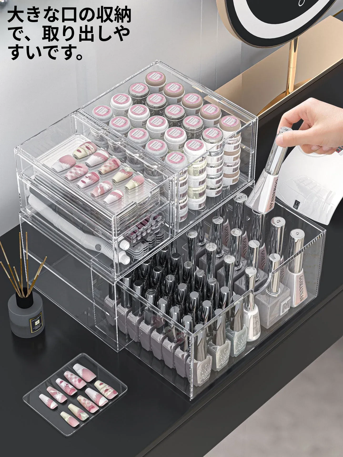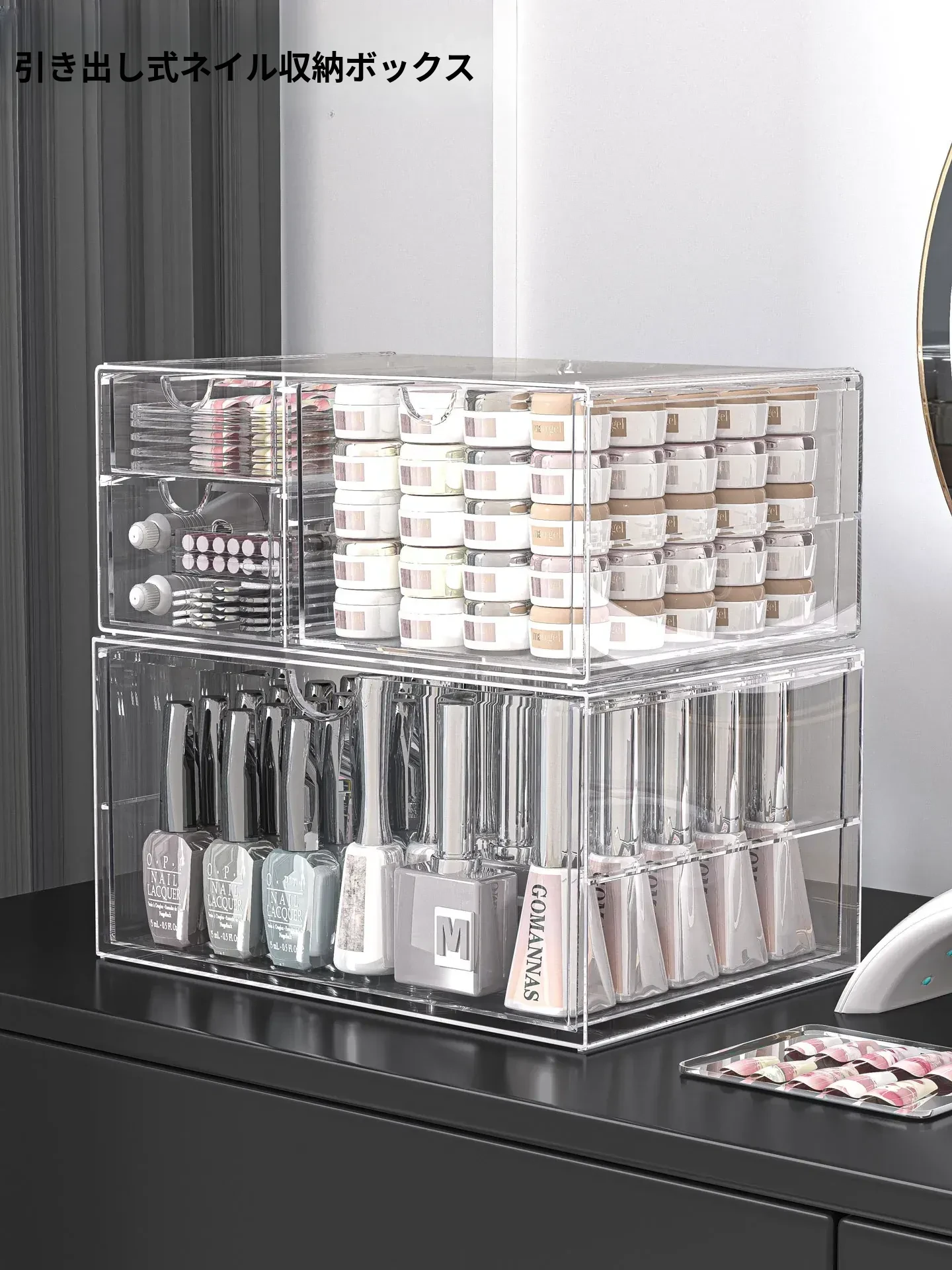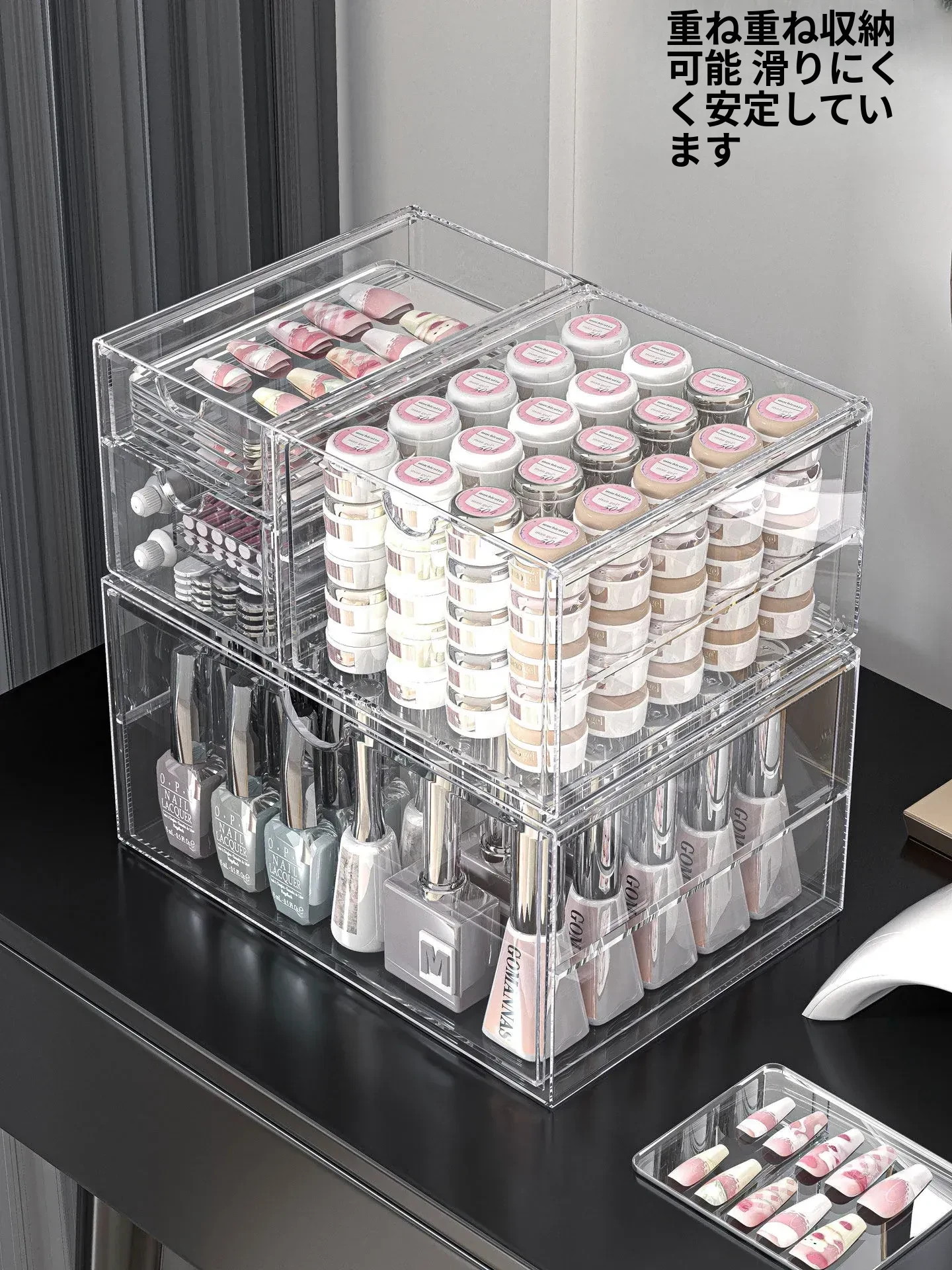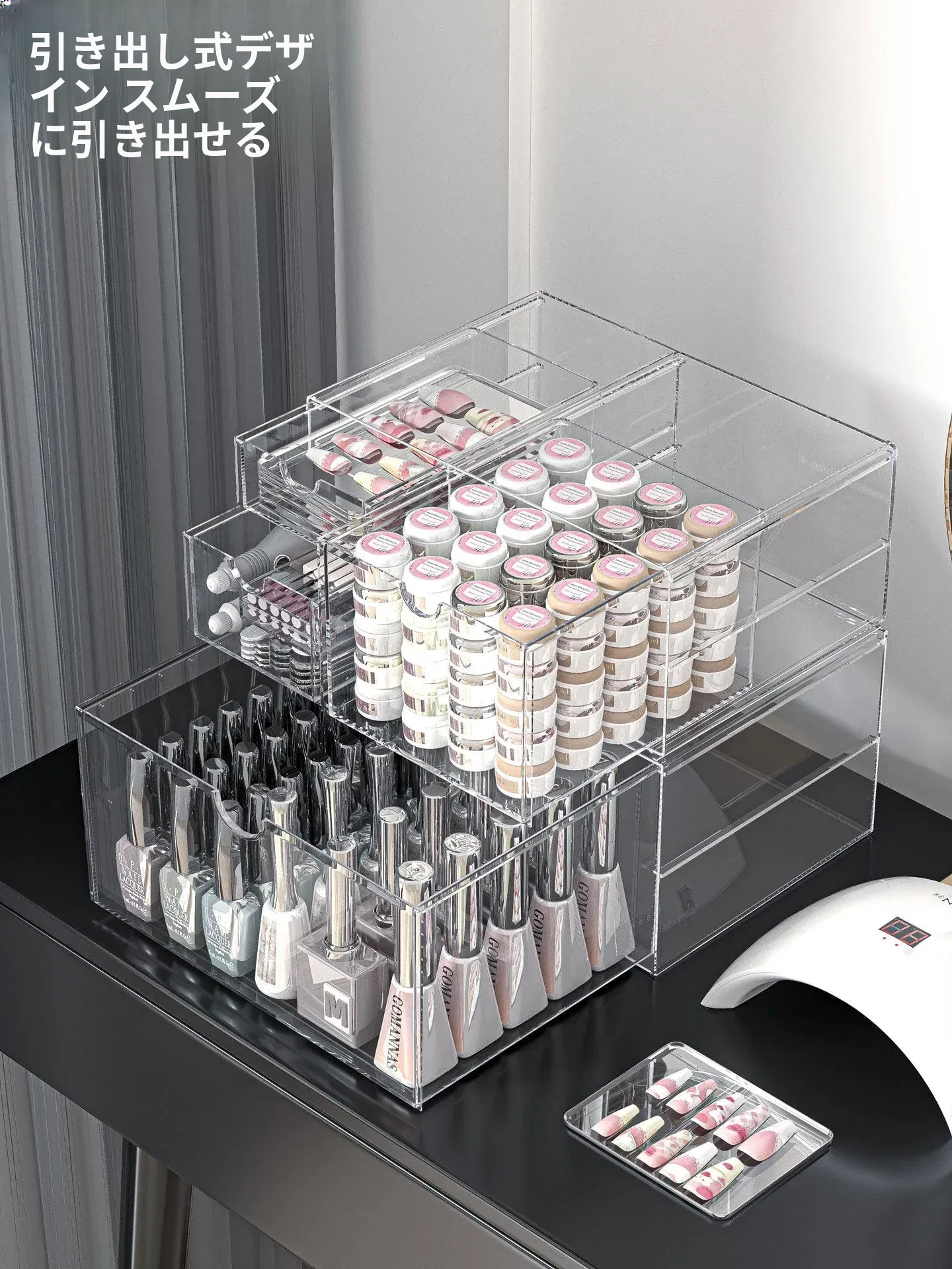 透明なネイルポリッシュ収納ボックス!デスク上で使える美甲ツールケース、引き出し式で家でも簡単に整理整頓。ネイルジェルやアクセサリーもすっきり収納でき、あなたの美しさを引き立てます。