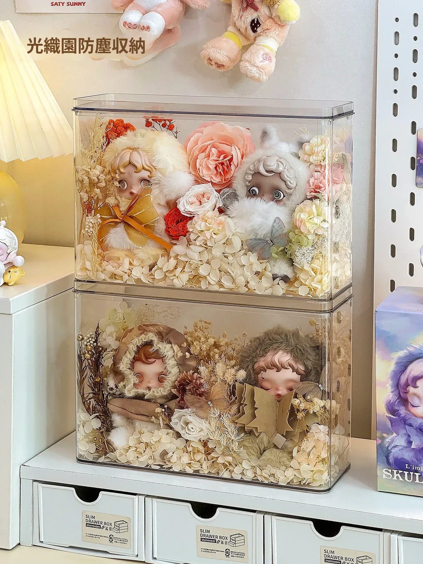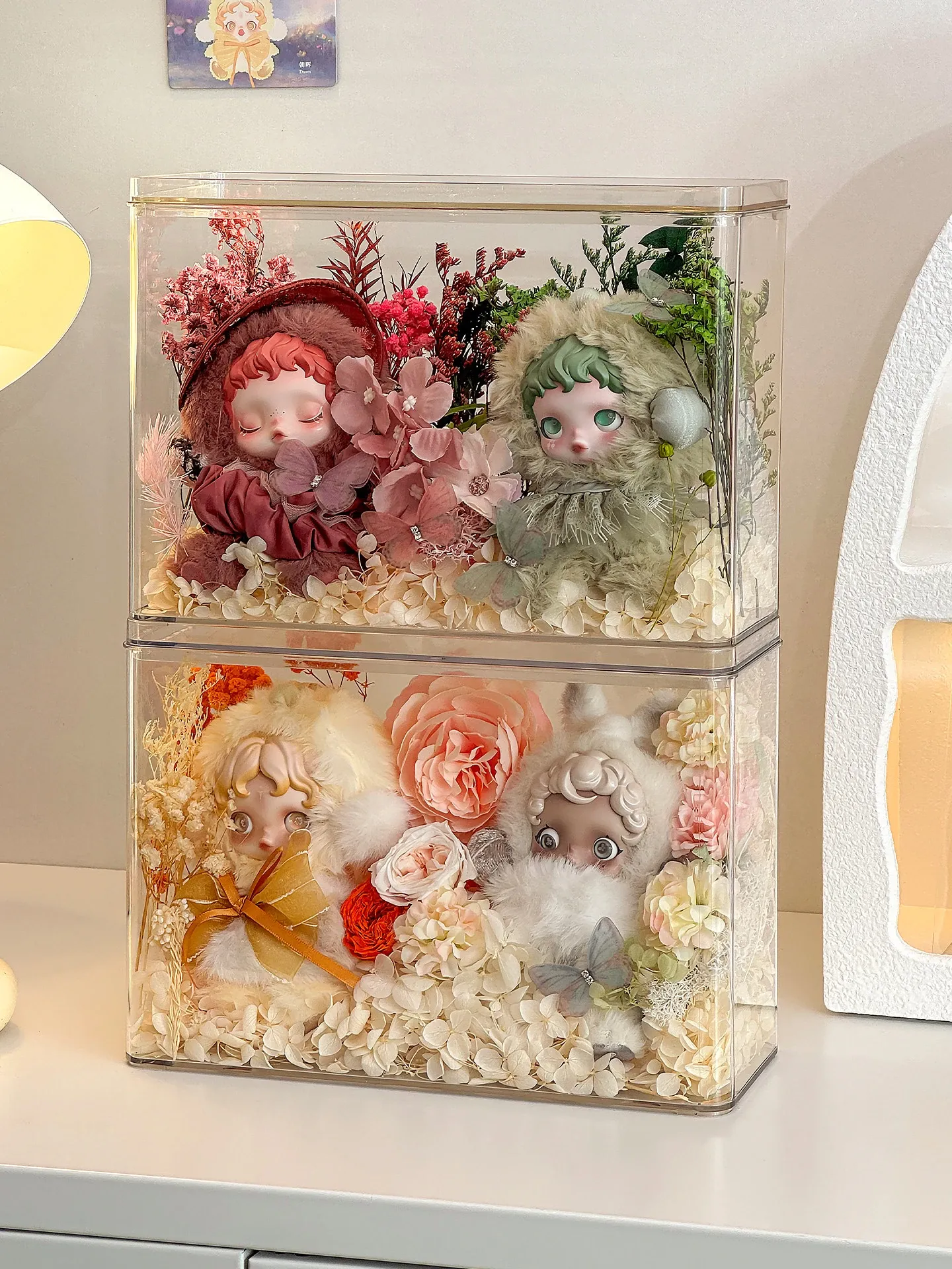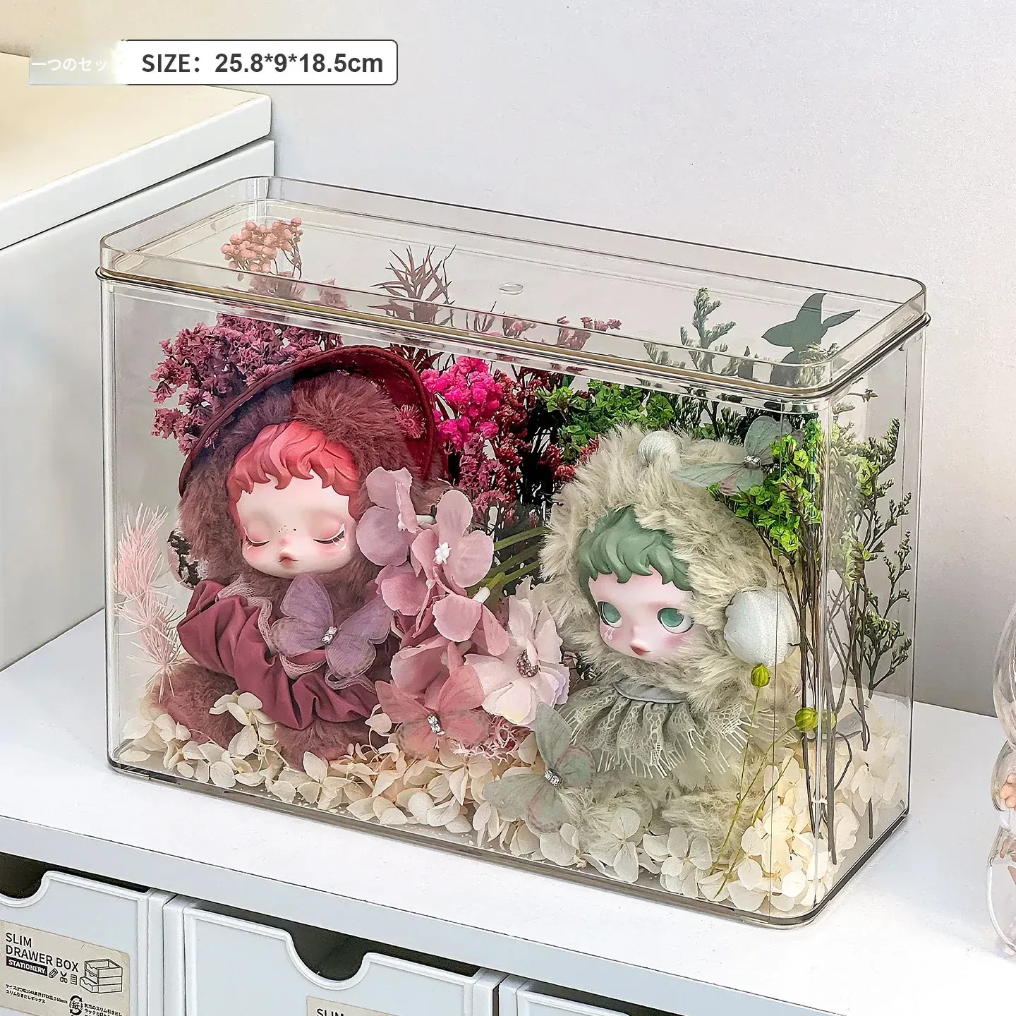 光织園の透明SPゴム製ドールケース - ぬいぐるみを美しく展示!ブラインドボックス収納に最適で、ホコリから守るカバー付き。あなたのコレクションをスタイリッシュに演出しましょう!