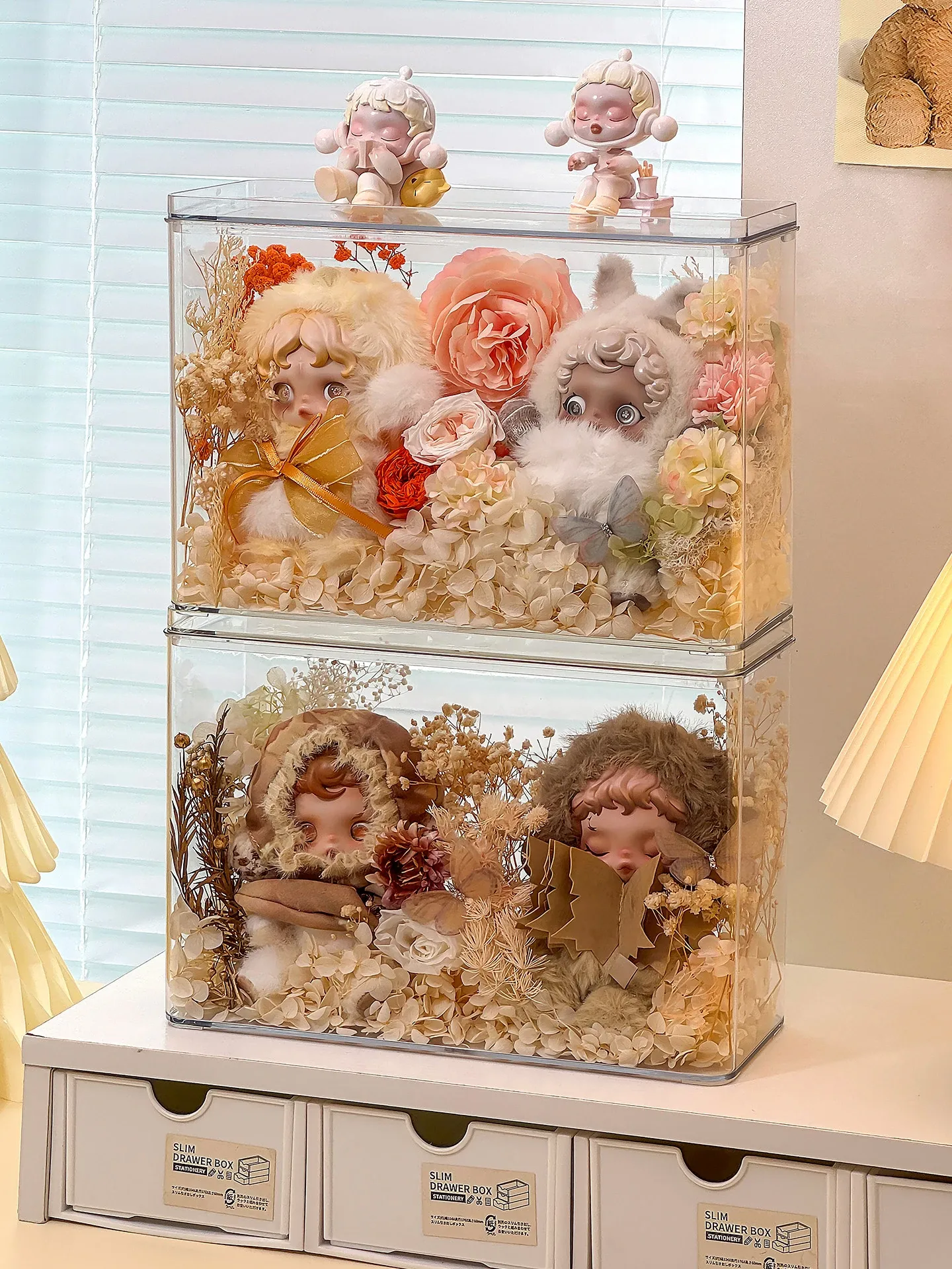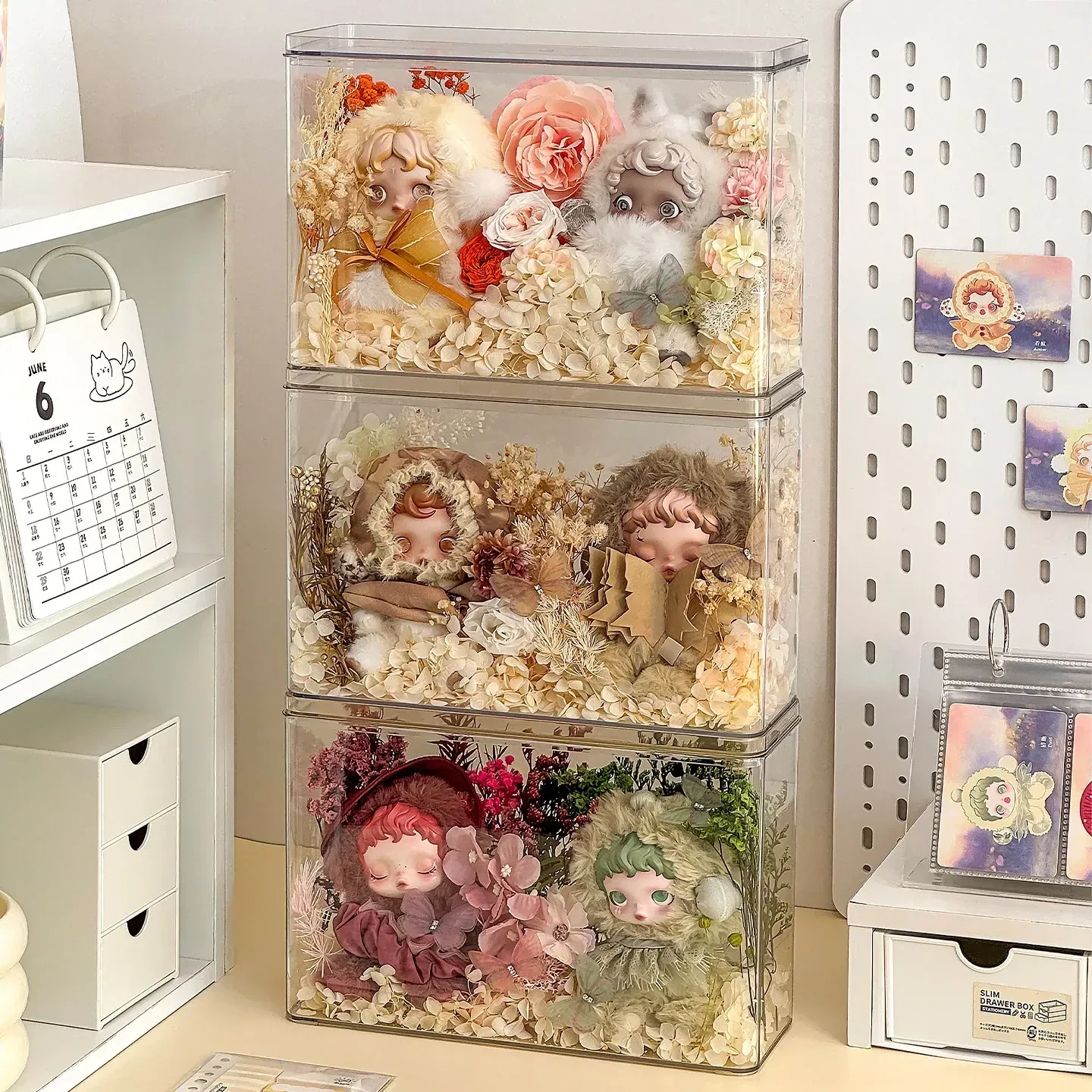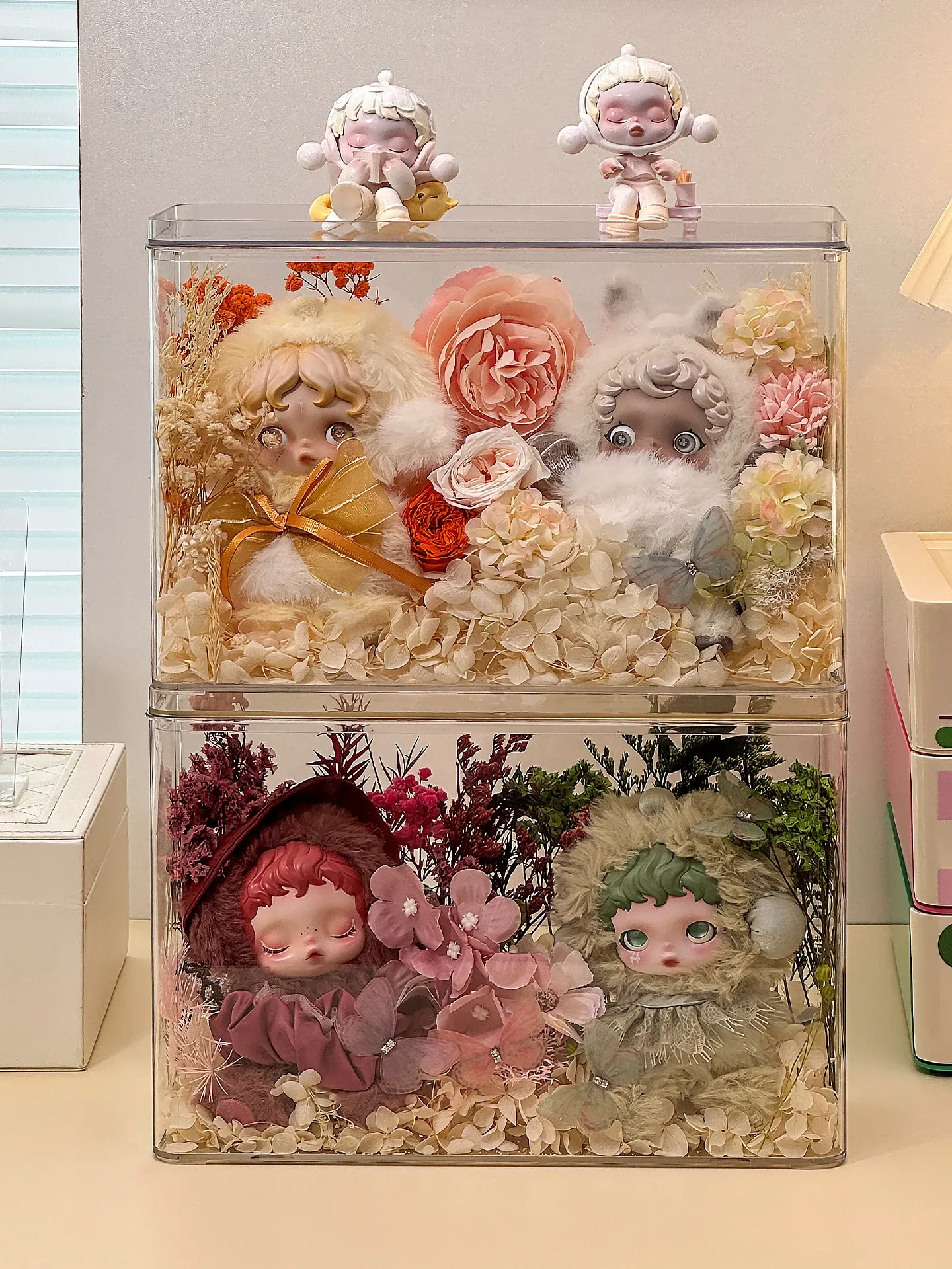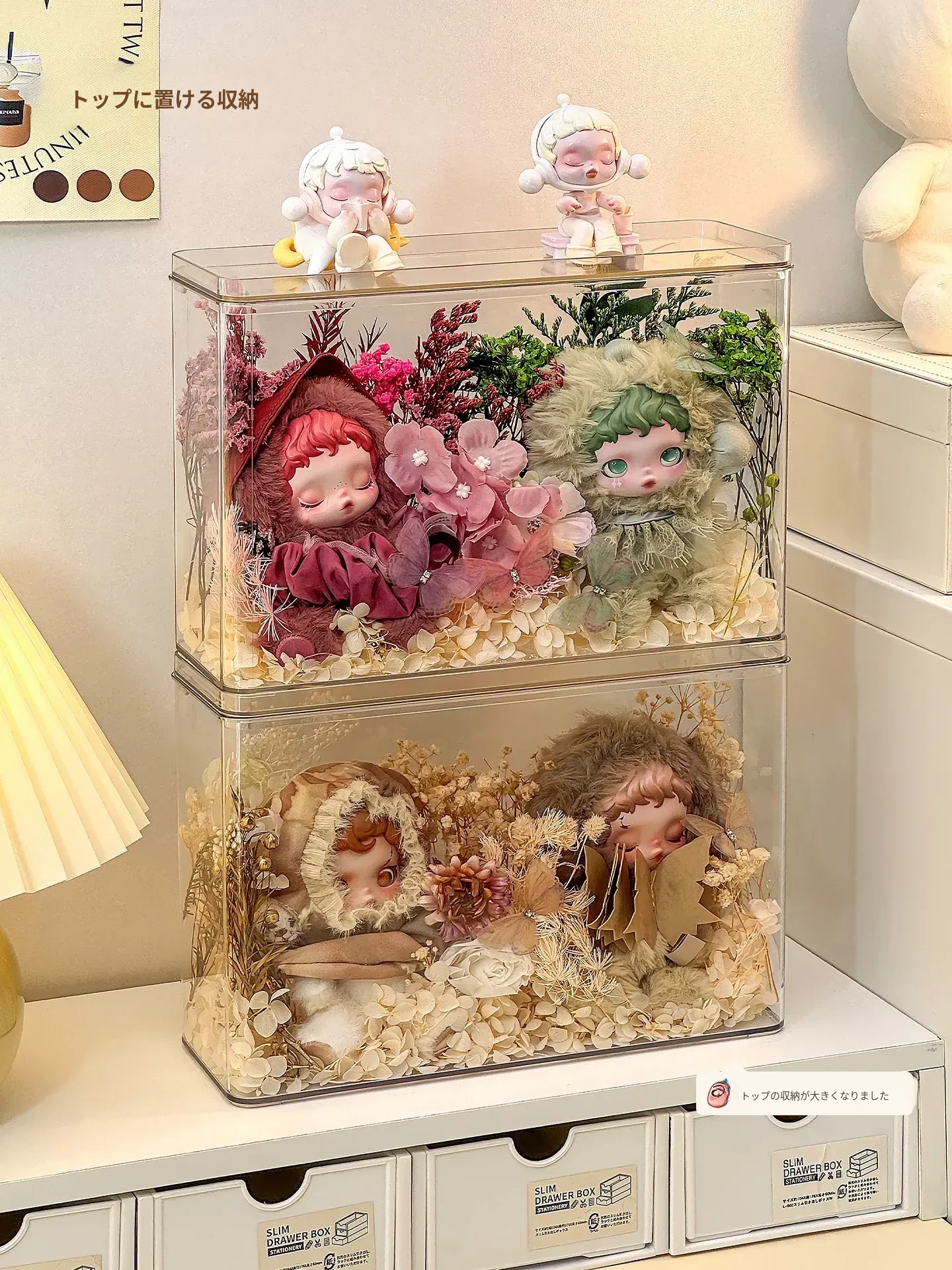 光织園の透明SPゴム製ドールケース - ぬいぐるみを美しく展示!ブラインドボックス収納に最適で、ホコリから守るカバー付き。あなたのコレクションをスタイリッシュに演出しましょう!