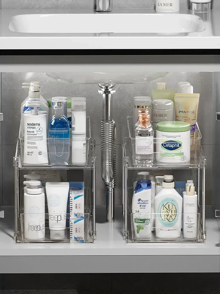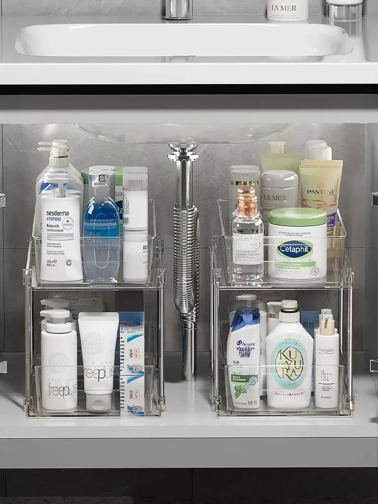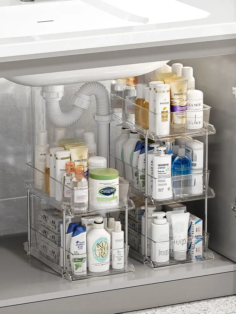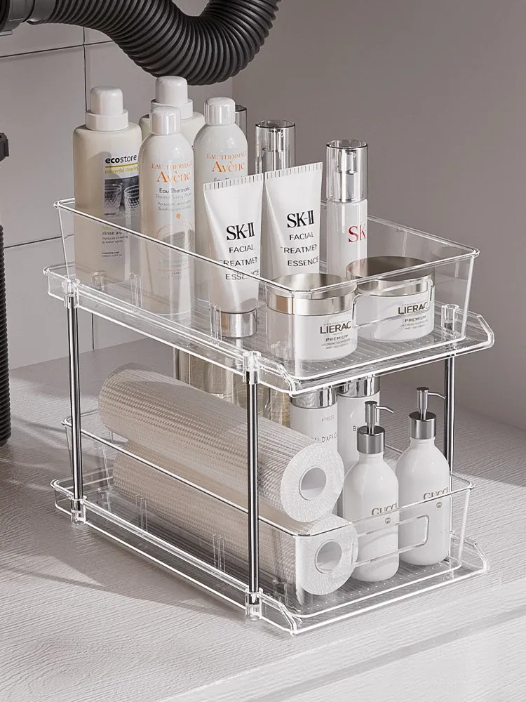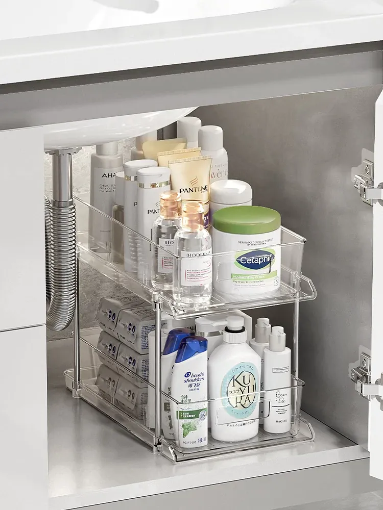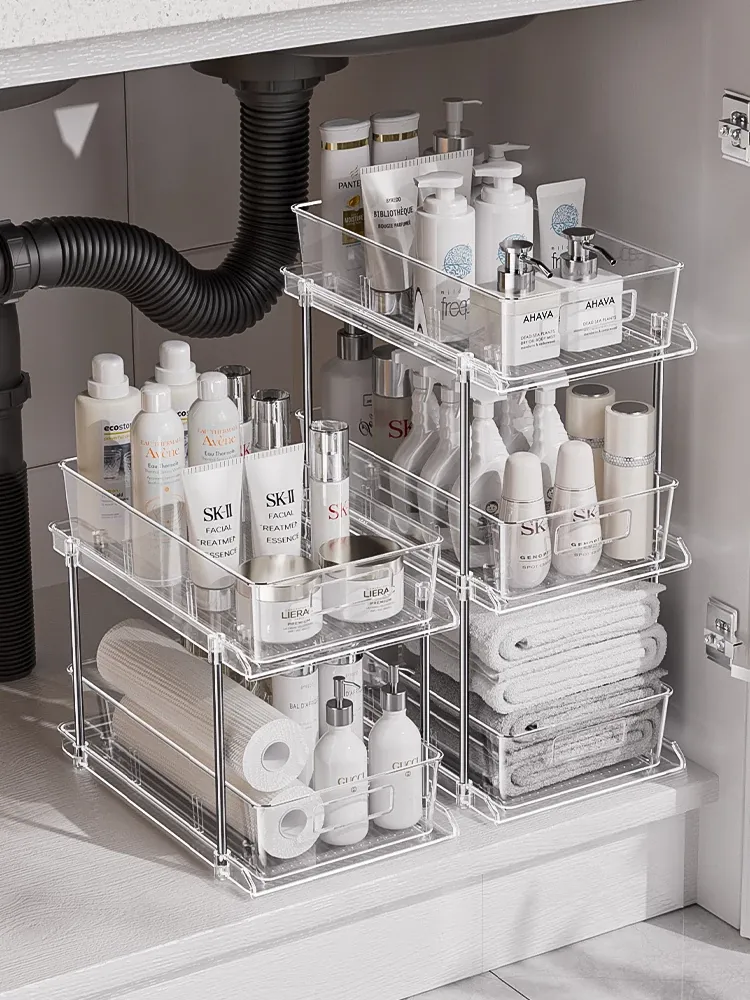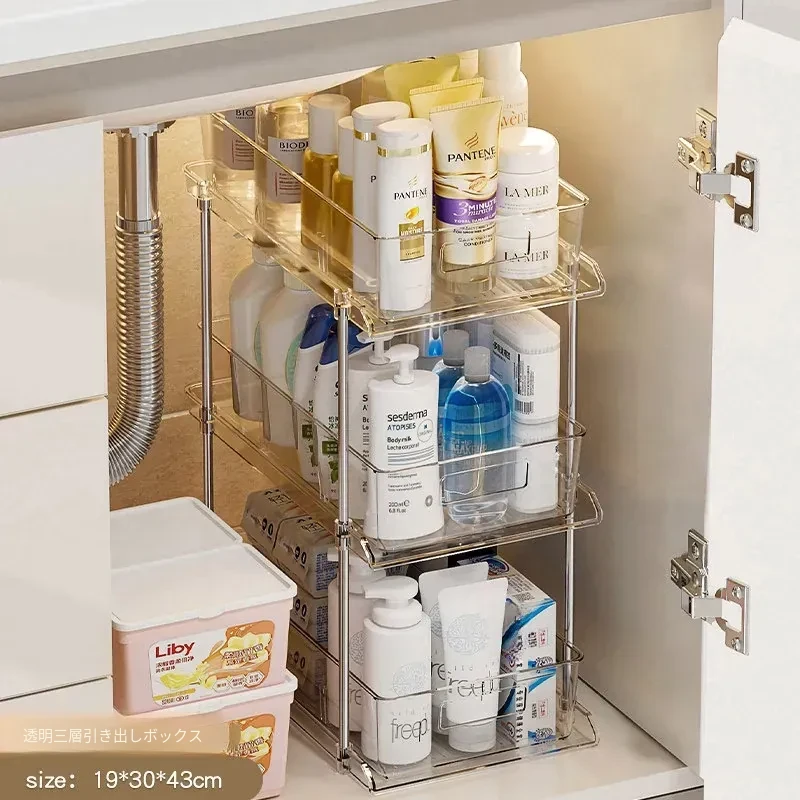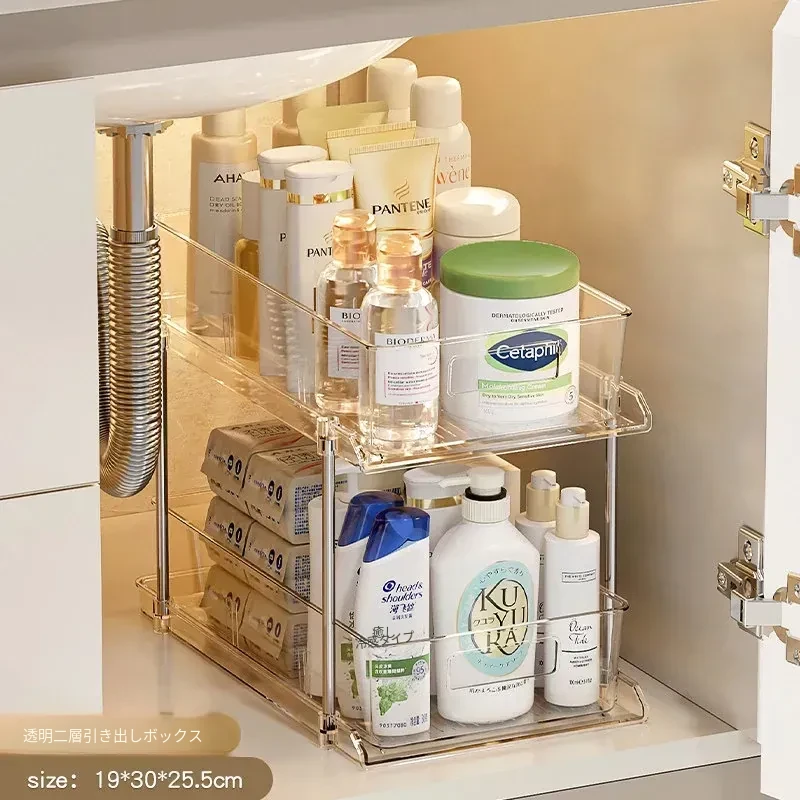下水槽用のスタイリッシュな収納ラック!トイレやキッチンのキャビネットにぴったり、引き出しのように使える便利な仕切り付き収納で、洗面台もスッキリ整理!おしゃれで機能的な収納アイテムです。