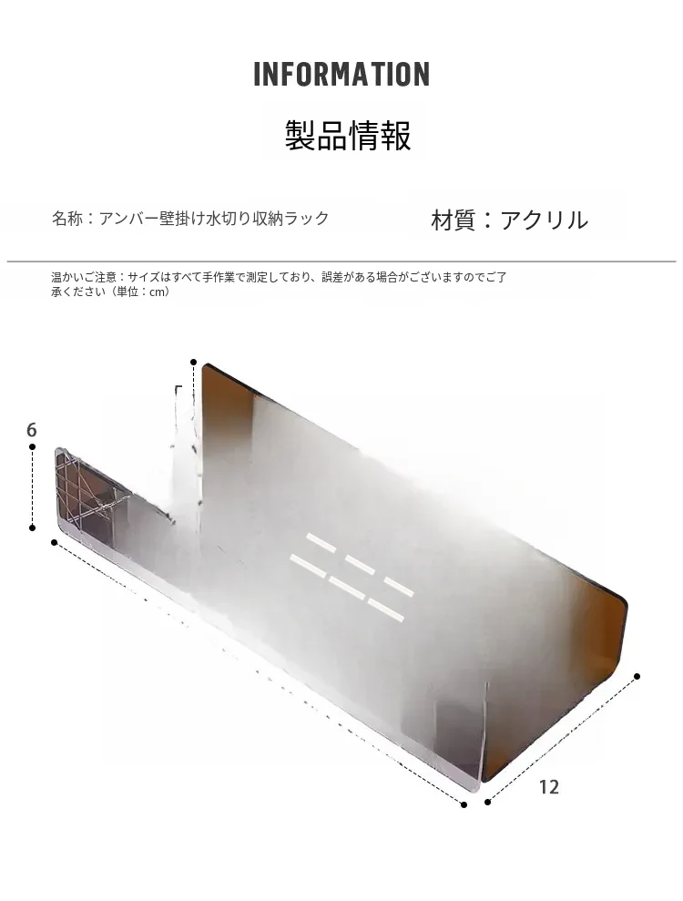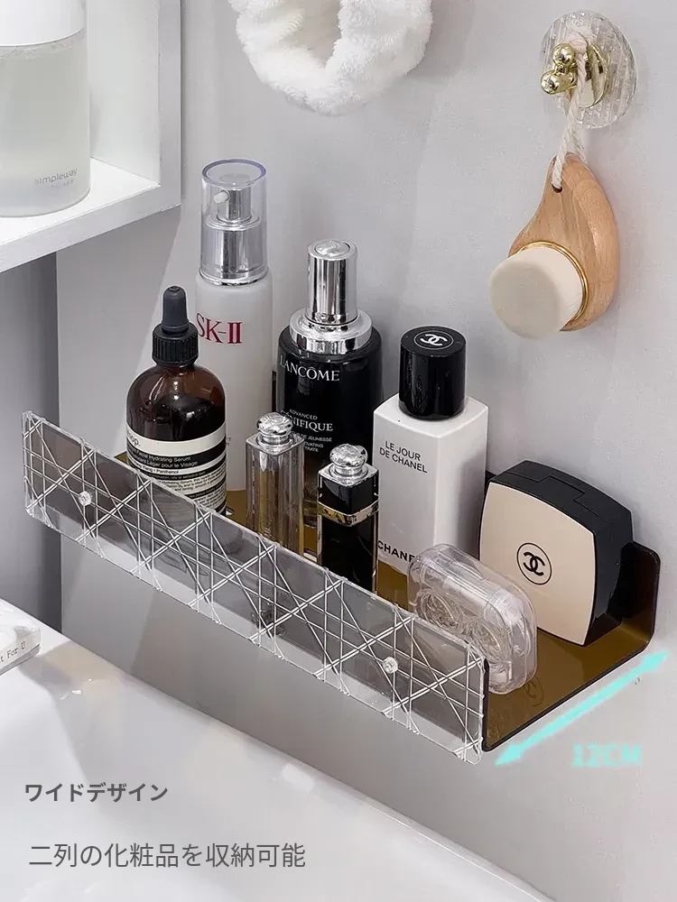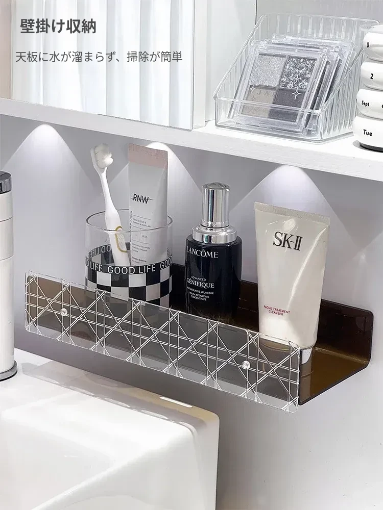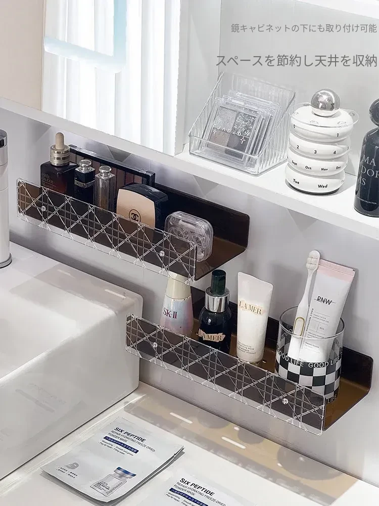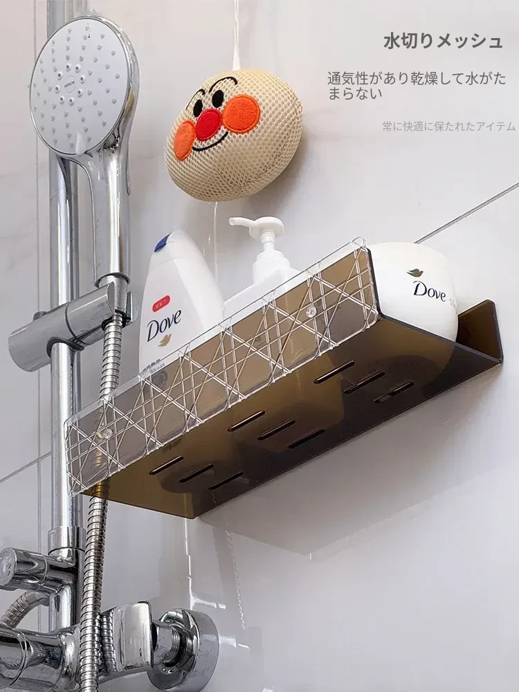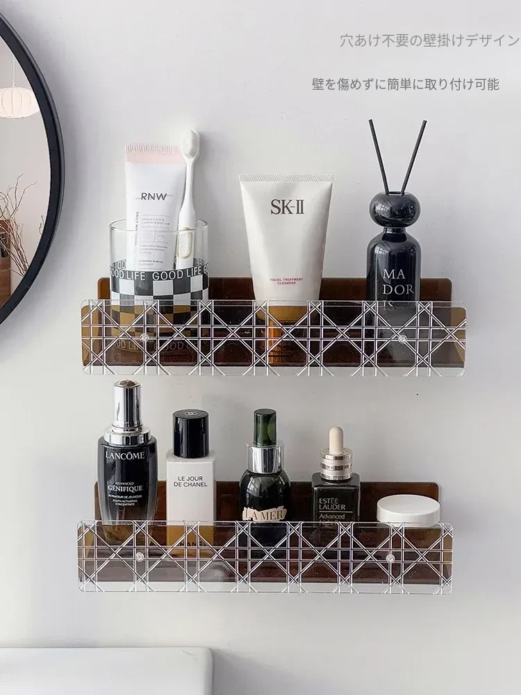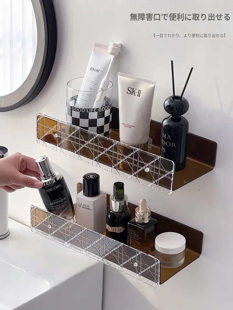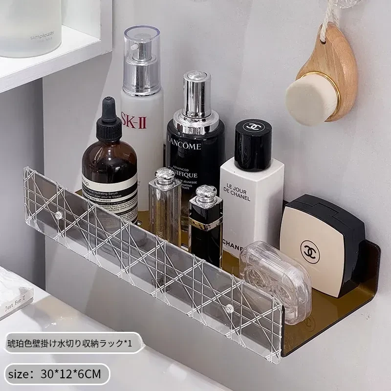壁掛け式バスルーム収納ラック - 化粧品整理ボックス、穴を開けずに取り付け可能!洗面台やトイレで使える水切り付き、スッキリとした空間を実現します。おしゃれで実用的な収納ソリューション!