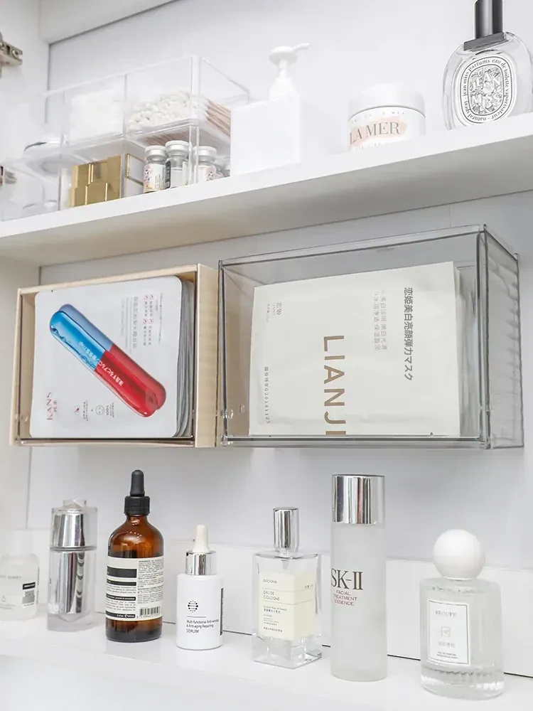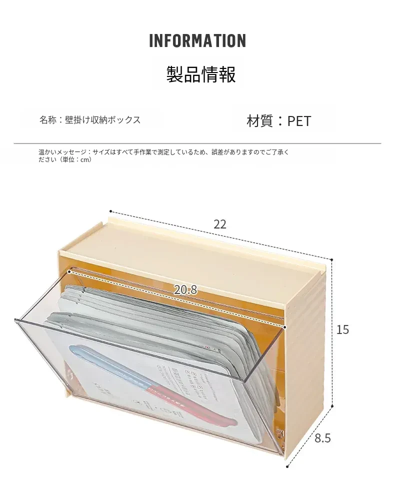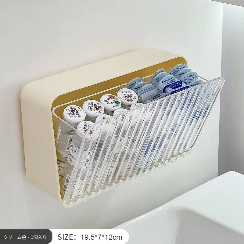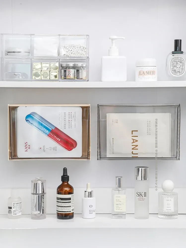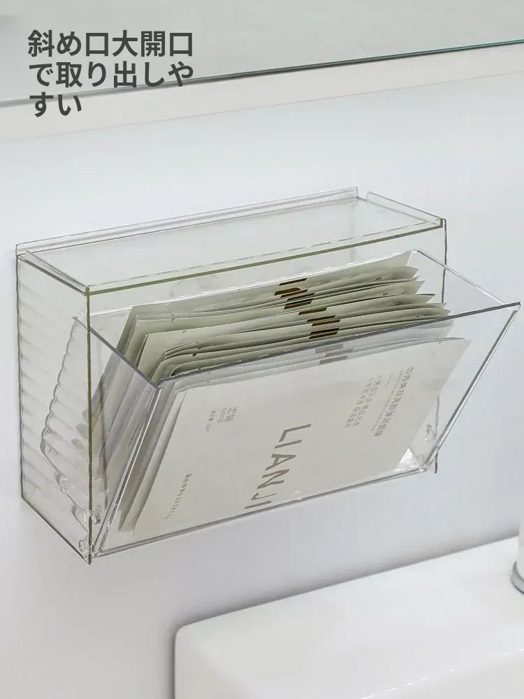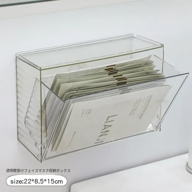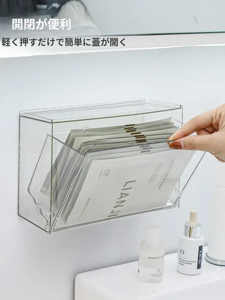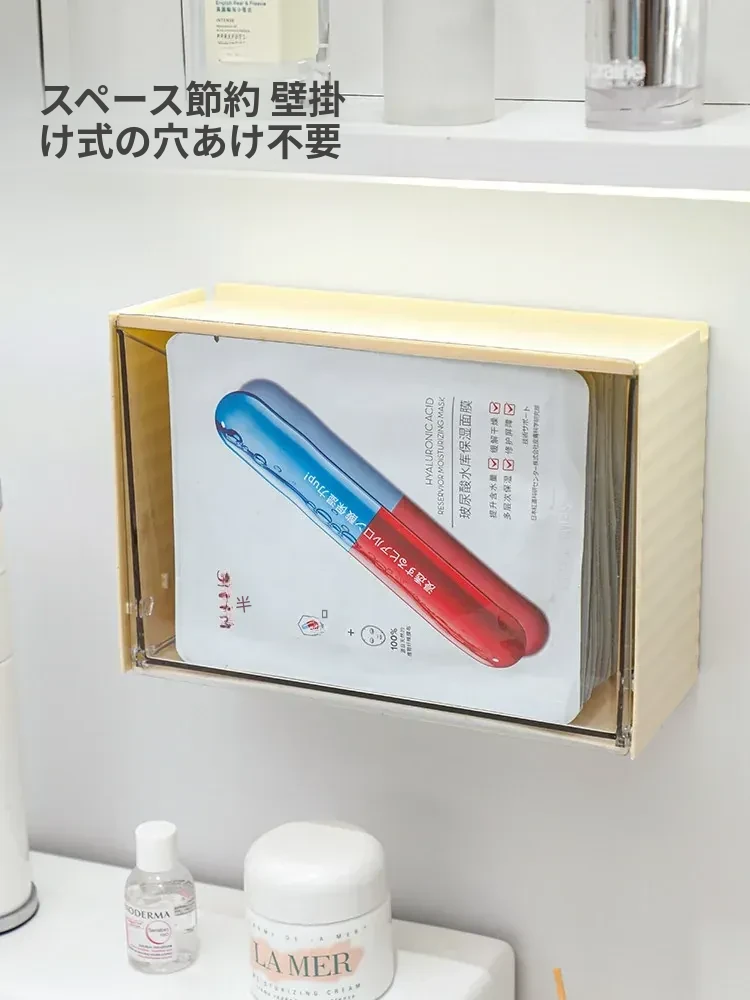壁掛けマスク収納ボックス - 壁に取り付けるだけ!穴あけ不要の透明防塵化粧品ボックスで、スキンケアアイテムをスマートに整理。おしゃれで機能的な収納で、衛生的なバスルームを実現!