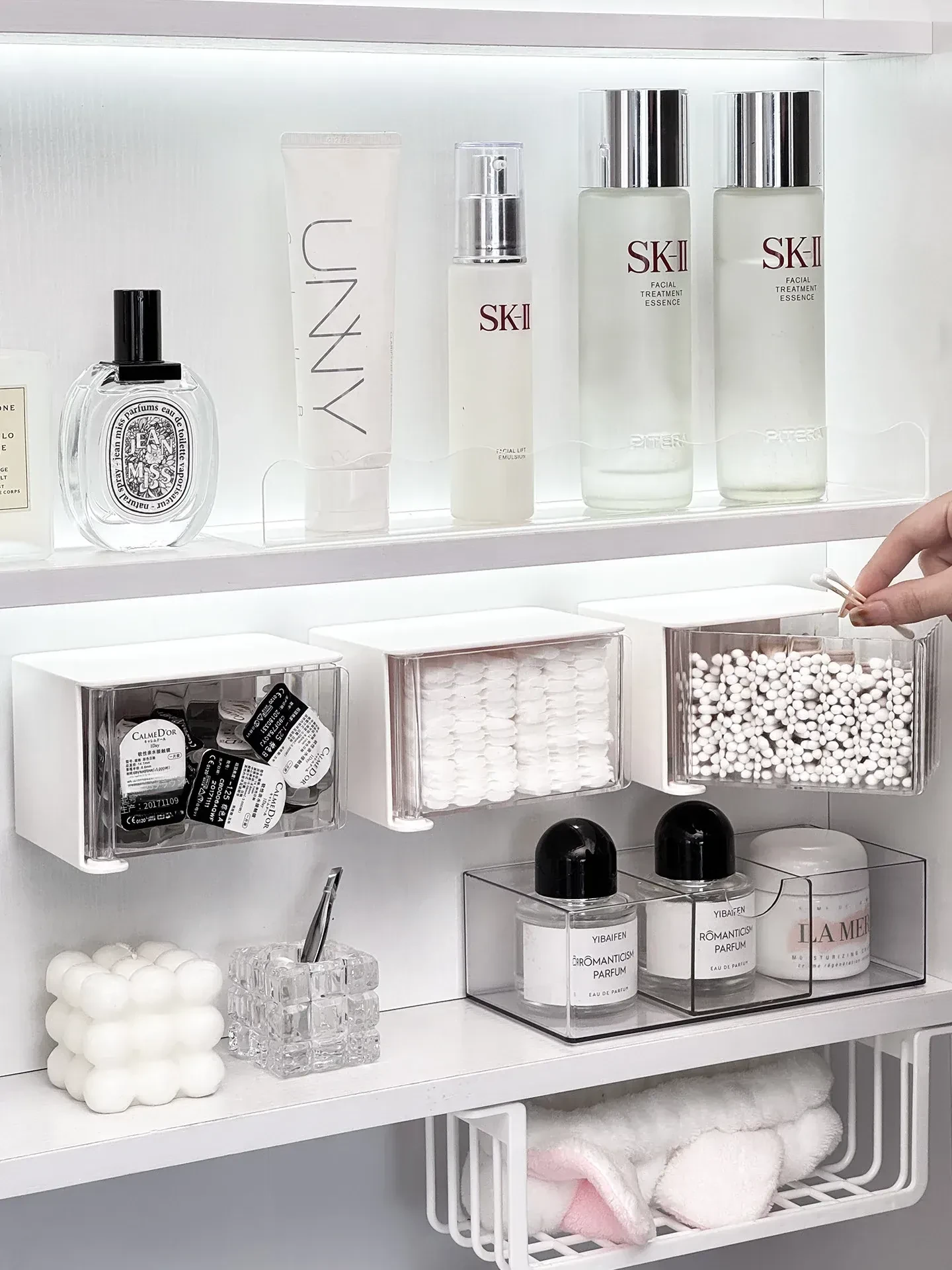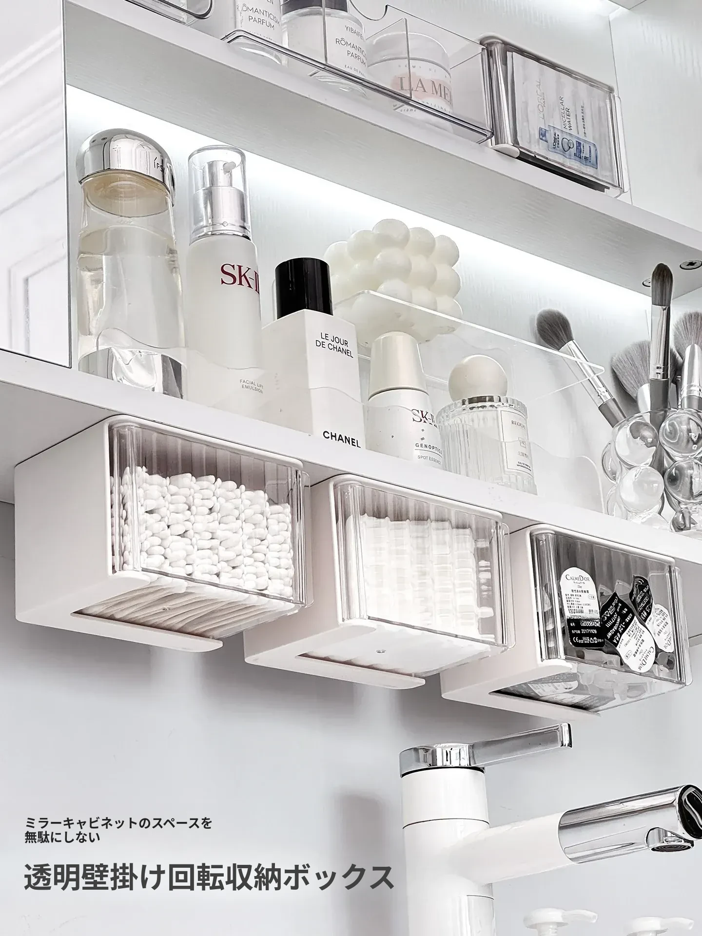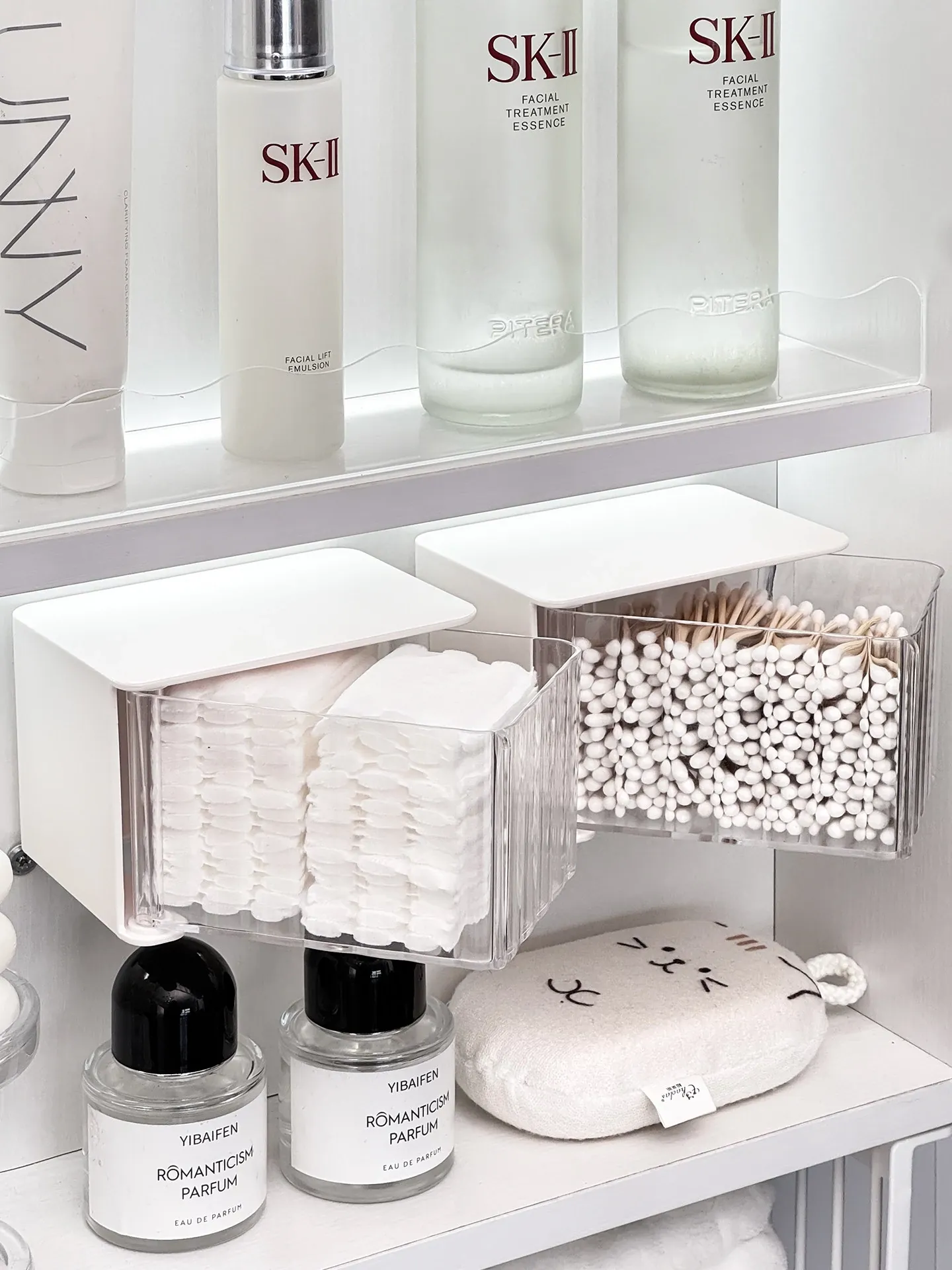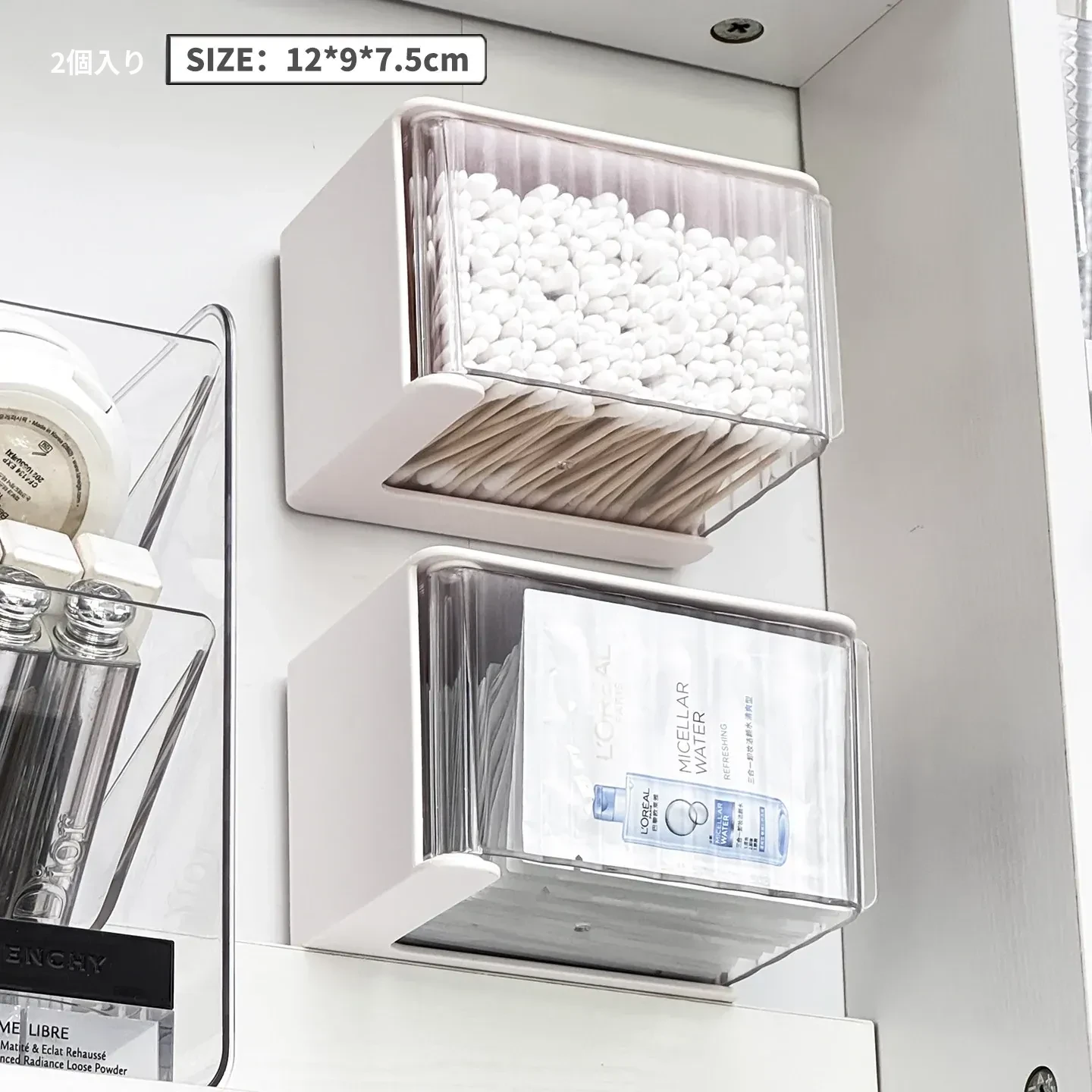 壁掛けメイク用コットン&綿棒収納ボックス - 穴を開けずに取り付け可能!お手入れ簡単で、洗面所のスペースを有効活用。メイク道具をすっきり整理して、毎日のビューティータイムをもっと快適に!
