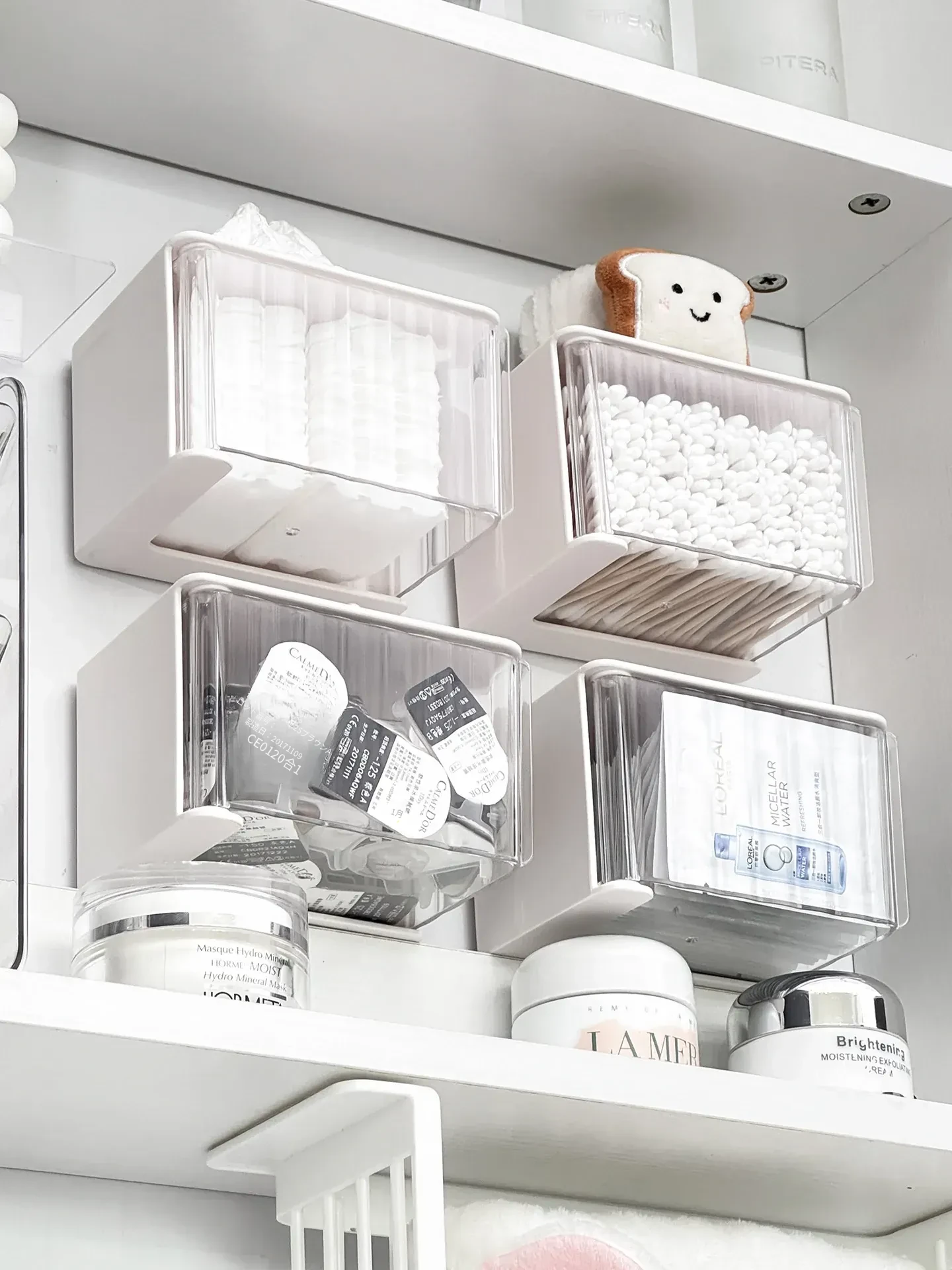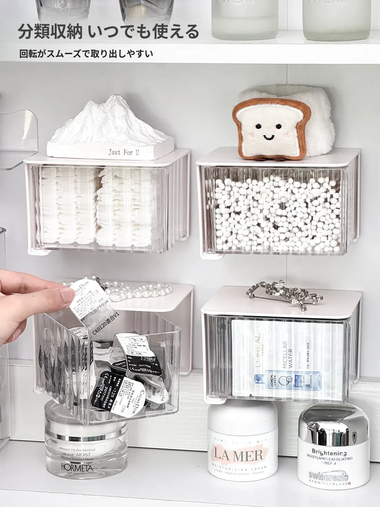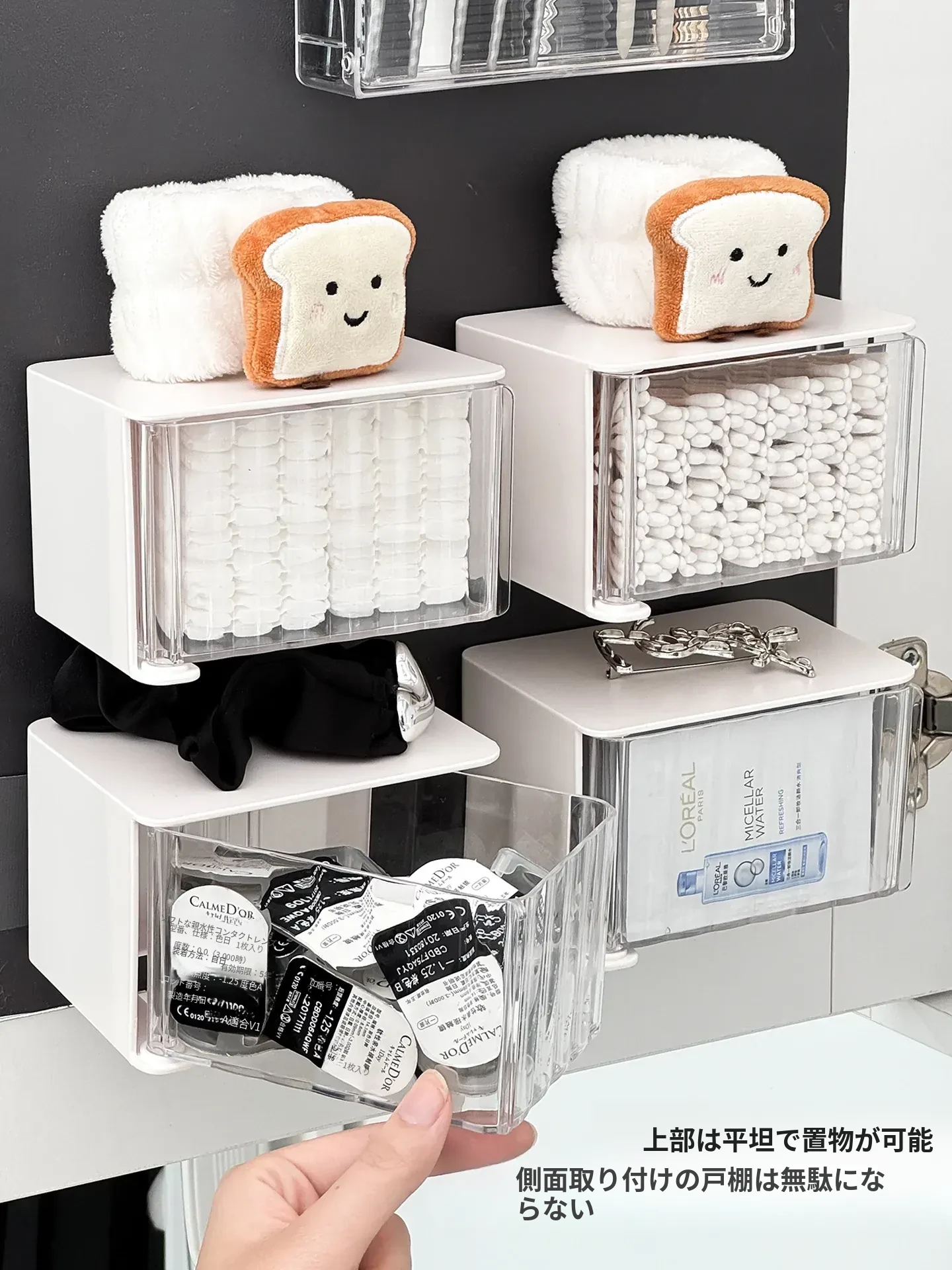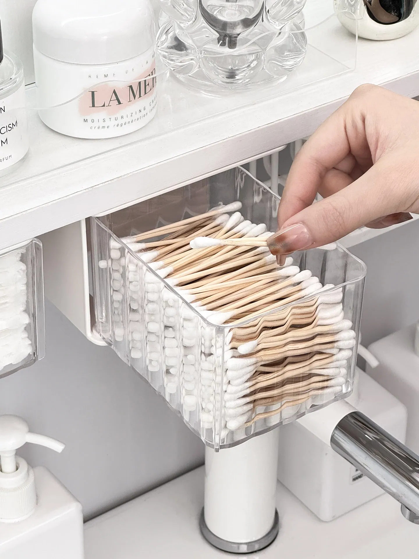 壁掛けメイク用コットン&綿棒収納ボックス - 穴を開けずに取り付け可能!お手入れ簡単で、洗面所のスペースを有効活用。メイク道具をすっきり整理して、毎日のビューティータイムをもっと快適に!