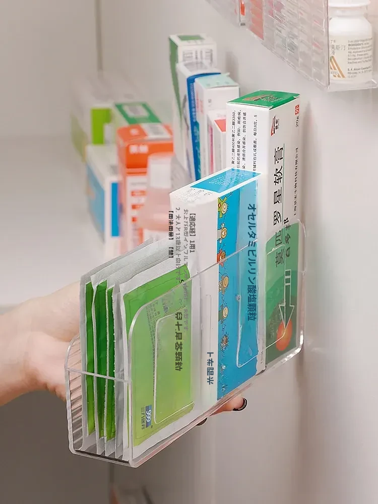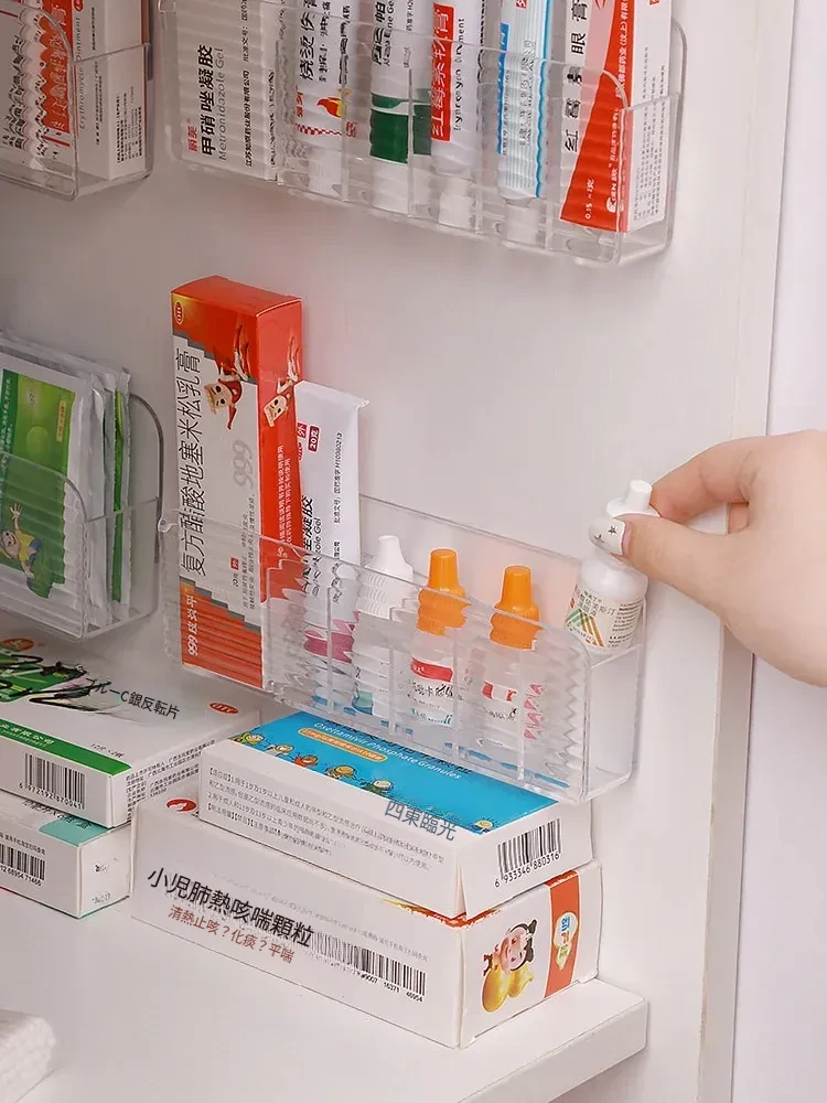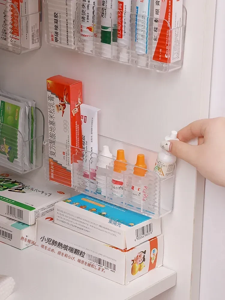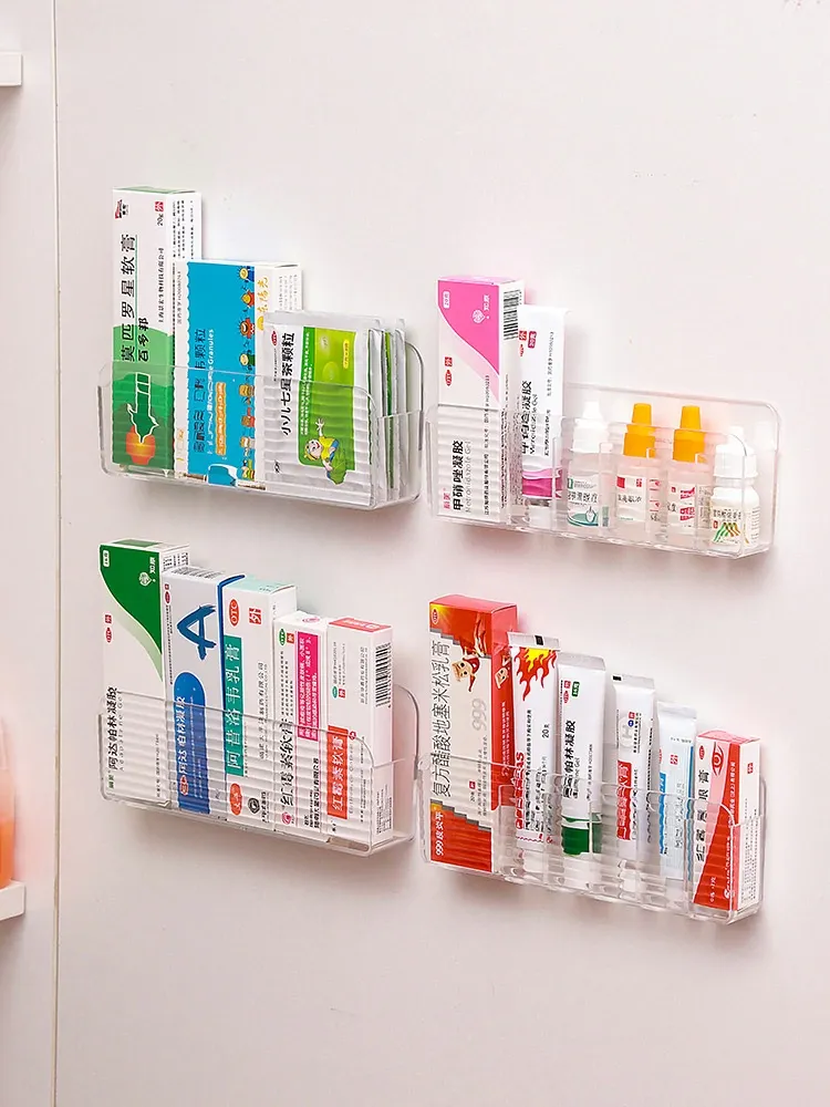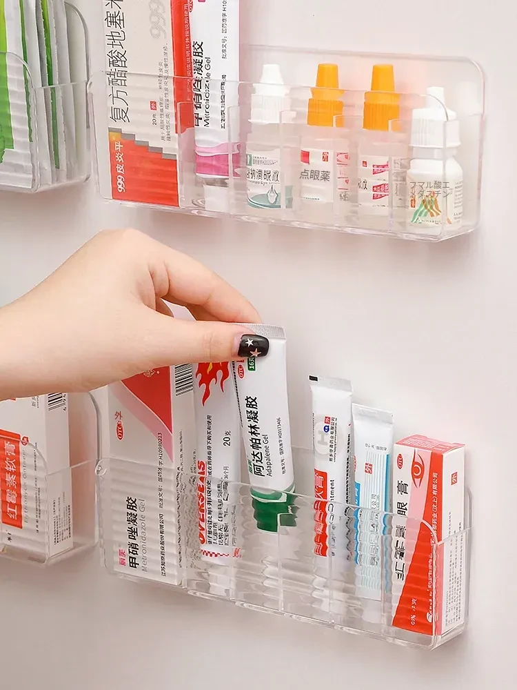 壁掛け薬品収納ボックス - 簡単取り付け、穴あけ不要!透明デザインで目薬や軟膏を整理整頓。家庭用に最適な仕分け棚で、スッキリとしたお部屋を実現!