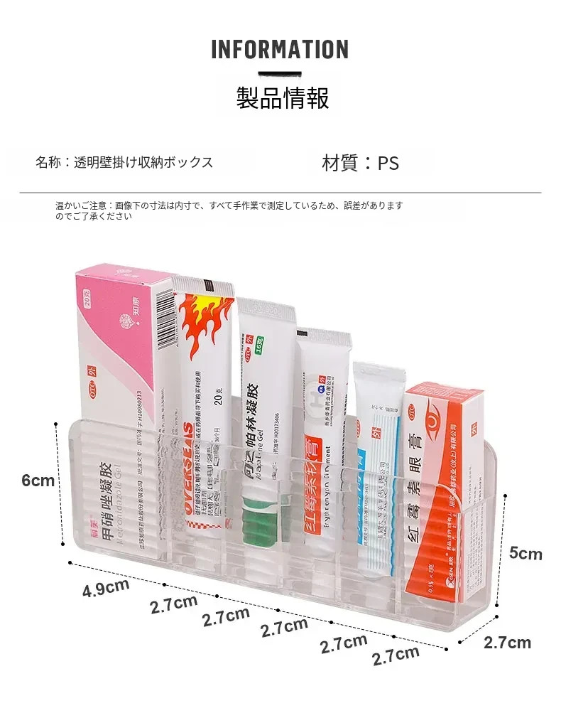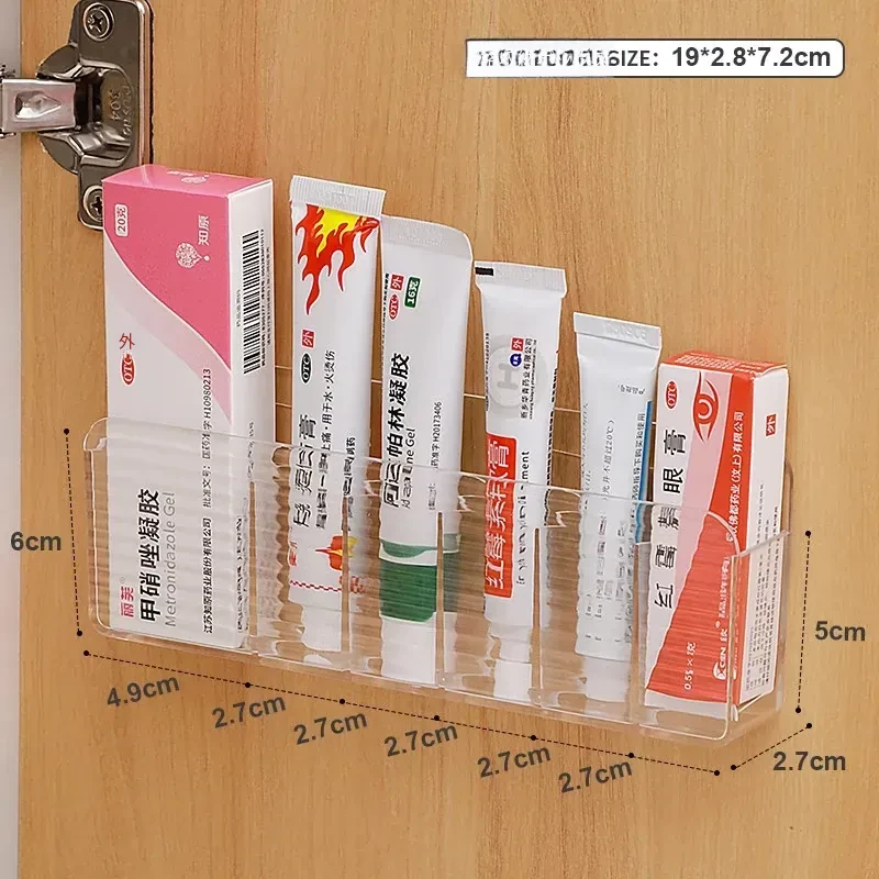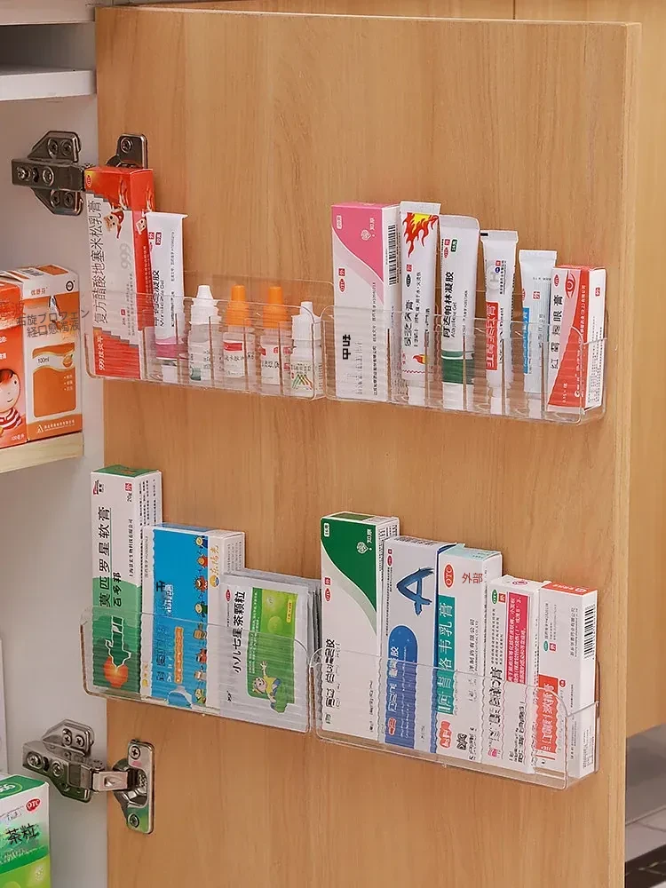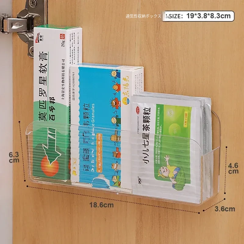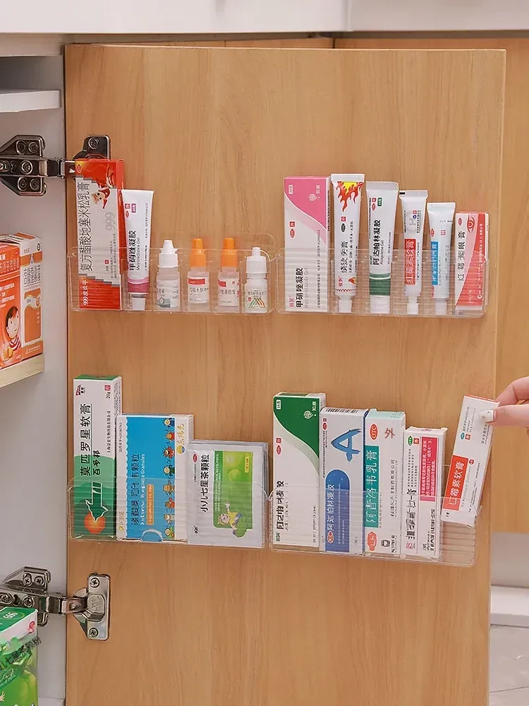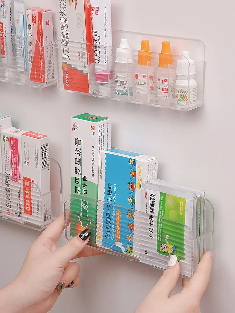 壁掛け薬品収納ボックス - 簡単取り付け、穴あけ不要!透明デザインで目薬や軟膏を整理整頓。家庭用に最適な仕分け棚で、スッキリとしたお部屋を実現!