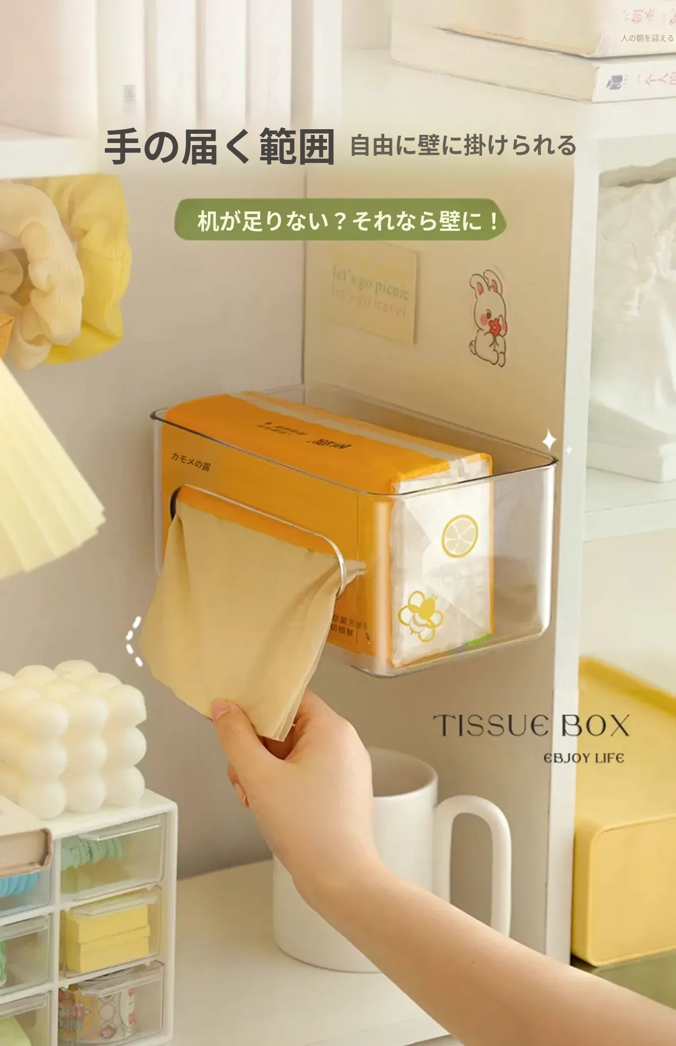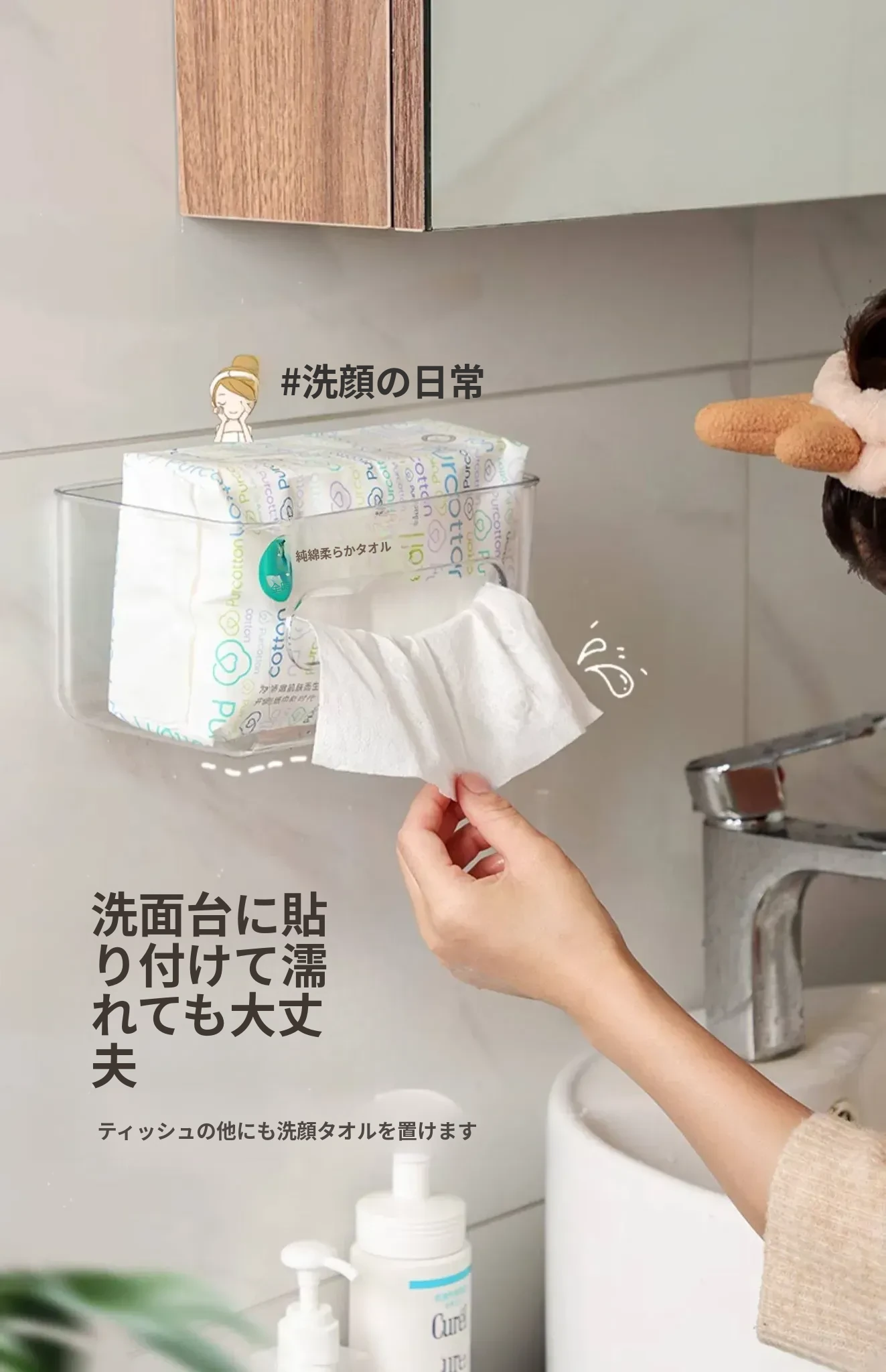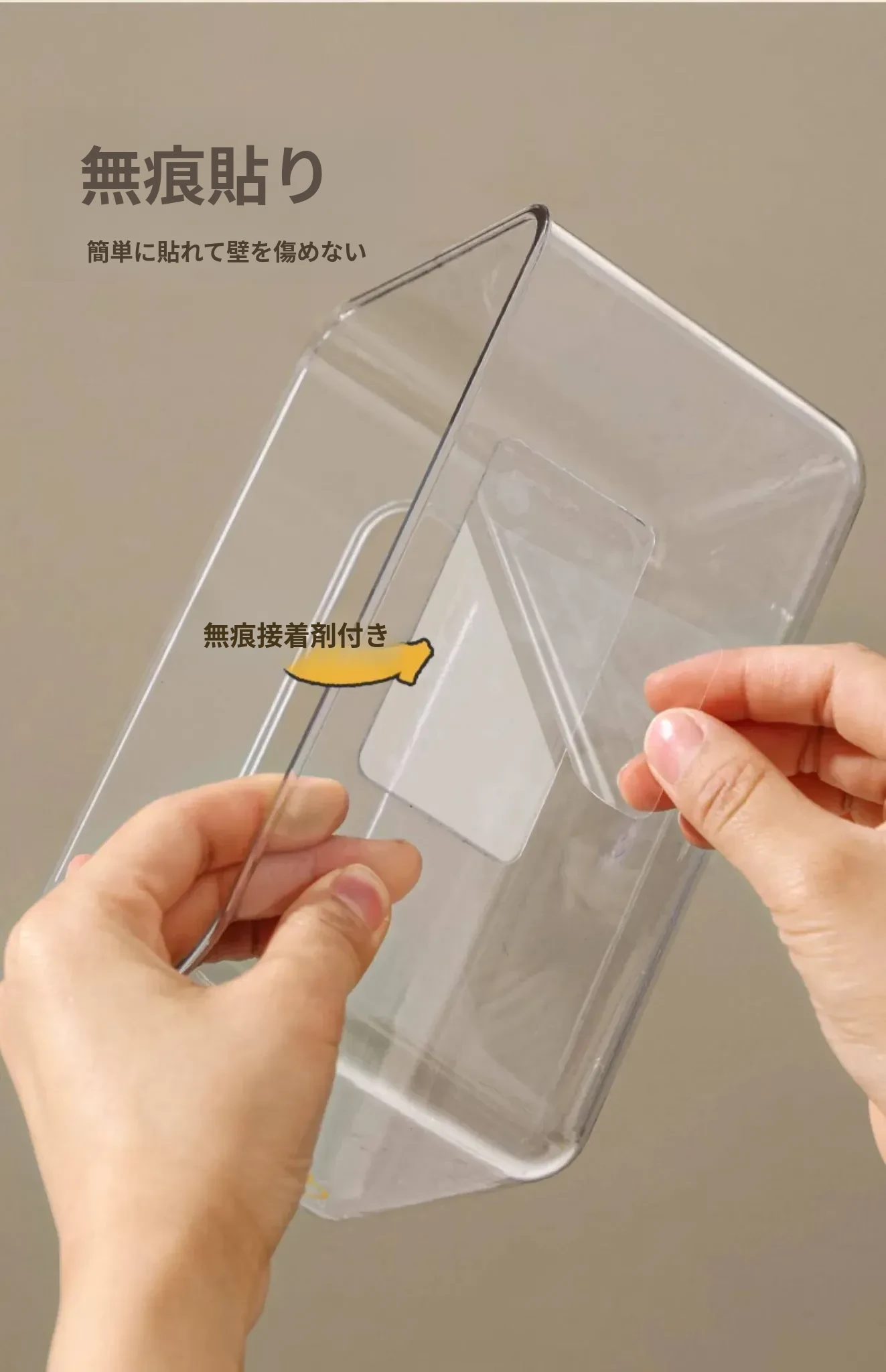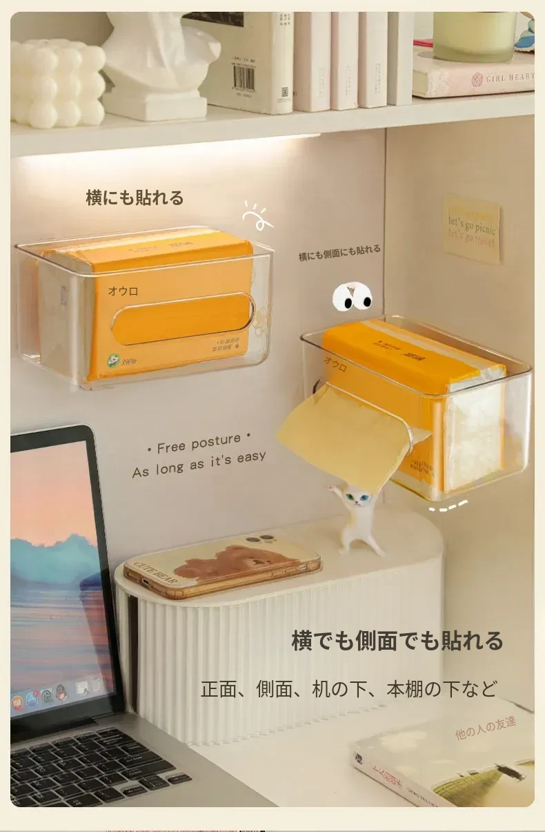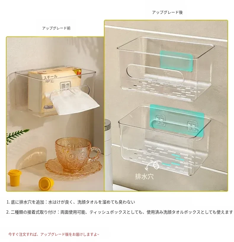 【2個セット-2枚の粘着シート付き】壁掛け式透明ティッシュボックス