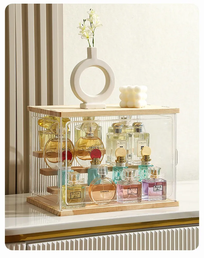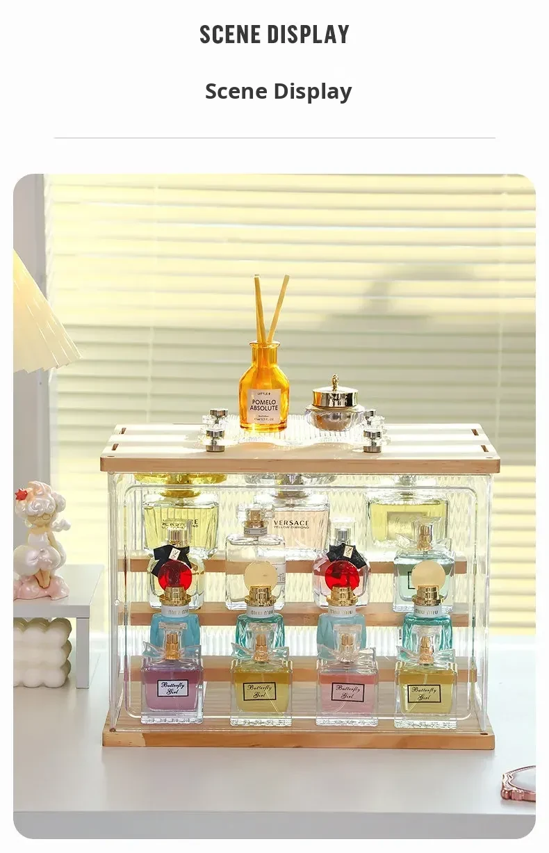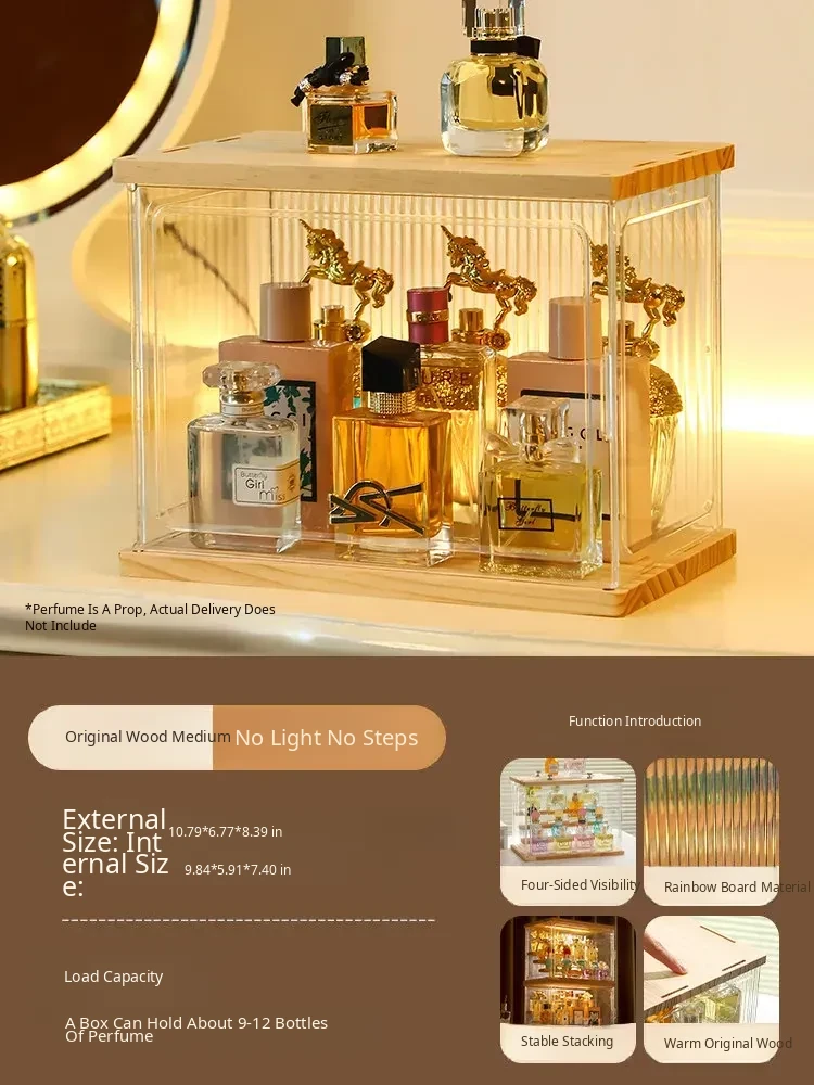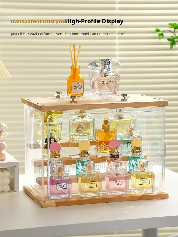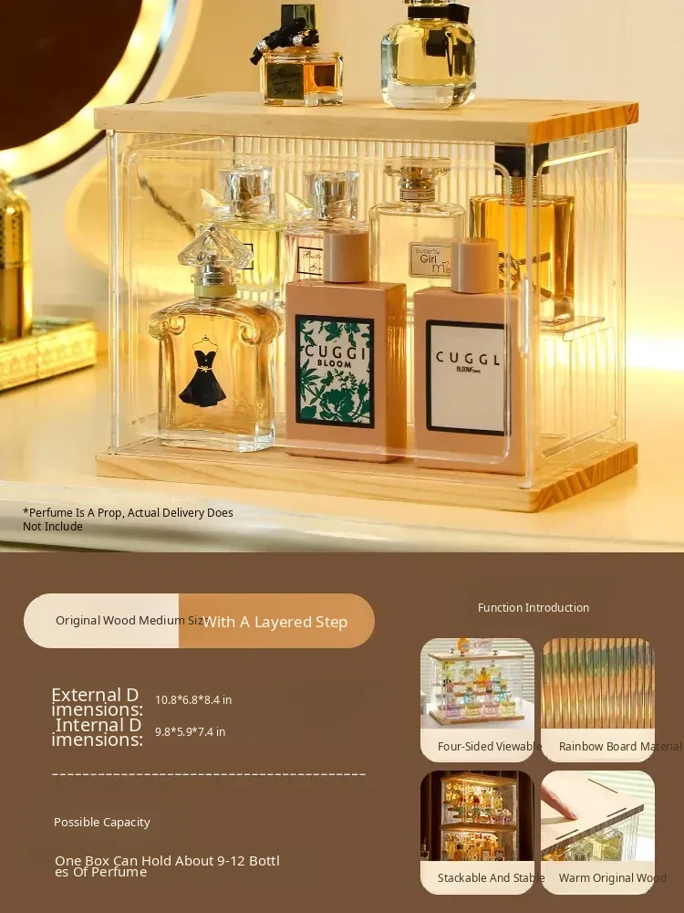 Wooden Perfume Organizer Box - Large Capacity Transparent Makeup Storage with Dustproof Display Rack for Skincare Products - Elegant Desktop Organizer
