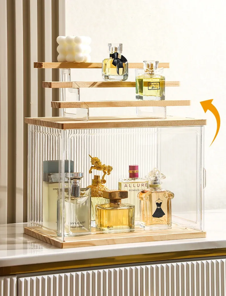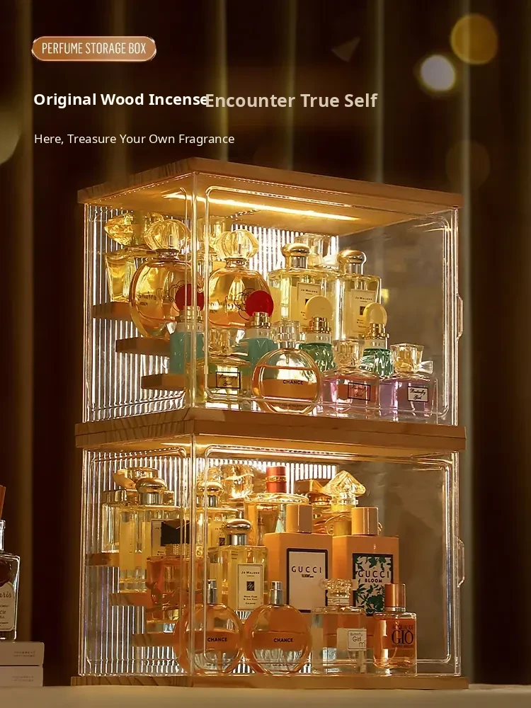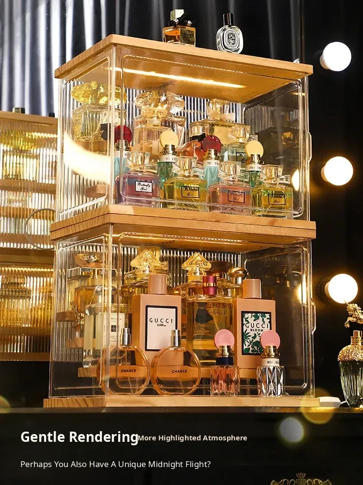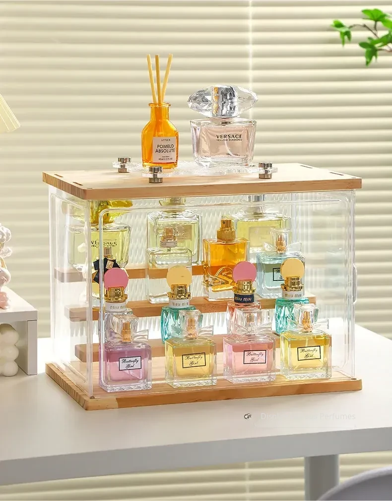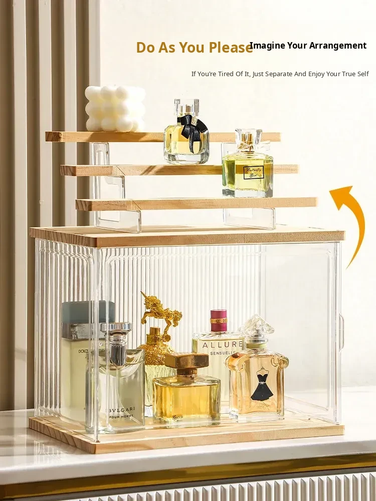 Wooden Perfume Organizer Box - Large Capacity Transparent Makeup Storage with Dustproof Display Rack for Skincare Products - Elegant Desktop Organizer