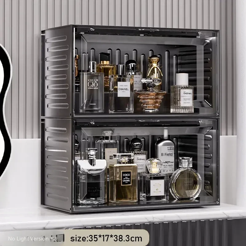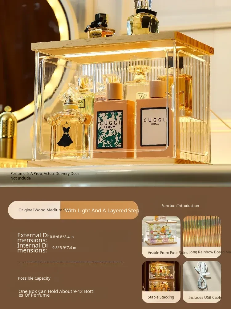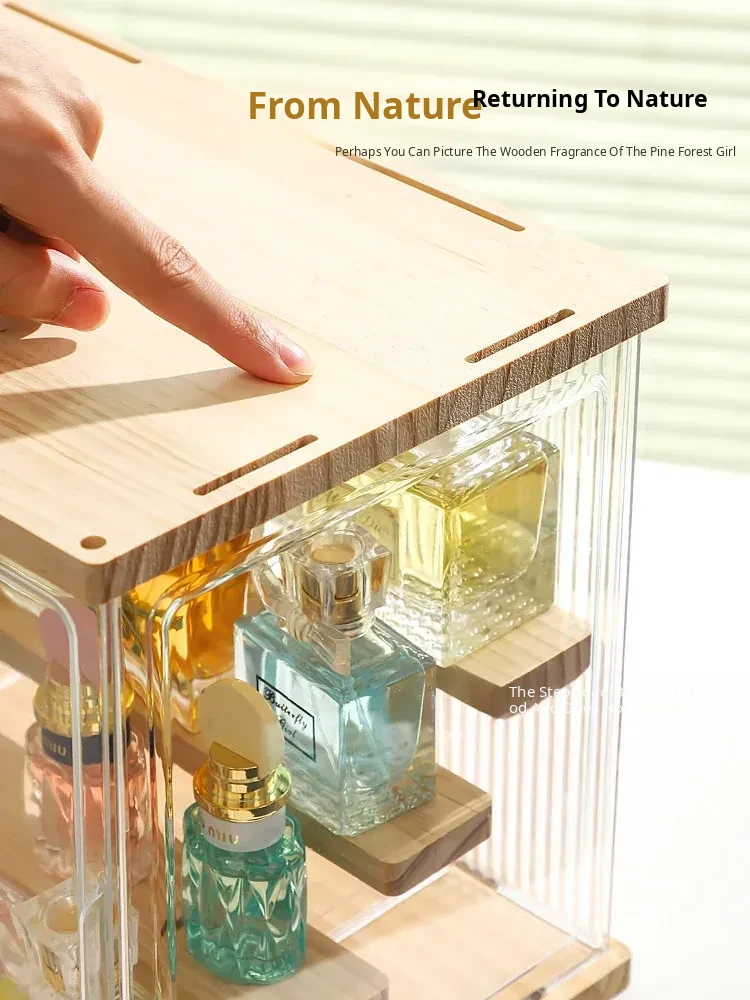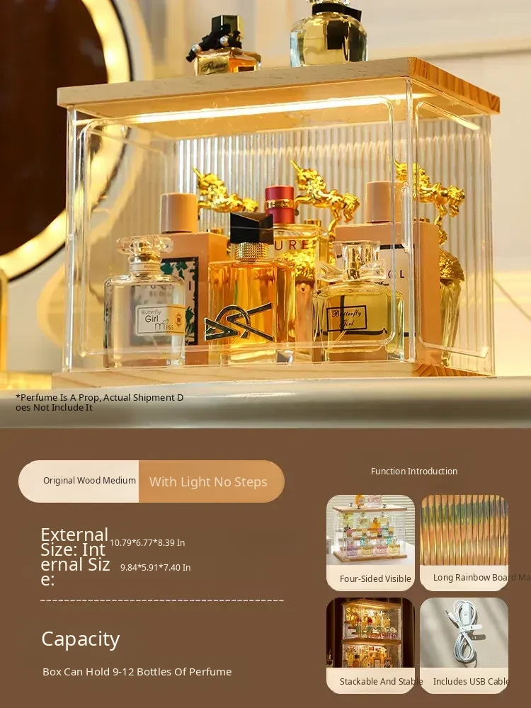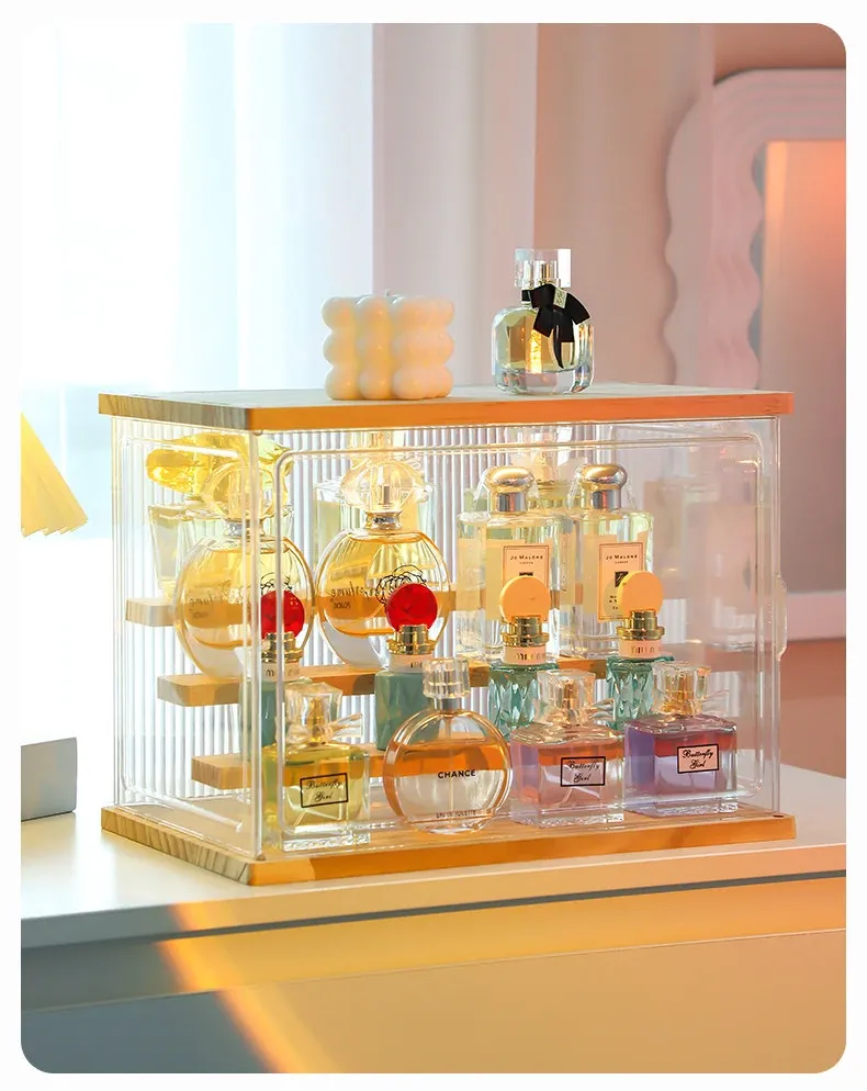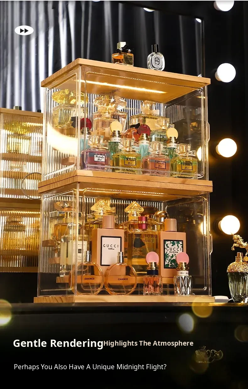 Wooden Perfume Organizer Box - Large Capacity Transparent Makeup Storage with Dustproof Display Rack for Skincare Products - Elegant Desktop Organizer