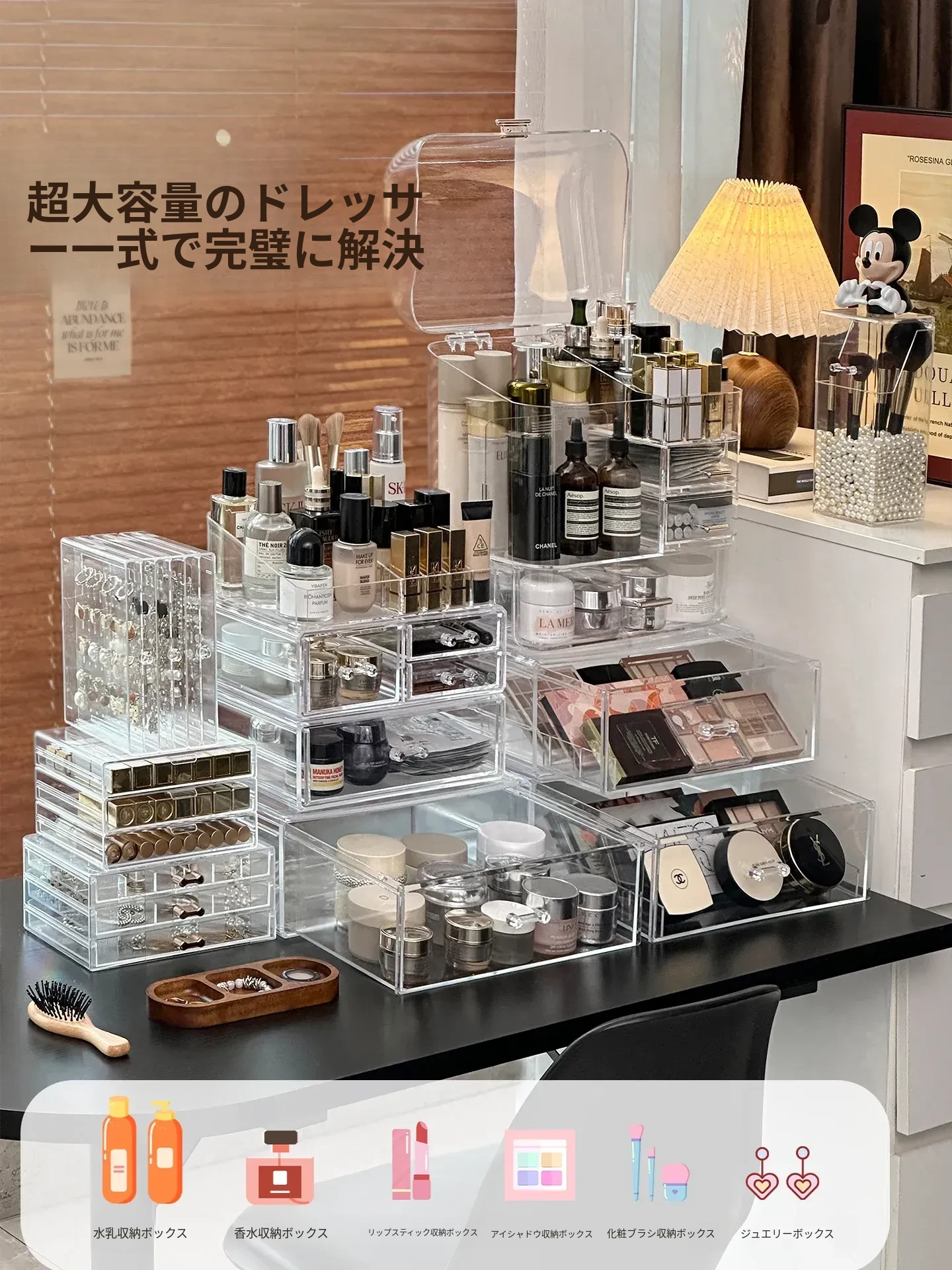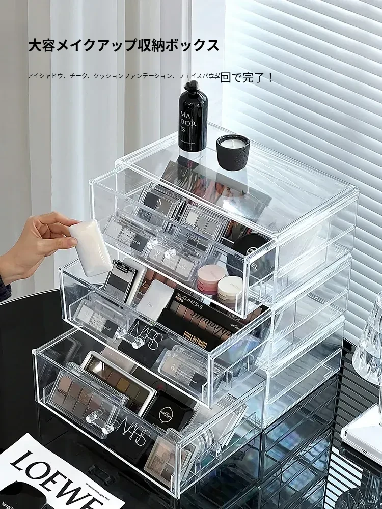 高級感溢れる透明メイクボックス!大容量の化粧品収納ラックで、あなたのコスメをスタイリッシュに整理整頓。美しいドレッサーを演出し、スキンケアも楽々管理できるコンビネーション収納。