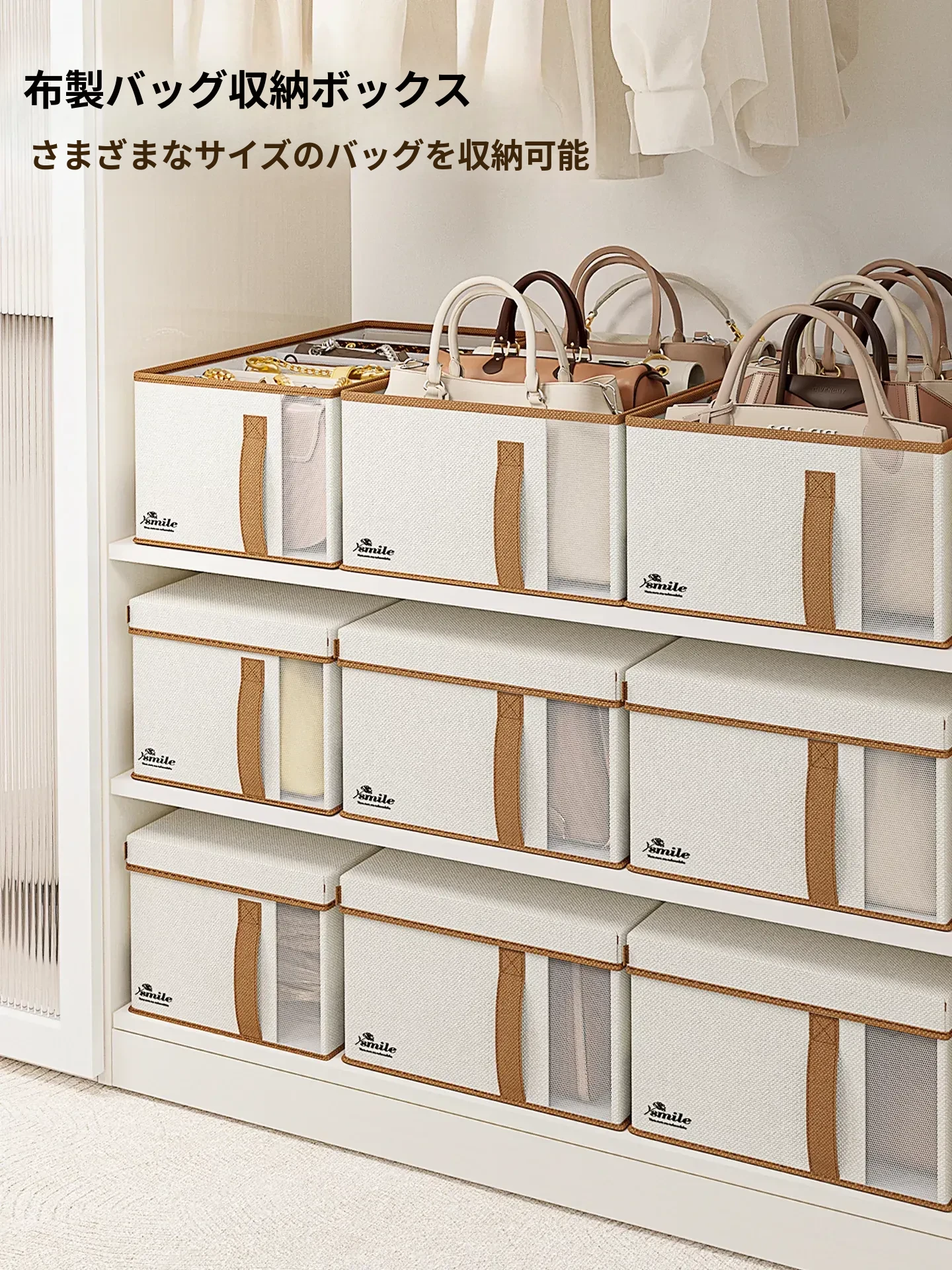 スペースを有効活用!広めのバッグ収納ボックス - 衣類収納や仕切り棚に最適なファブリック収納ラック、バッグスタンド、便利な収納バスケットです。整理整頓が簡単に!
