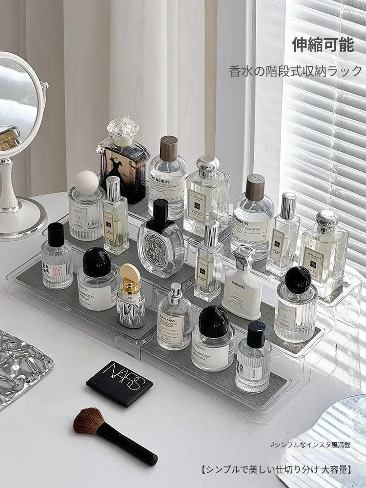 高級感漂う香水置物ラック!階段式デザインで化粧品がすっきり整理できる多層伸縮式コスメ収納ボックス。おしゃれなドレッサーを演出する必須アイテム!