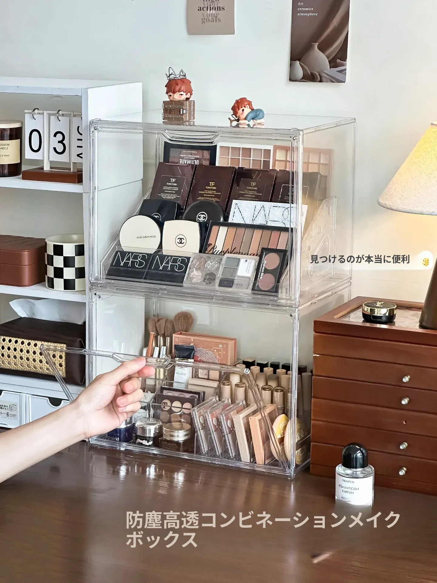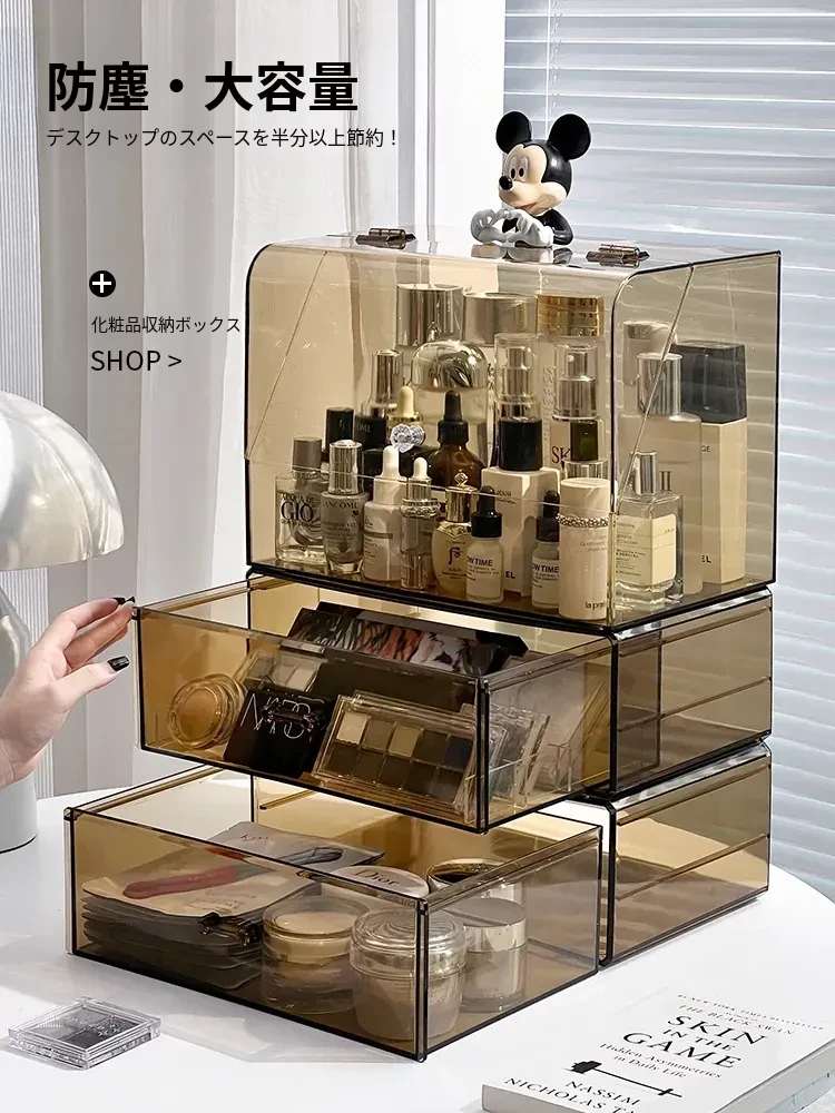 高級感あふれる化粧品収納ボックス|デスク上のほこりを防ぎ、大容量でスキンケア用品をすっきり整理!化粧台や口紅の整理に最適な収納ラックです。