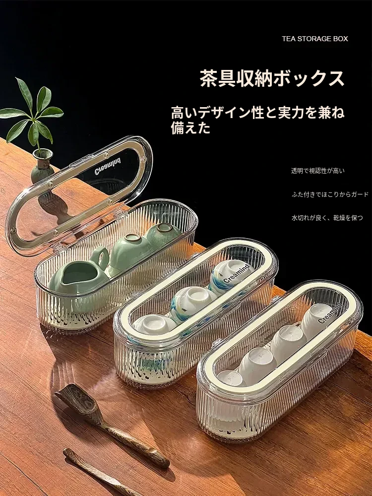 透明防塵茶具収納ボックス - おしゃれで機能的なフタ付き、功夫茶杯や茶壺をスッキリ整理!水切り機能付きで清潔さを保ち、あなたの茶道をより一層楽しむための必須アイテムです。