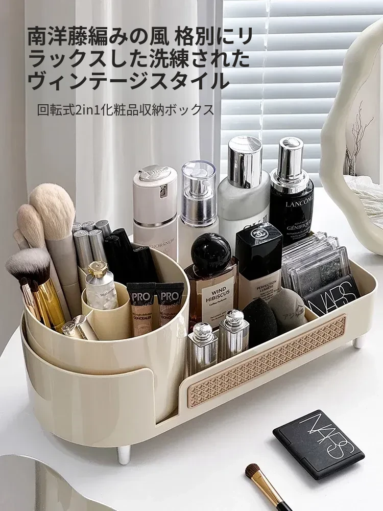 藤編風の化粧品収納ボックス - 回転式アイブロウペン・メイクブラシスタンド付き!大容量でドレッサーや香水・口紅の整理も楽々。美しいインテリアにもピッタリ!