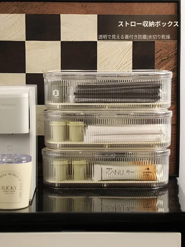 デスク周りをスッキリ整理!防塵のストレージボックス付き、使い捨てストロー&スプーン収納ケース。オフィスやカフェ、ティールームに最適なコーヒーかき混ぜ棒も収納可能!