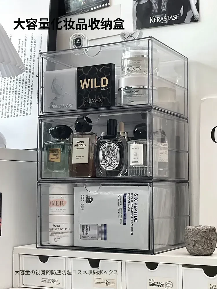デスクトップ化粧品収納ボックス 透明アクリル製 マスク収納引き出し 防塵パフューム&アイシャドウパレット整理ラック - おしゃれで機能的、あなたのメイクアップスペースをスッキリ整理!