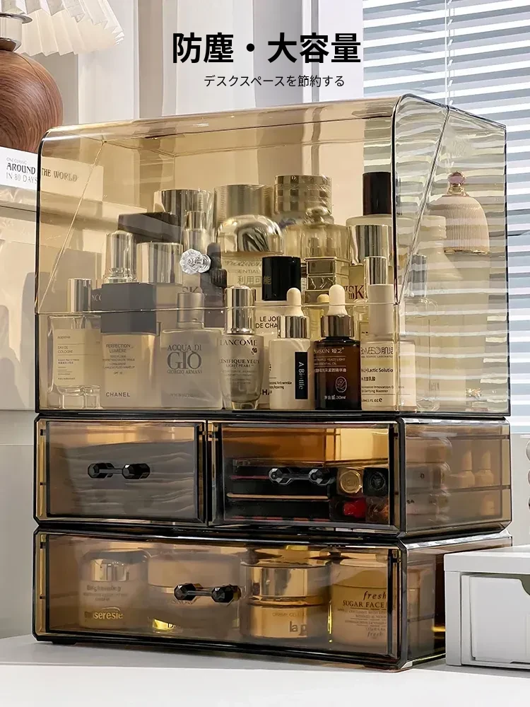 高級感溢れるドレッサー用化粧品収納ボックス!デスクトップの防塵設計で、美容製品をしっかり整理。口紅や香水もスッキリ収納できる、スタイリッシュな置物ラックです。おしゃれで機能的なアイテムを手に入れましょう!