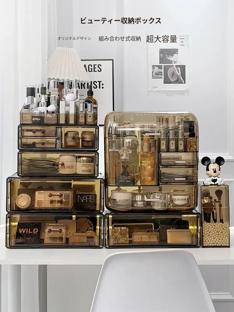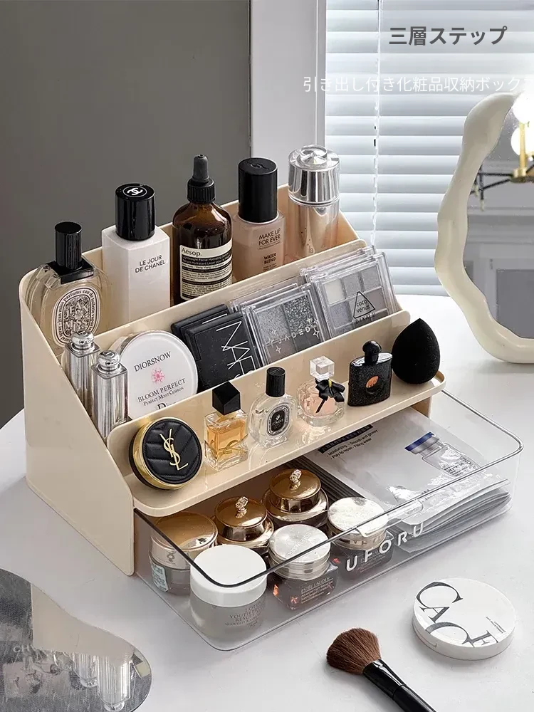 高級感あふれるデスク用化粧品収納ボックス!階段型パウダー・アイシャドウスタンド、引き出し付きでスキンケアアイテムもすっきり整理。美しさを引き立てるおしゃれな収納アイテム!