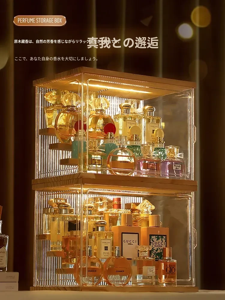木製香水収納ボックス 透明化粧ボックス 防塵 大容量ディスプレイラック スキンケア整理キャビネット - おしゃれで機能的、あなたの美容アイテムを美しく保ちます!