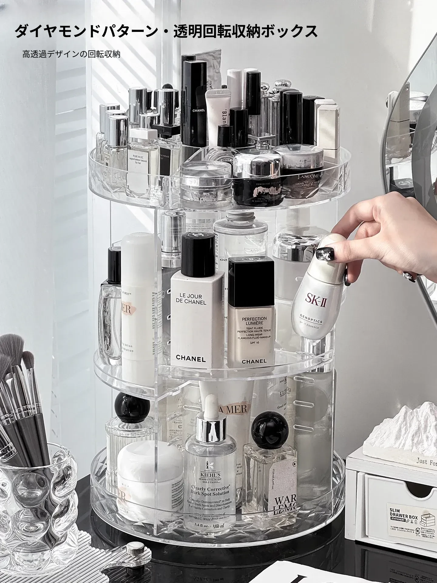 回転式デスクトップコスメ収納ボックス - 高級感あふれる化粧台!透明デザインで口紅や香水をすっきり整理、スキンケア用品も簡単アクセス。美しさを引き立てる必須アイテム!
